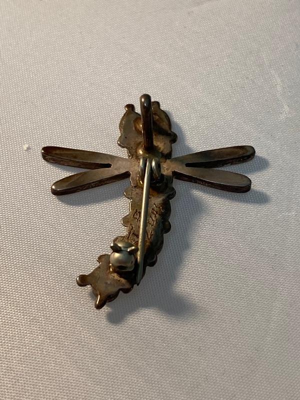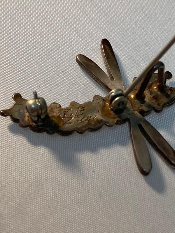 Native American Zuni Signed Dragonfly Pin Pendant Silver & Inlaid Stone