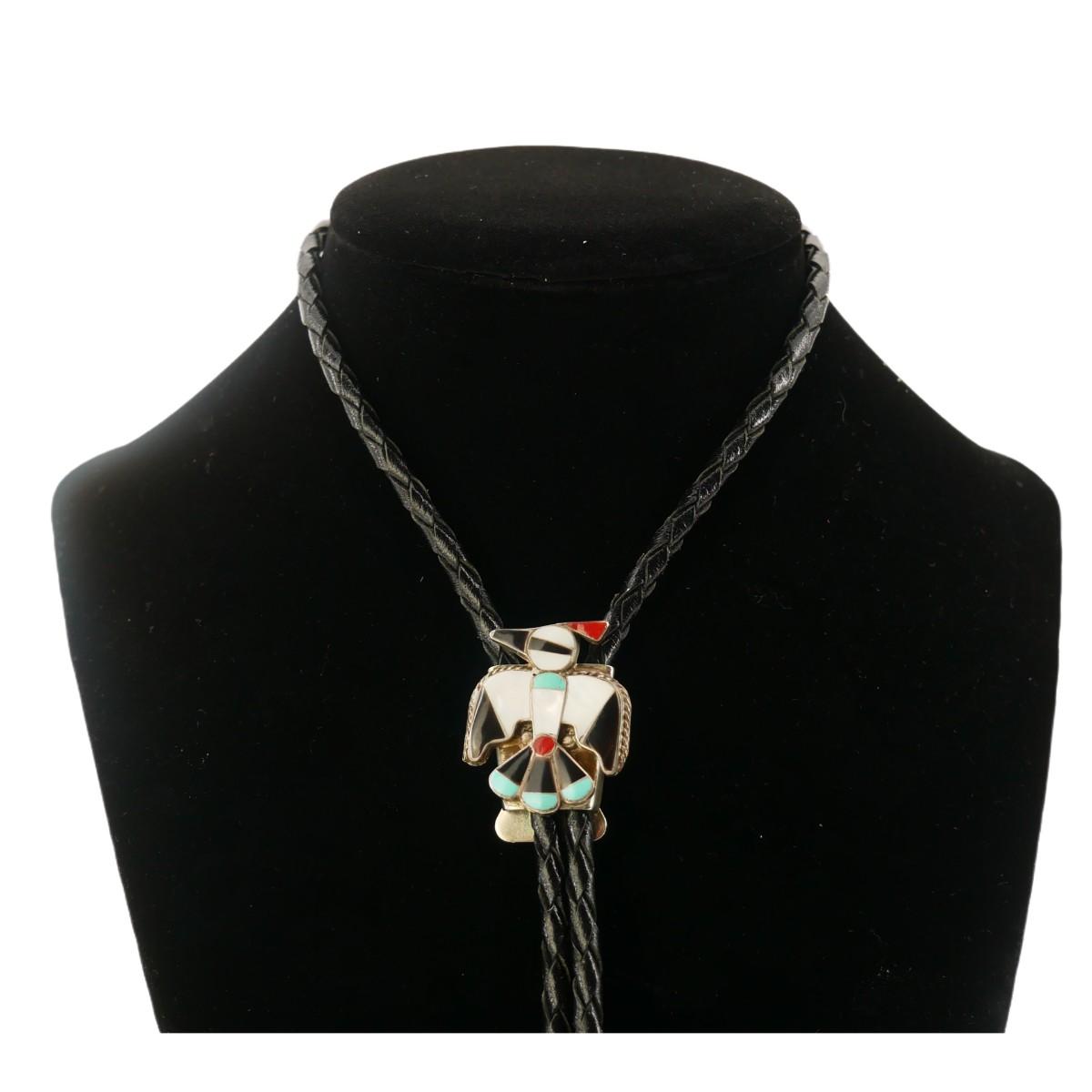 Vintage Zuni thunderbird bolo tie set with mother of pearl and natural stone inlays. Braided cord necklace with sterling silver tips. Measures 18.5" in length and weighs 0.6 oz. (J1)