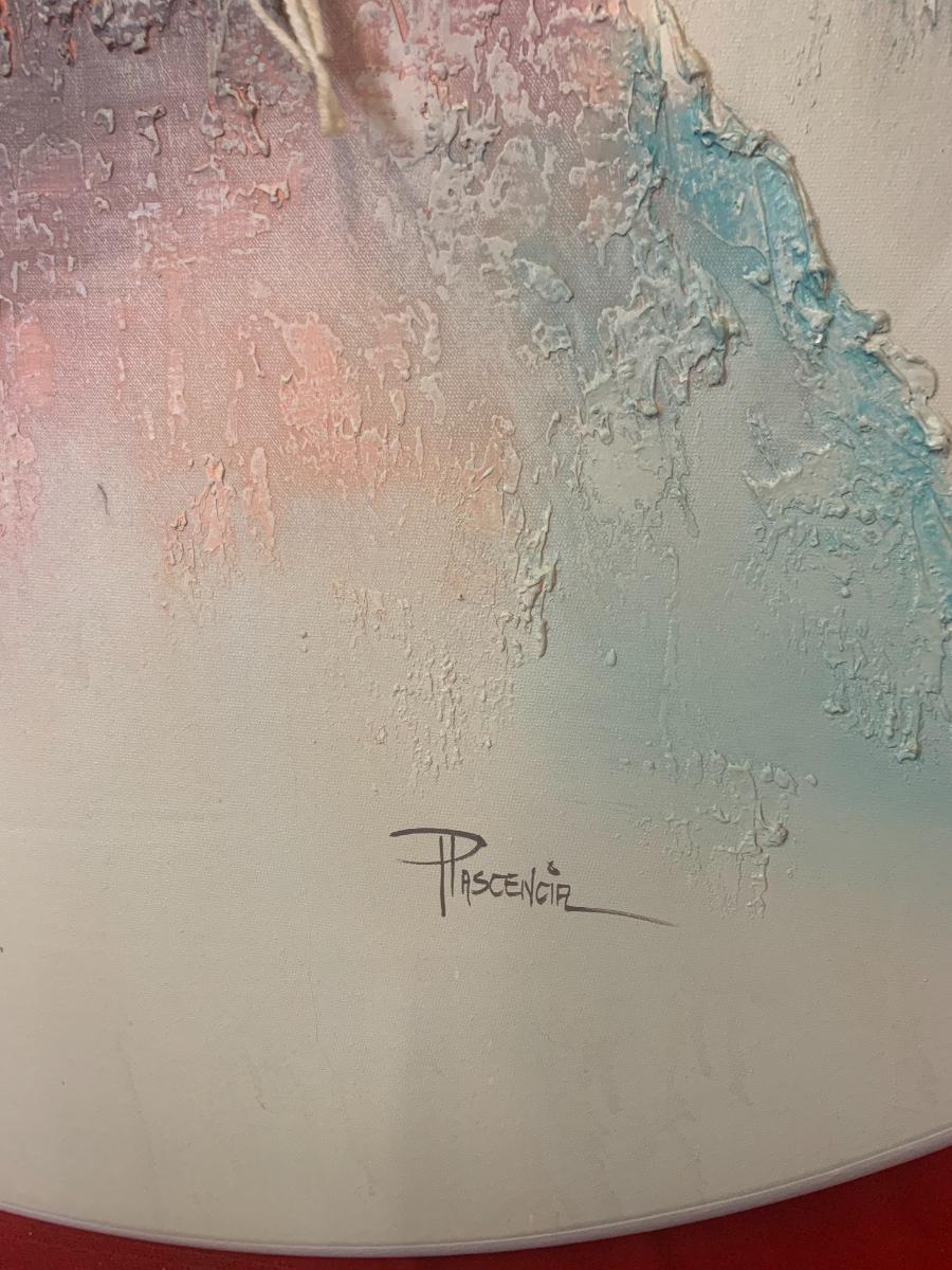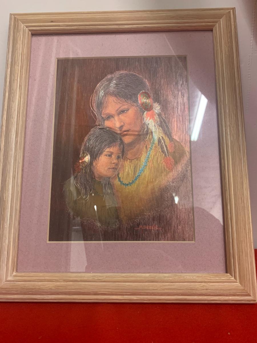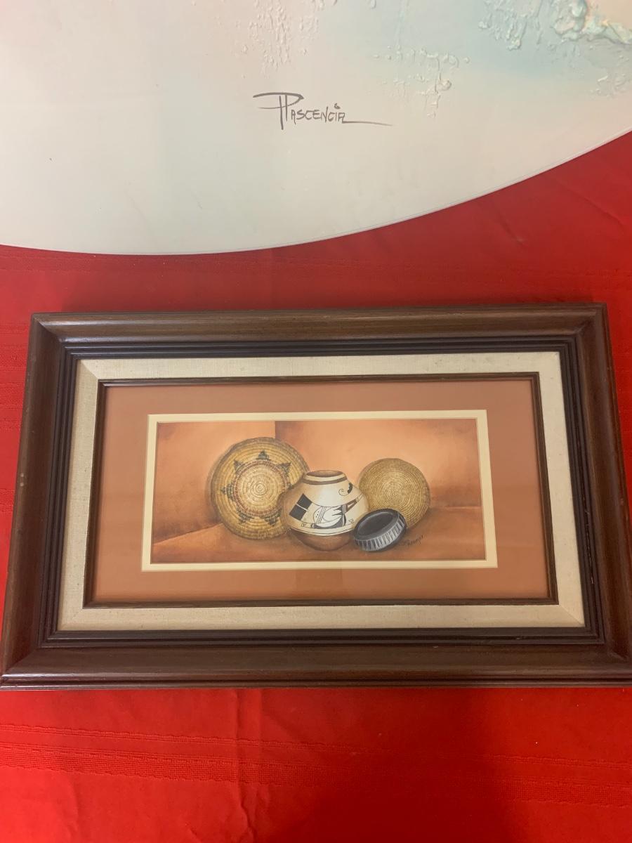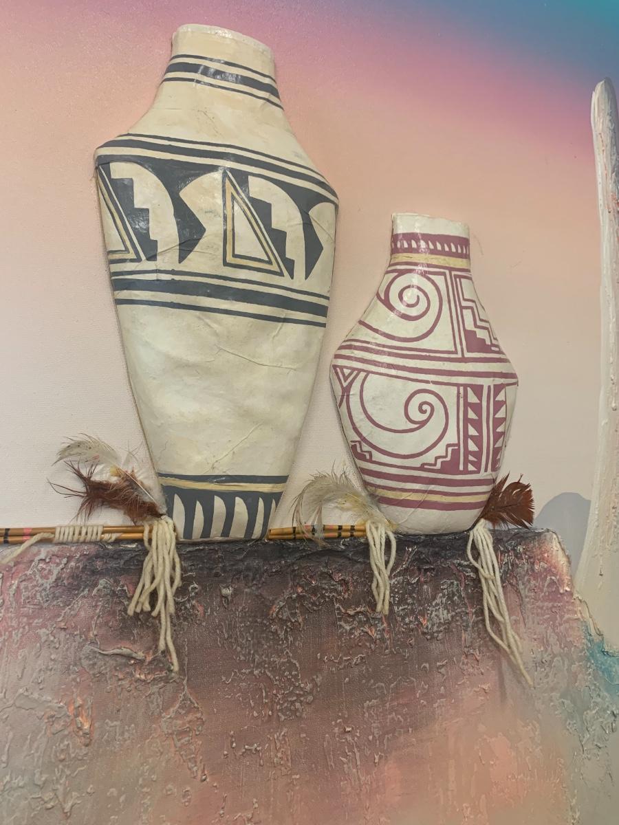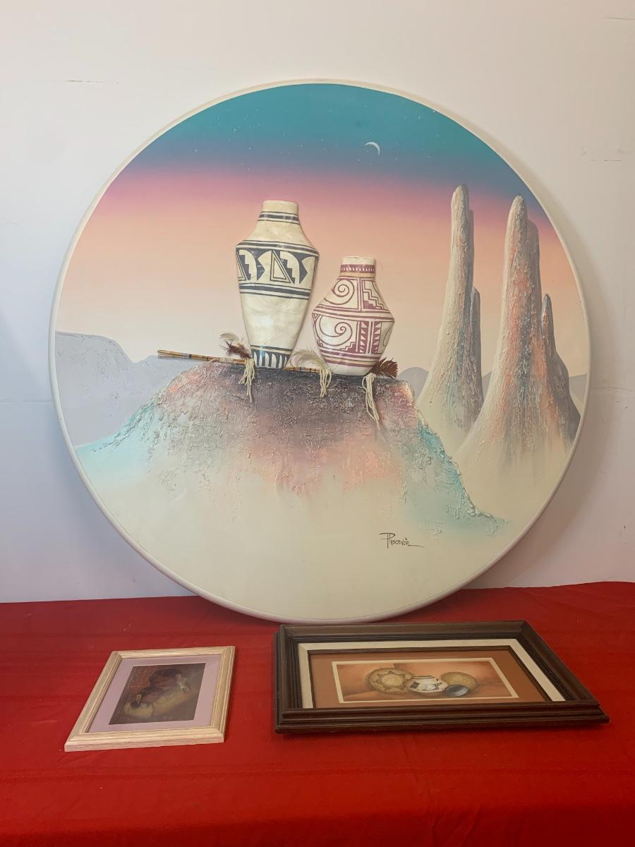 Native American Art including 1 giant circular art piece is 3D Art (47” Diameter), medium painting of pots (21.5”x13.5”), Small painting of two women (12” x 10”)