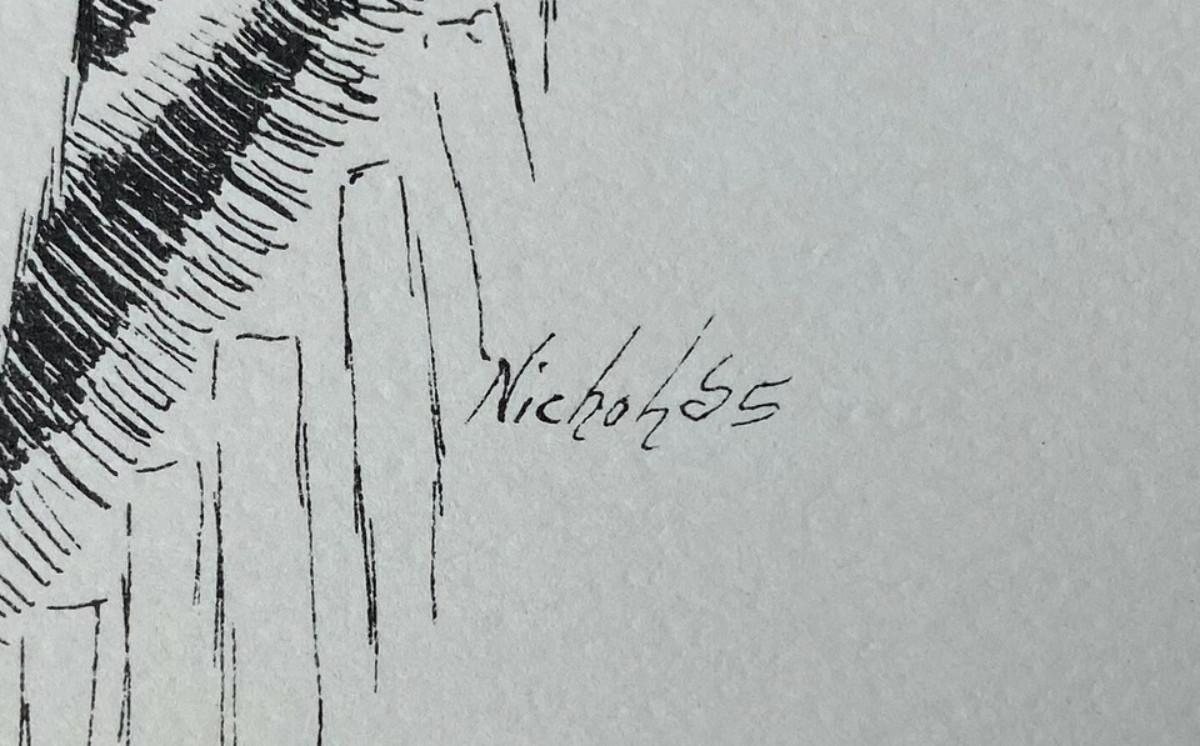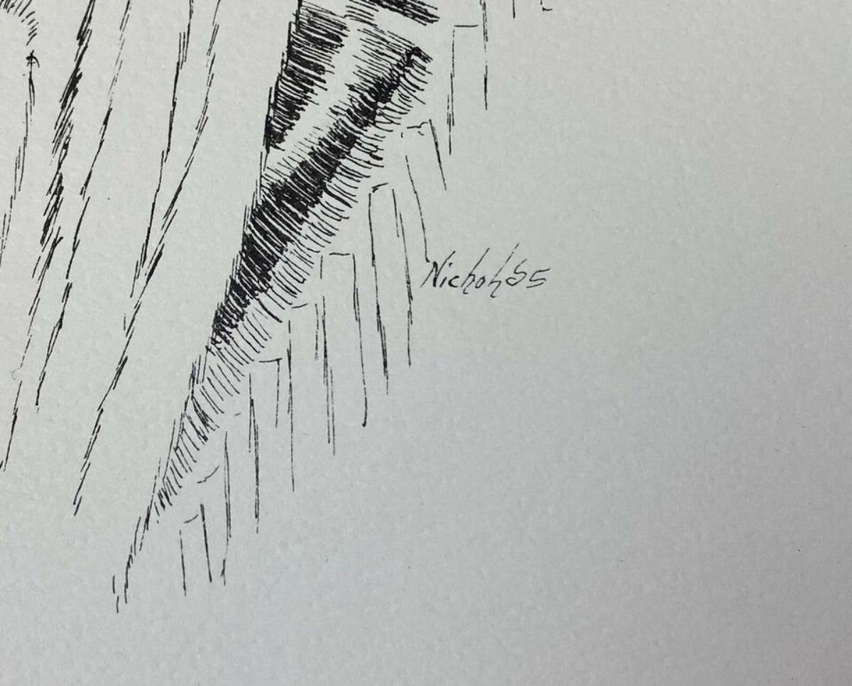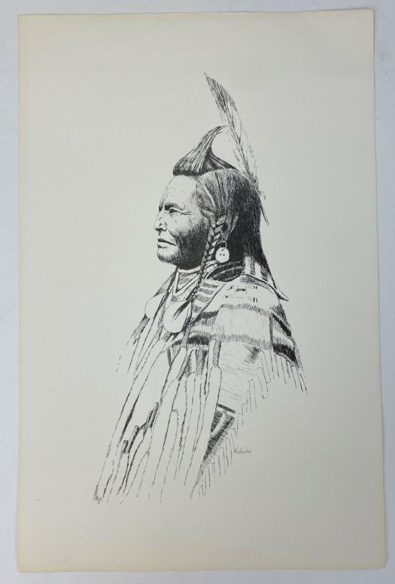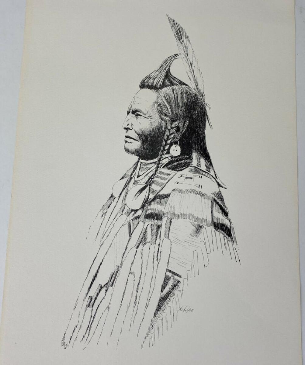 vintage print we came across at a recent estate in Utah...by Oneida/Cree artist Daniel D. Nicholas (b- 1949) Canadian I believe...1970's..a sketch of Shot in the Hand an Apsaroke(Crow Warrior)..a Northern Plains Nation..Probably taken from the 1908 Edward Curtis photo...Good condition on this 17 x 11" print.