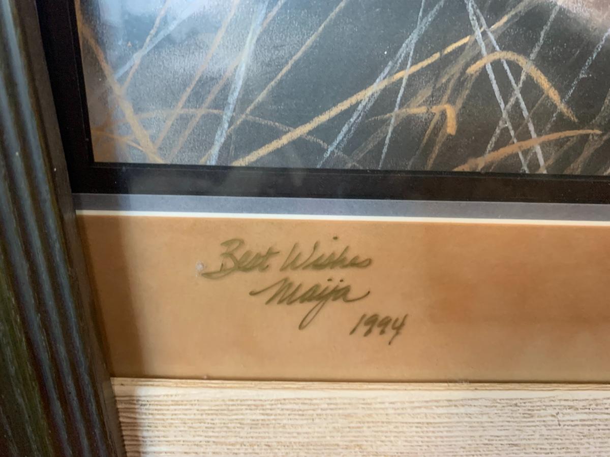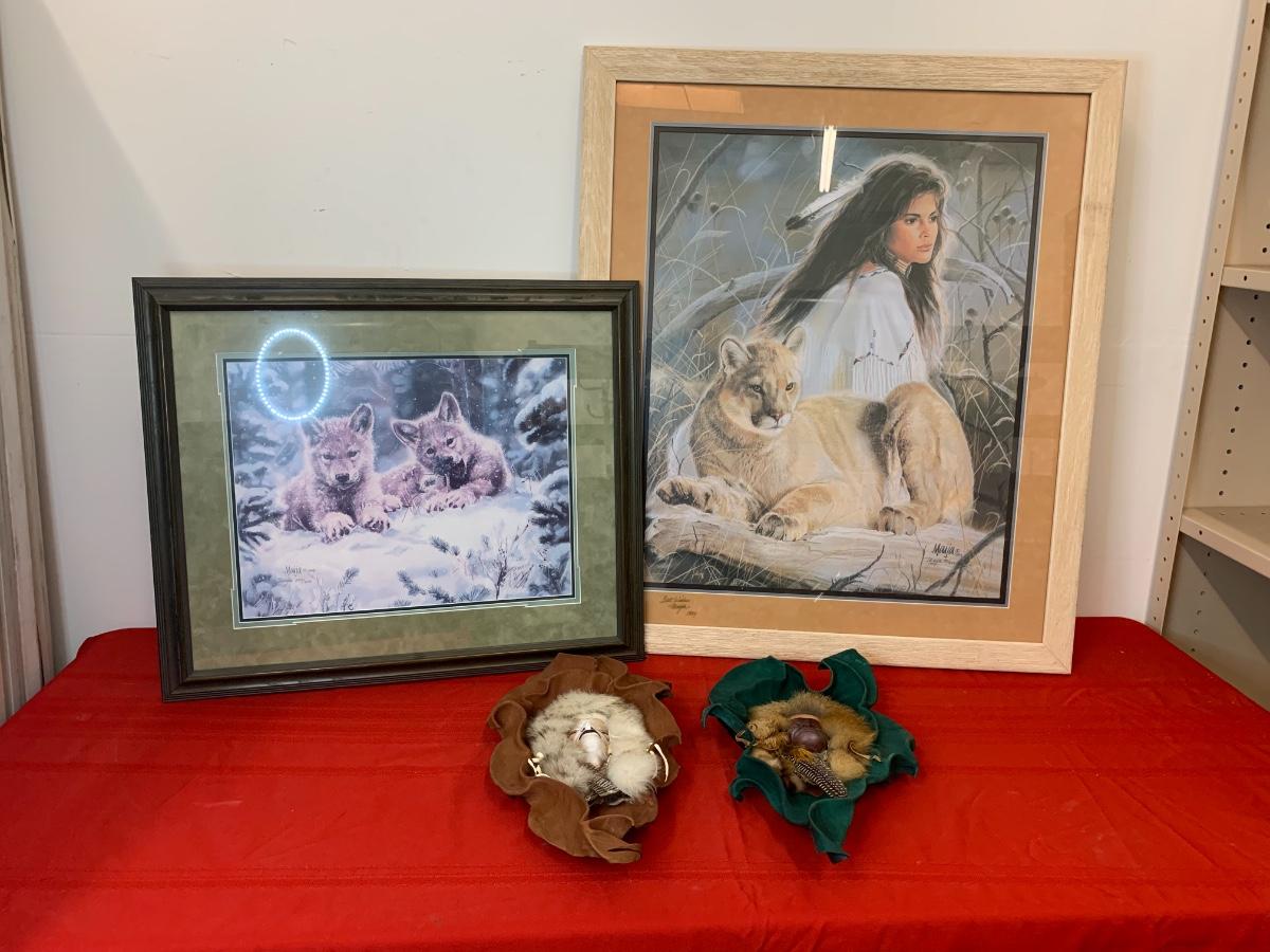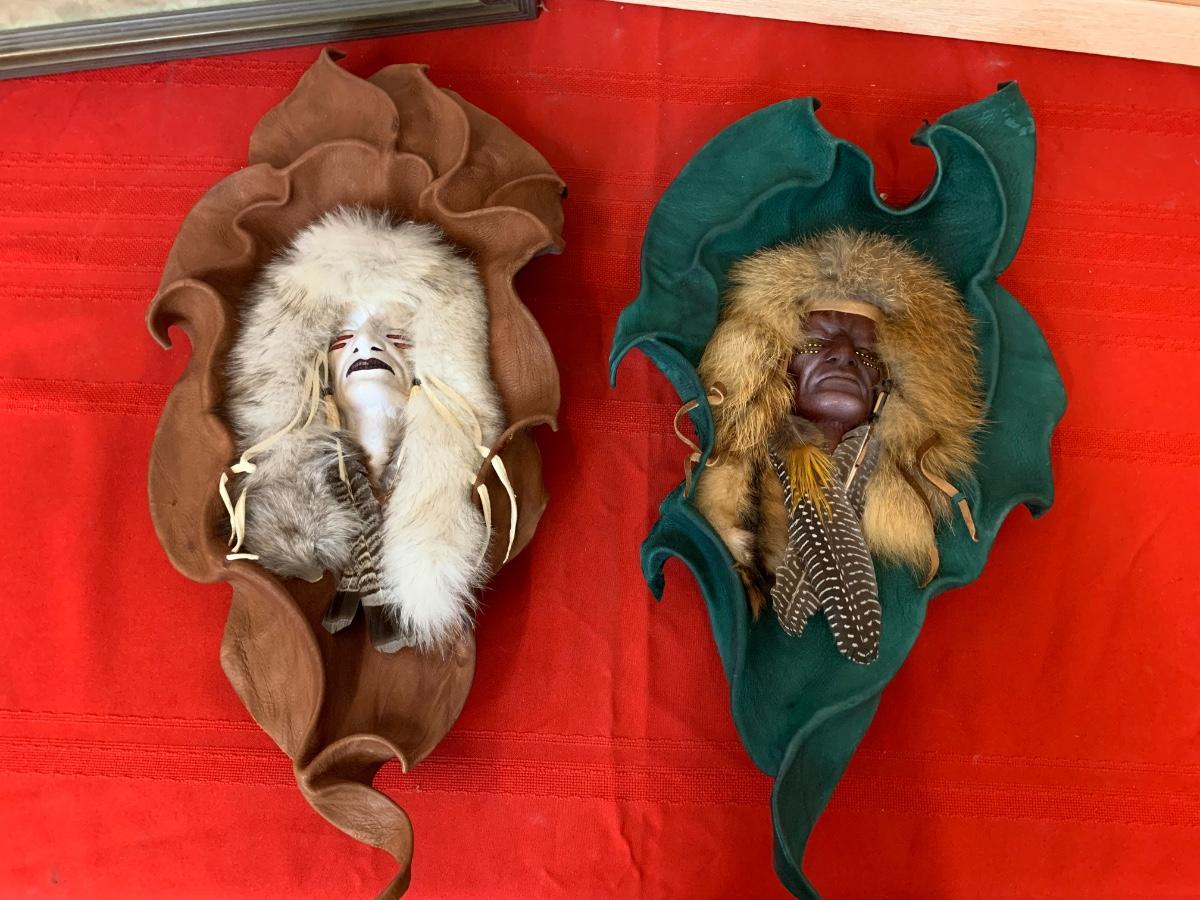 2 paintings by Maija both in excellent condition. (Larger print of woman is signed and dated. Also signed again a year later by Maija stating, “Best wishes.” Height= 37 inches, Length= 32 inches) (small picture, Height= 2 feet, length= 28 inches) Two wall hanging decor pieces depicting Native American men surrounded by rawhide both in excellent condition. (Brown one, 21 inches in length, 9 1/2 inches in width) (Turquoise one, 21 inches in length, 11 inches in width)