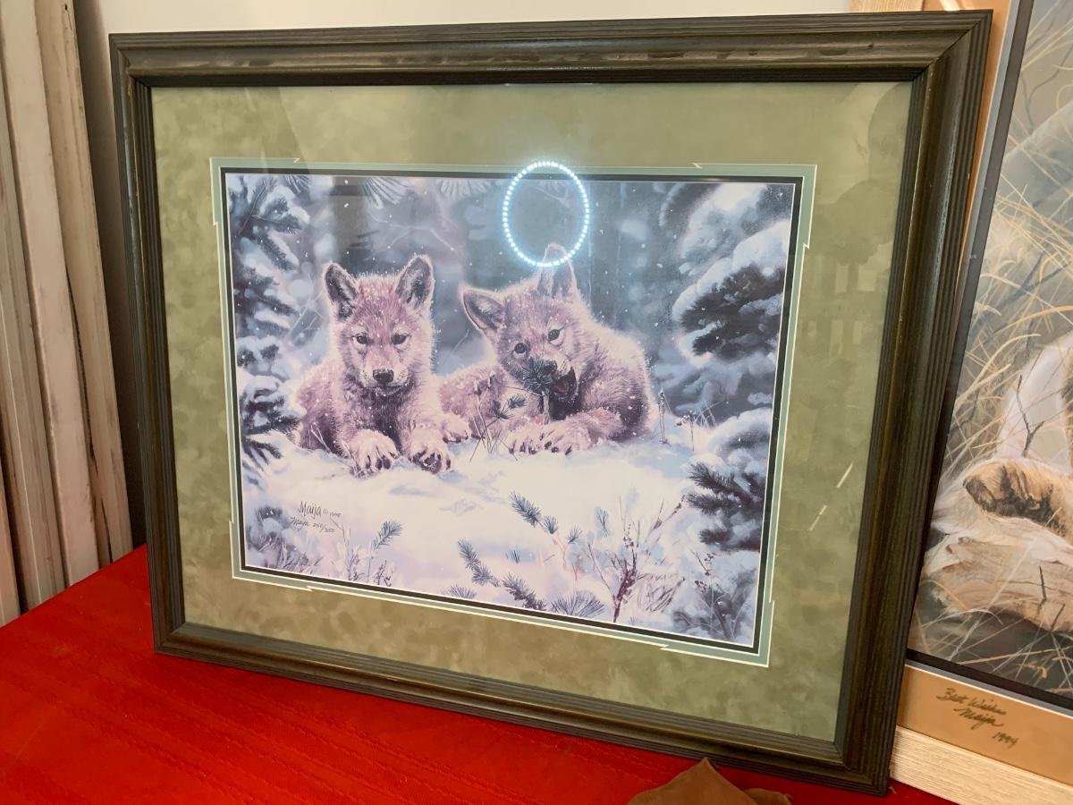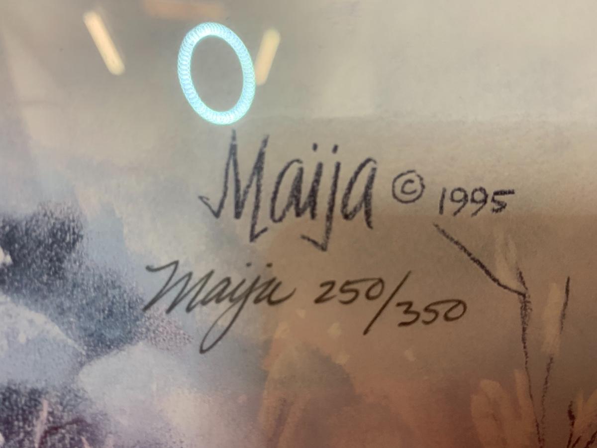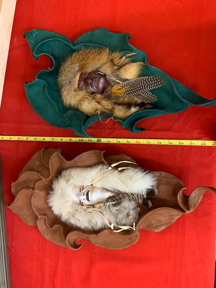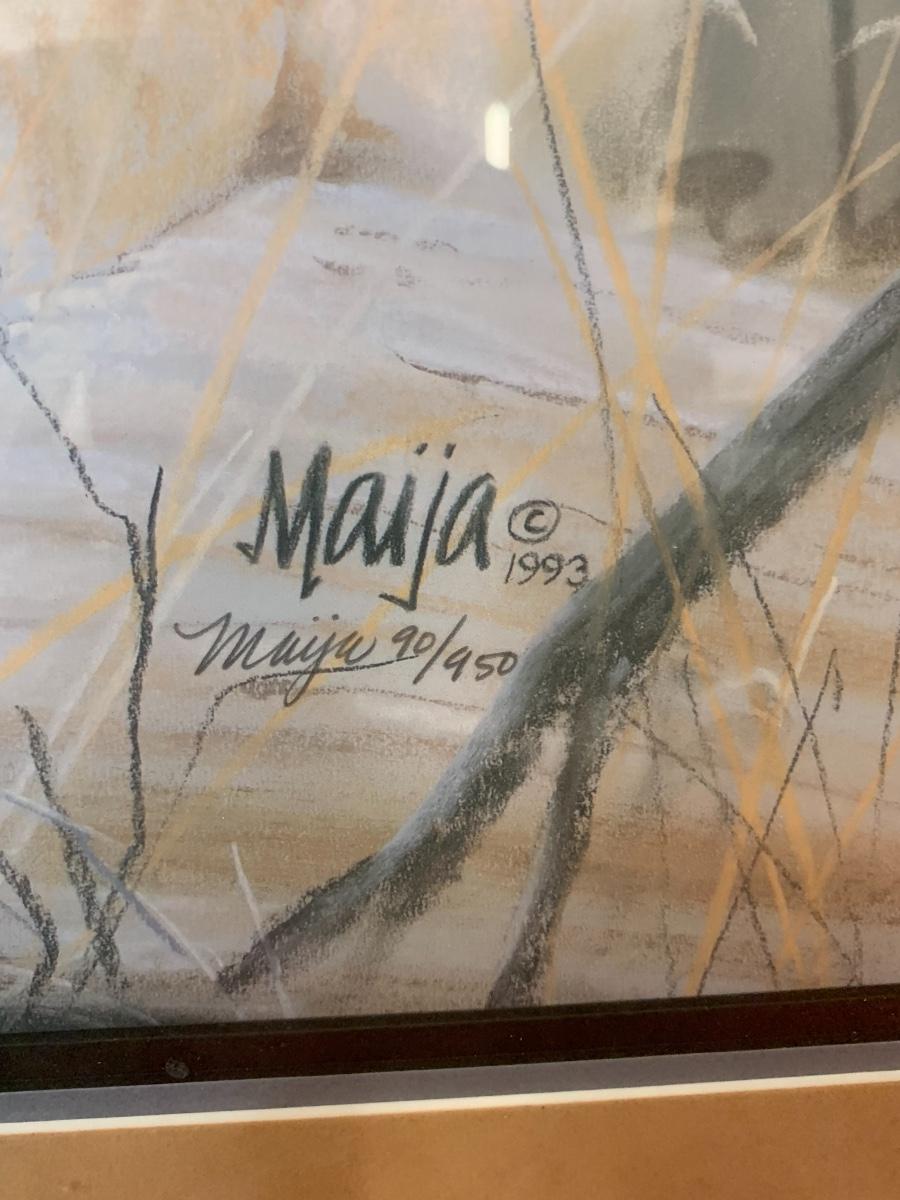 2 paintings by Maija both in excellent condition. (Larger print of woman is signed and dated. Also signed again a year later by Maija stating, “Best wishes.” Height= 37 inches, Length= 32 inches) (small picture, Height= 2 feet, length= 28 inches) Two wall hanging decor pieces depicting Native American men surrounded by rawhide both in excellent condition. (Brown one, 21 inches in length, 9 1/2 inches in width) (Turquoise one, 21 inches in length, 11 inches in width)