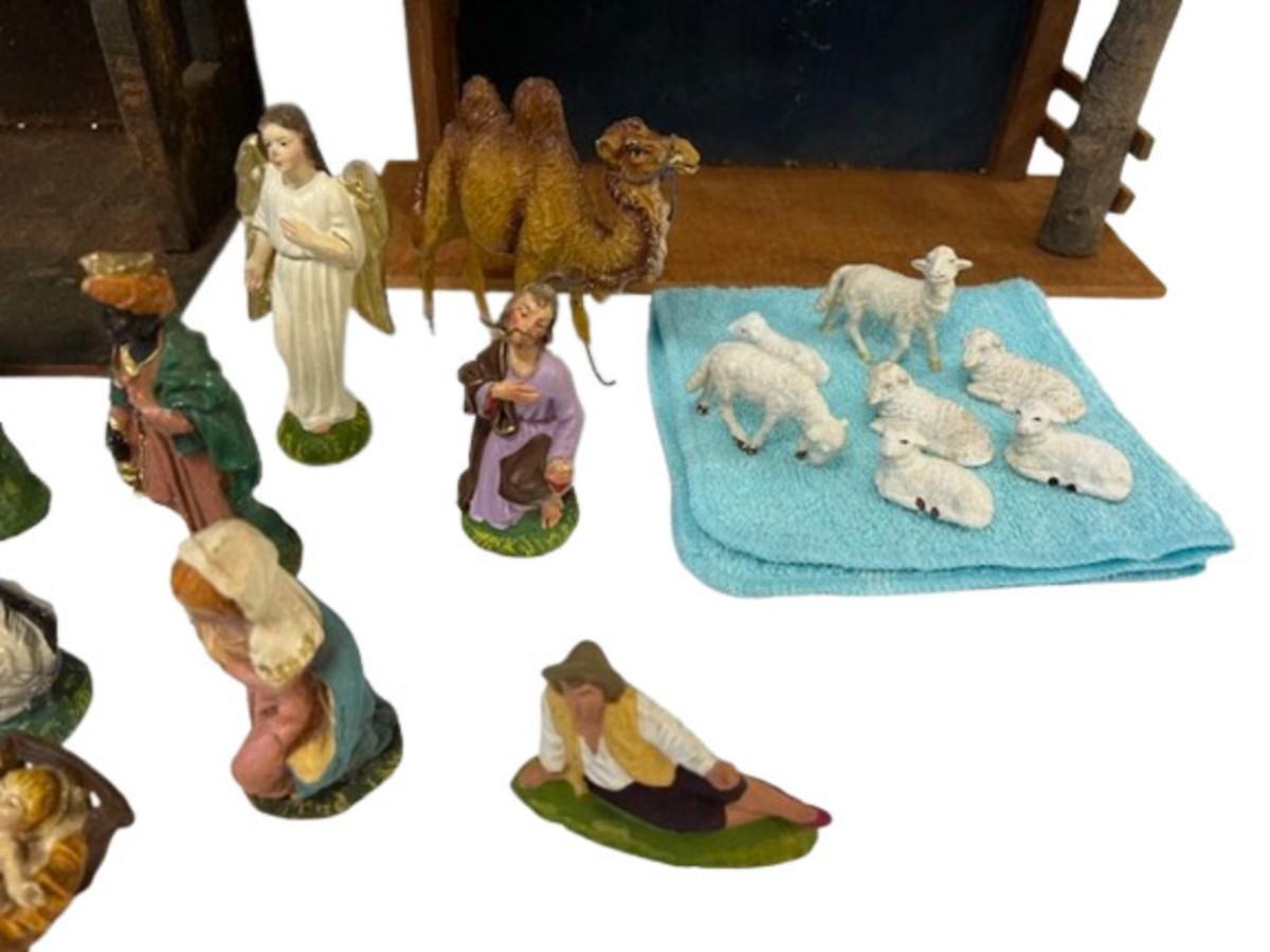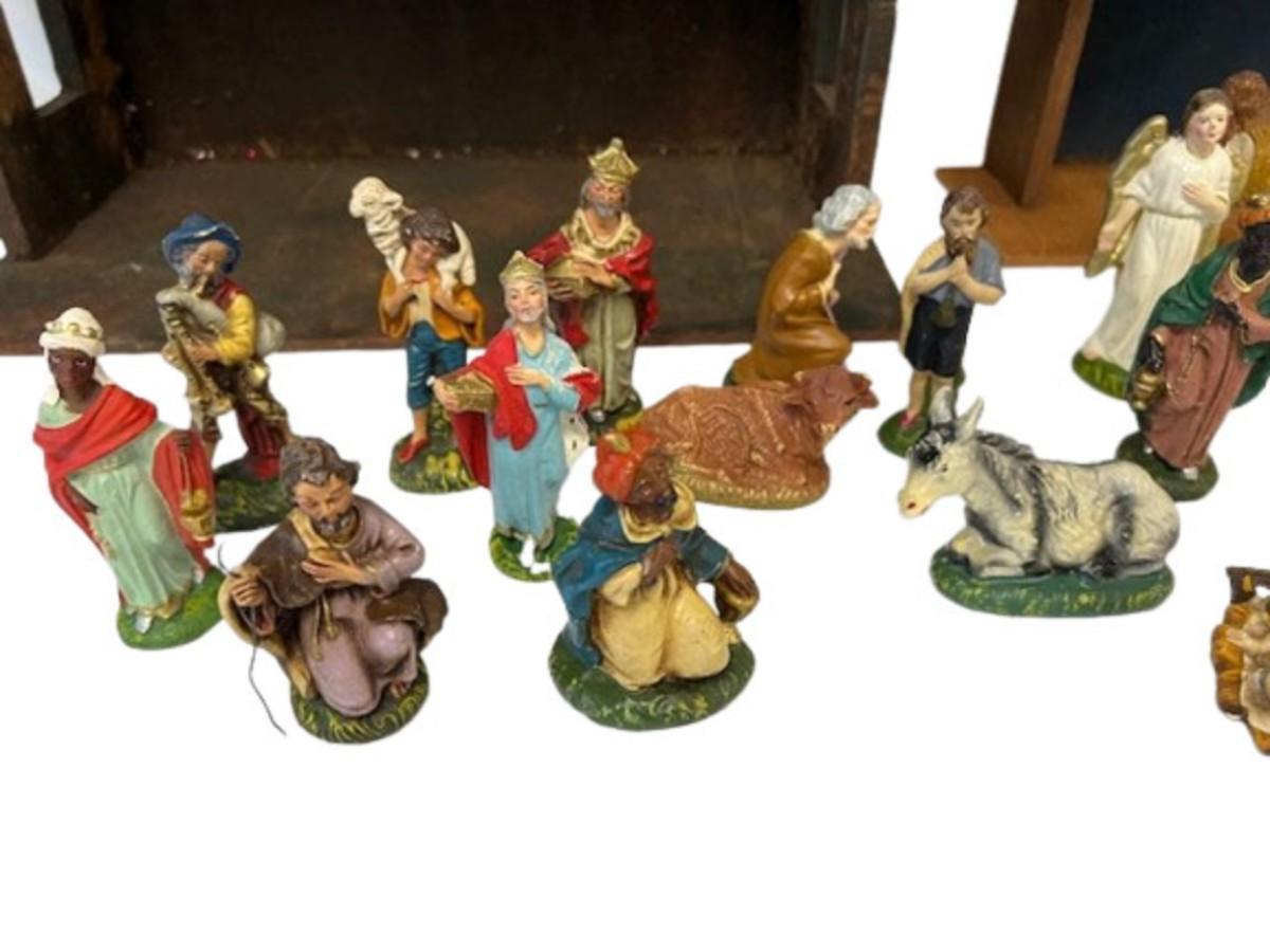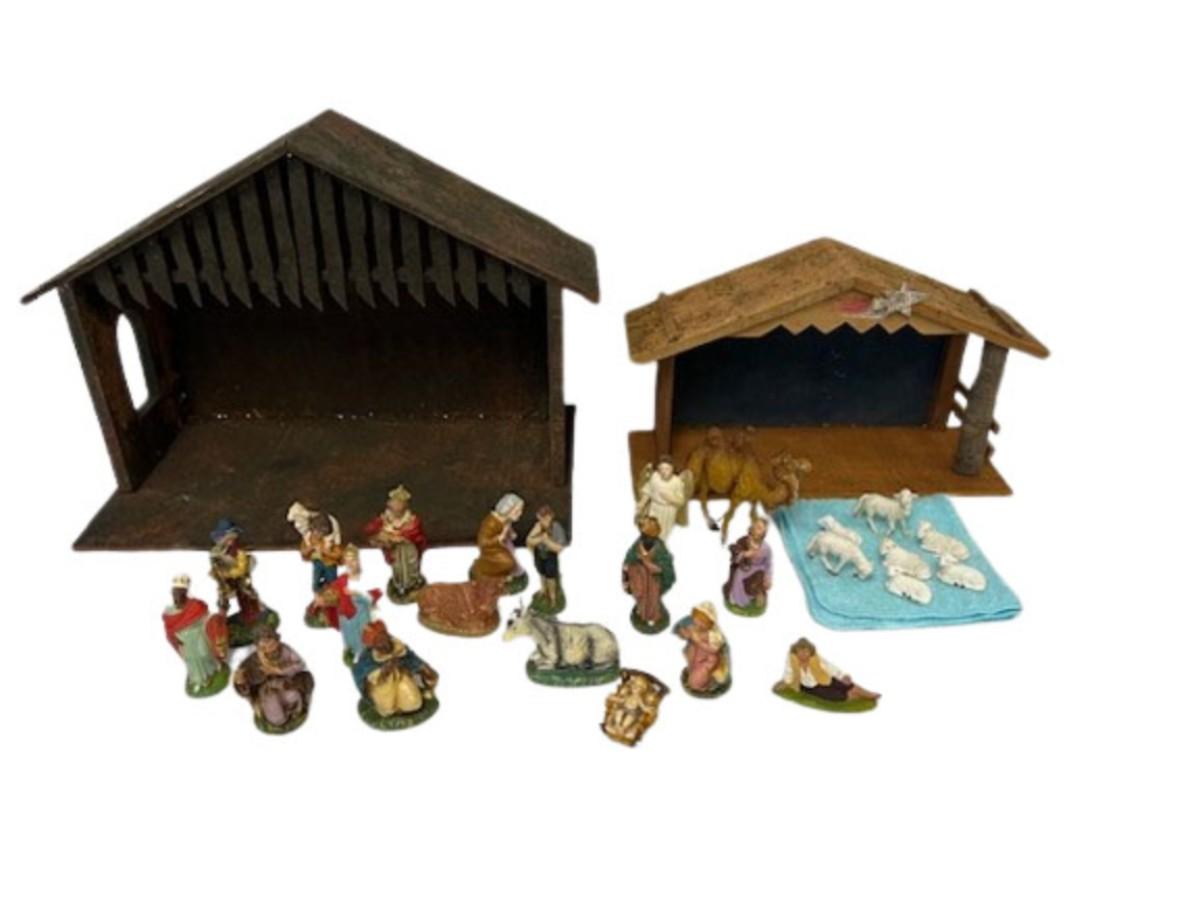 Includes two mangers and various figures. There appears to be a complete set of figures. Figures are hand painted. Most of the figures are made in Italy. One of the mangers is made in Japan. [ST]