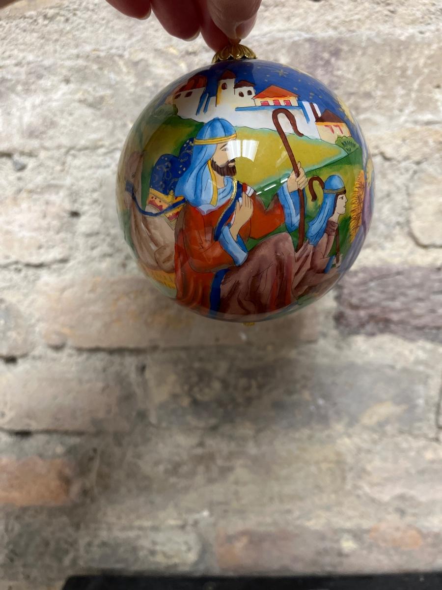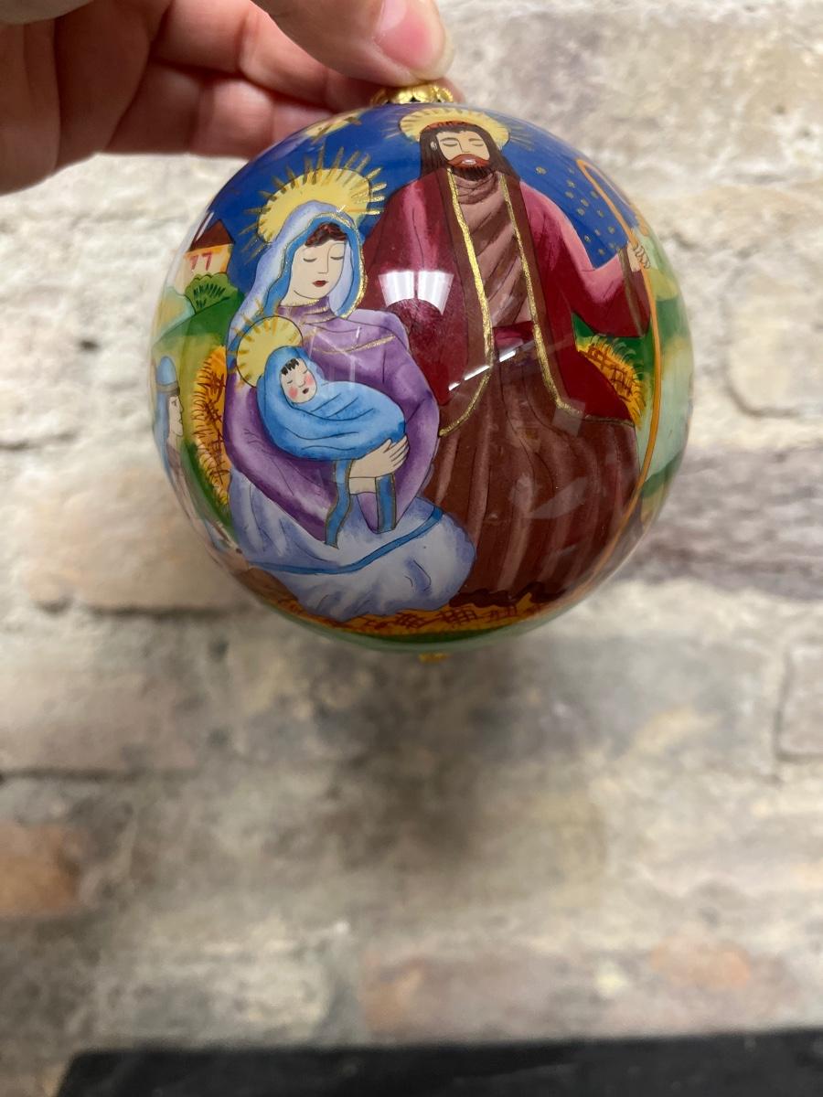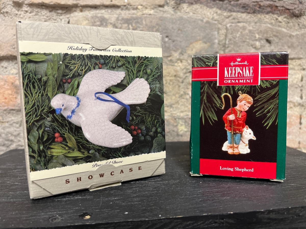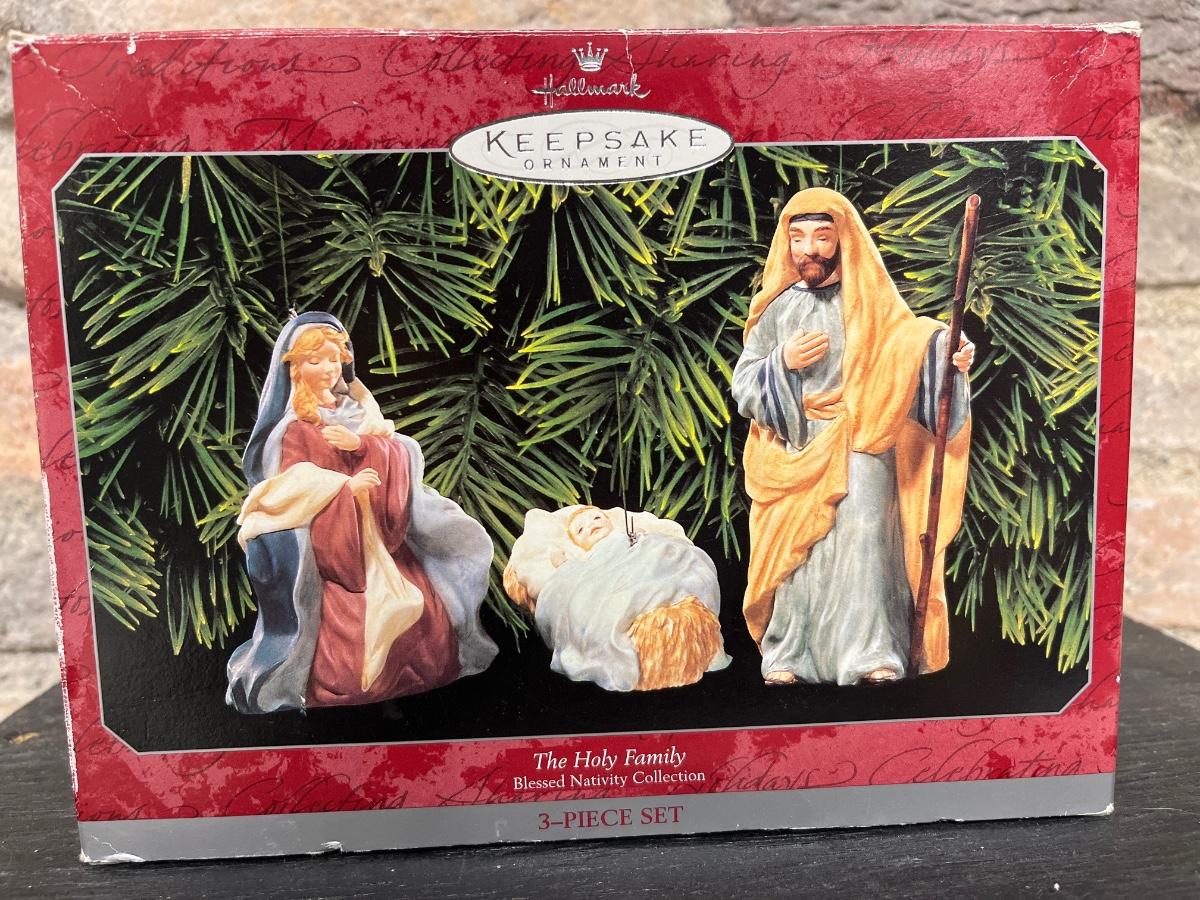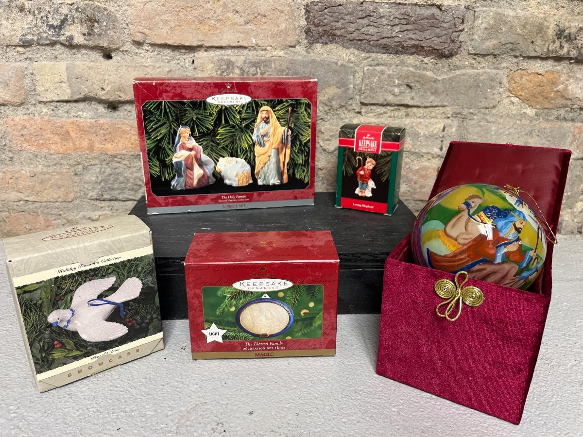 Beautiful Pier 1 manger scene ornament in velvet box, Hallmark The Holy Family, The Blessed Family, Peaceful Dove and Loving Shepherd ornaments