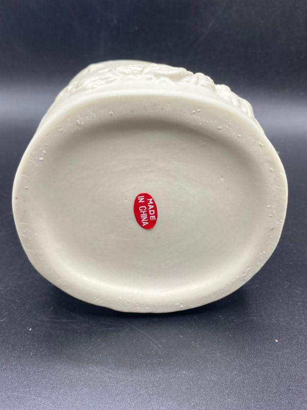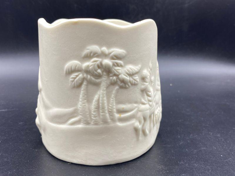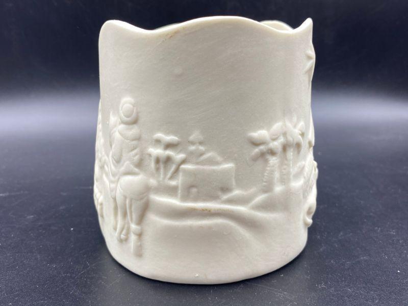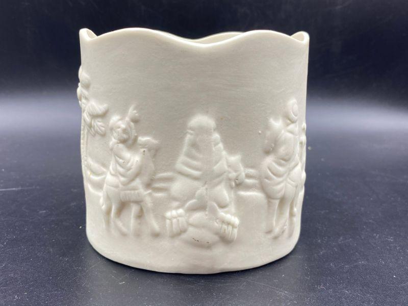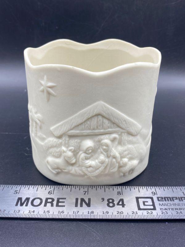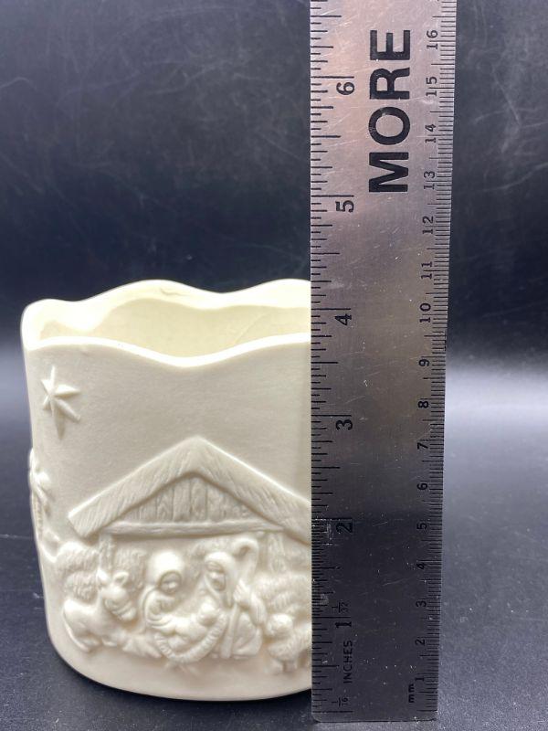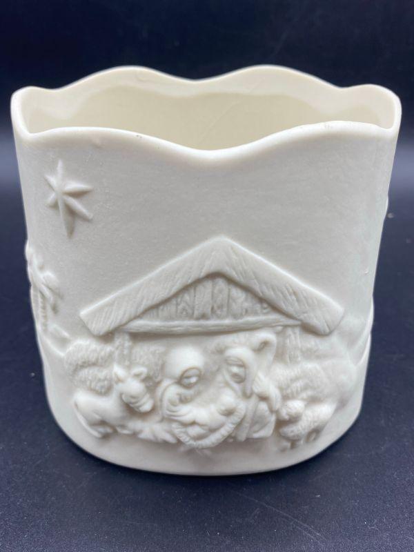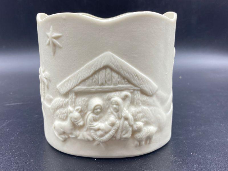 Wrap around nativity scene candle holder. Matte white finish. Good condition.