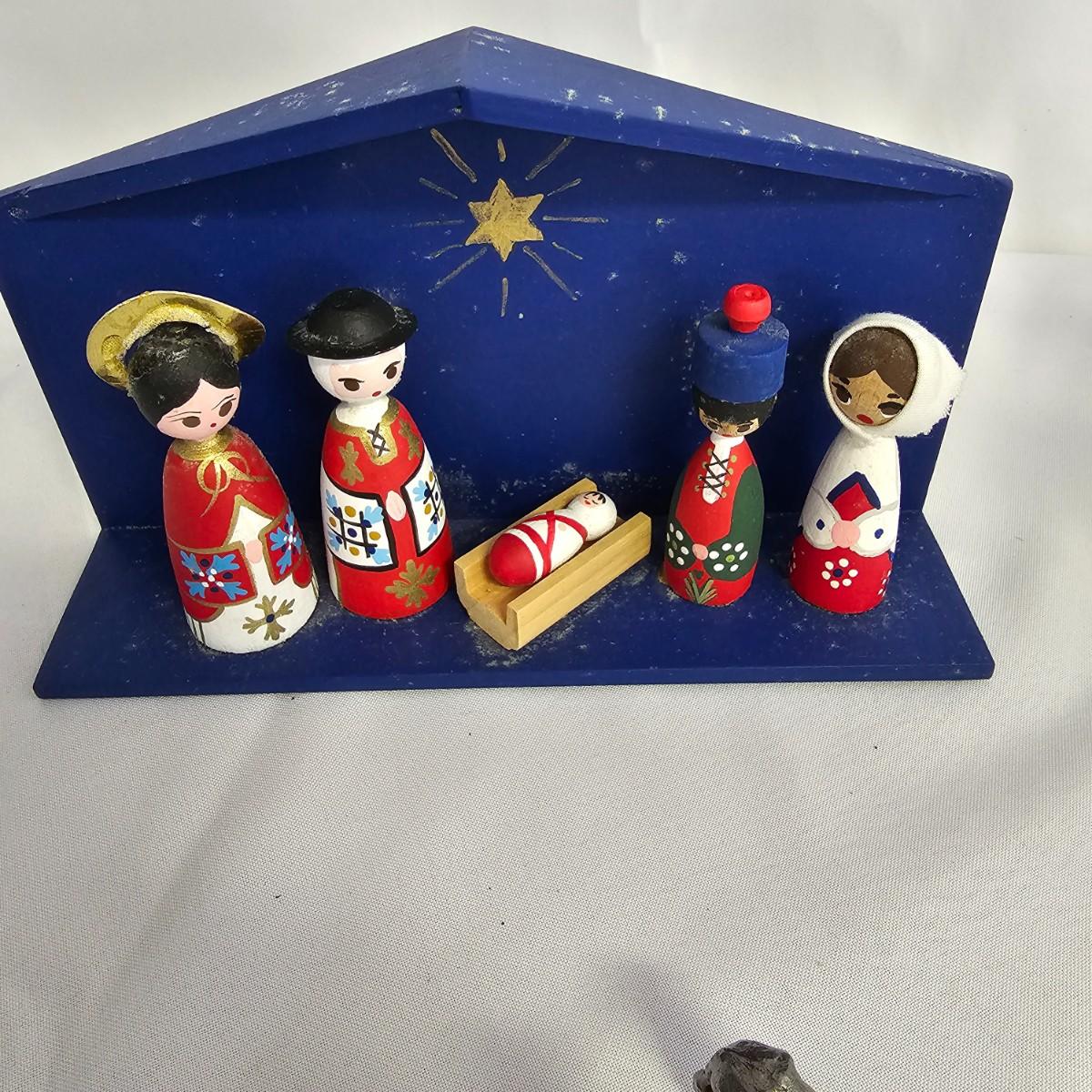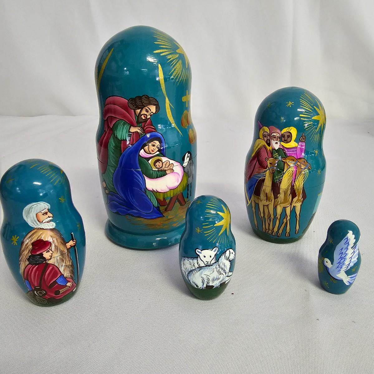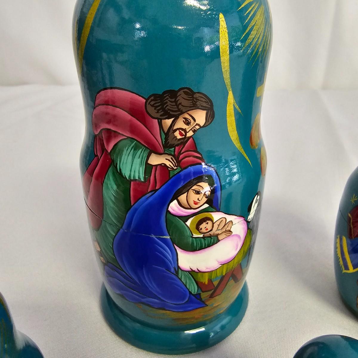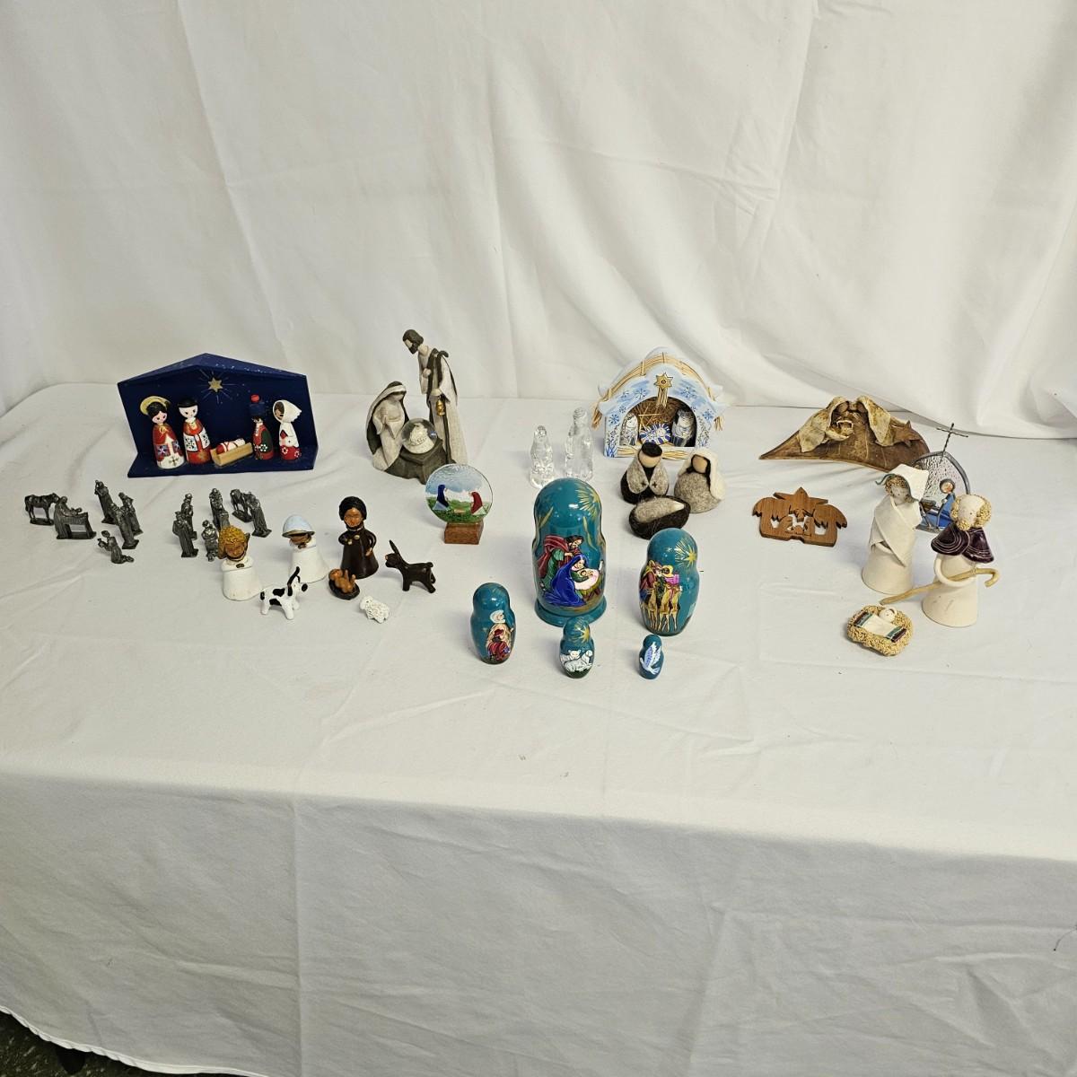 A varied collection of different representations of the Nativity. Fifteen unique sets, many from different countries. Iceland, Venezuela, Sweden and more are shown here. Ceramic, glass, wood, pewter and fabric materials. One Russian style nesting dolls with figures on them. Many items handcrafted. For reference, blue set is 10" x 3" x 5"H, tallest set with snow globe is 8". One ceramic piece has a slight crack in it. See photos for details. Shipping available.
