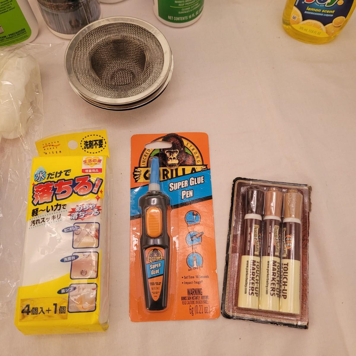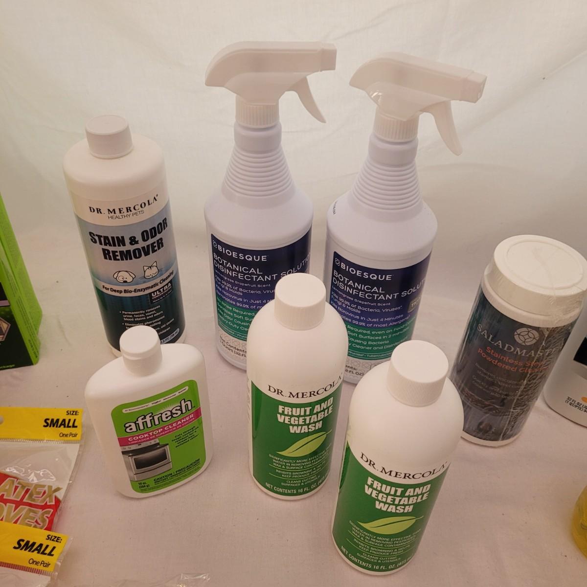 A large assortment of natural cleaning products, as well as other household cleaning and maintenance items. Lot includes Dr. Mercola odor and stain remover and fruit and vegetable wash, as well as other items including dish soap, cooktop cleaner, laundry detergent, scrub pads, mold test kit, super glue and more. Shipping available.