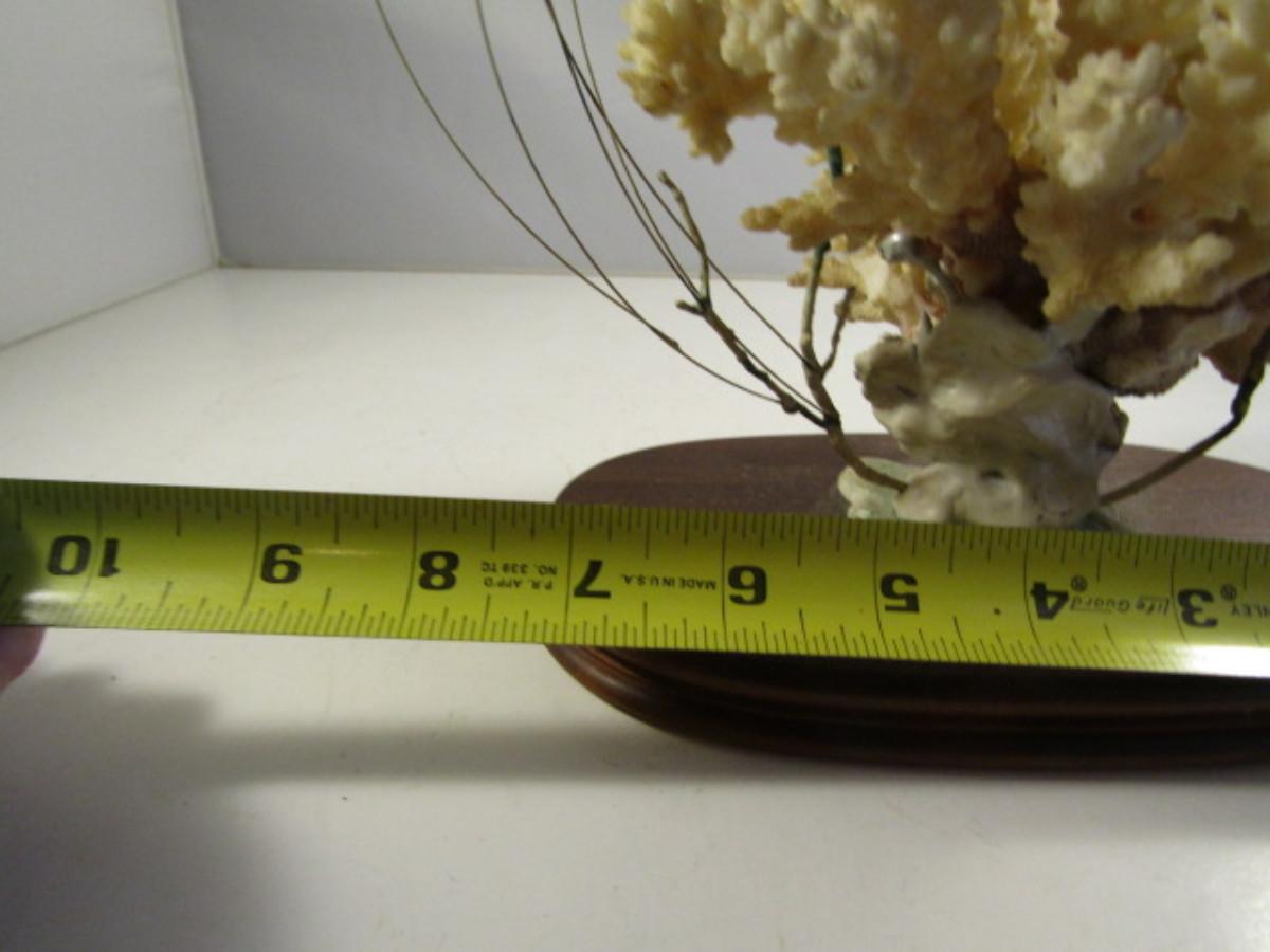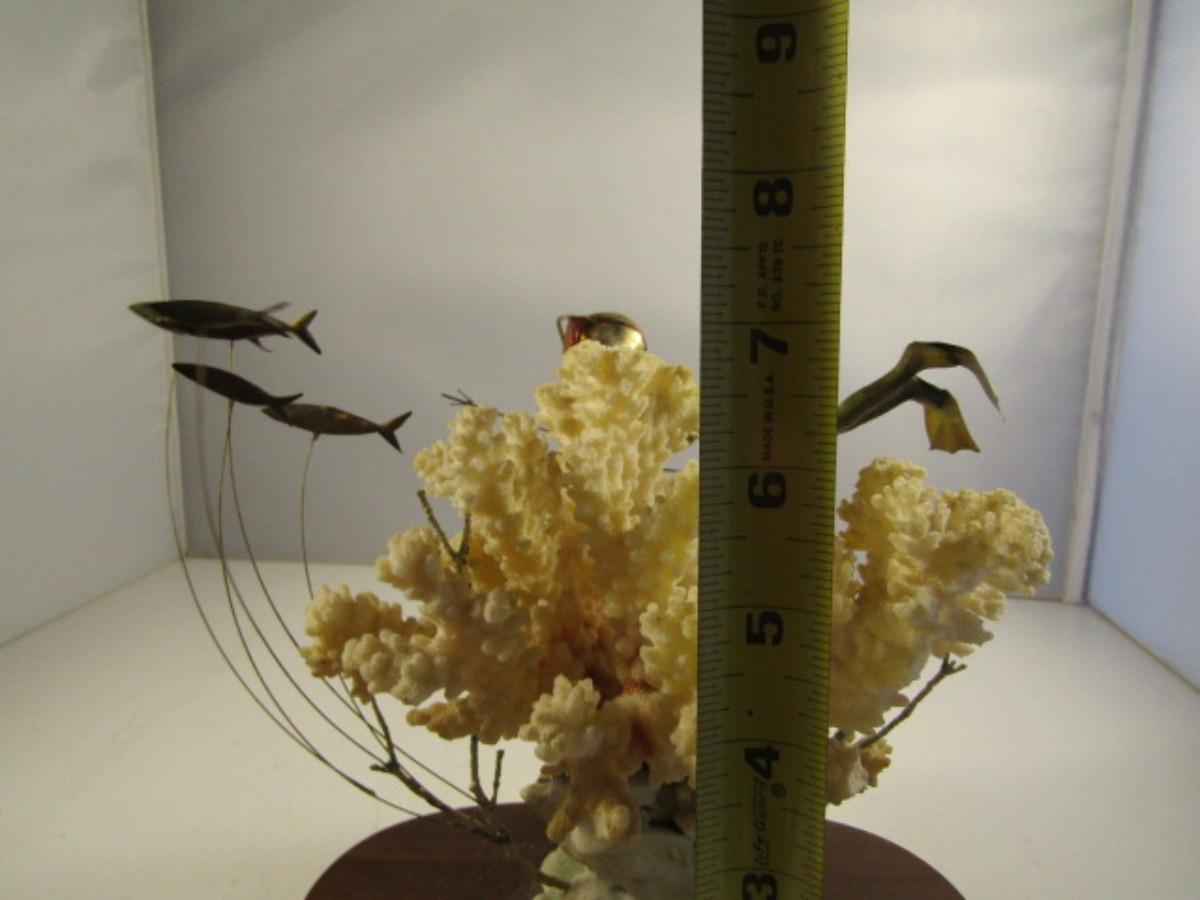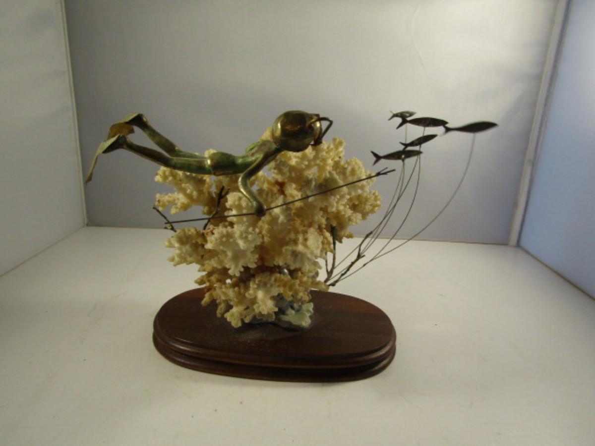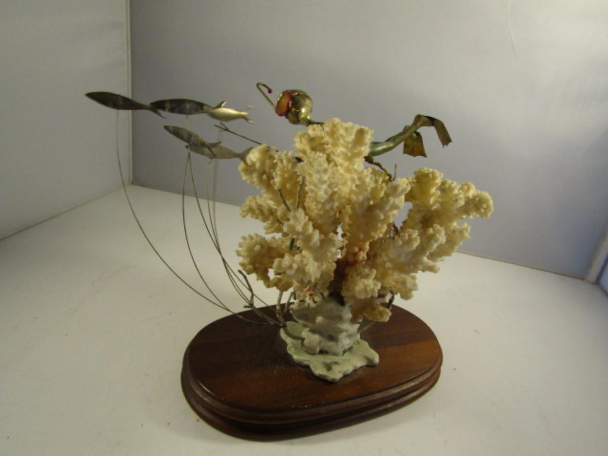 Natural Coral Art- Metal Fish and Scuba Diver on Wooden Base