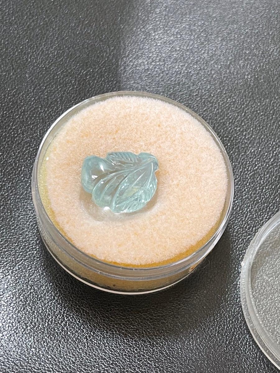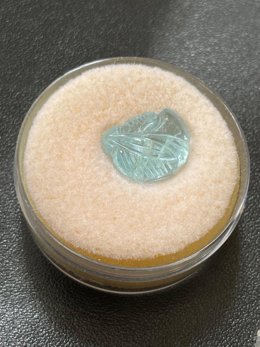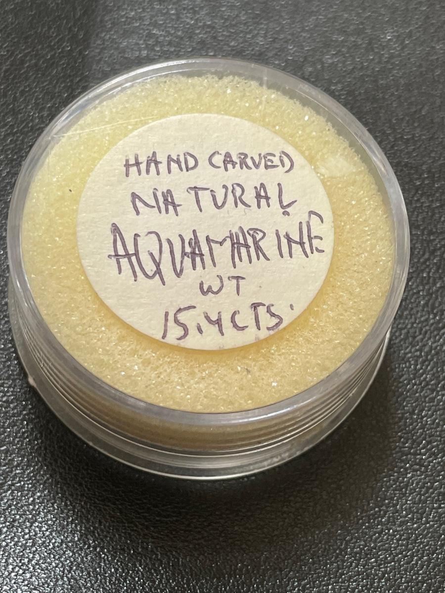 Sticker on container reads ‘Hand Carved Natural Aquamarine WT 15.4 CTS