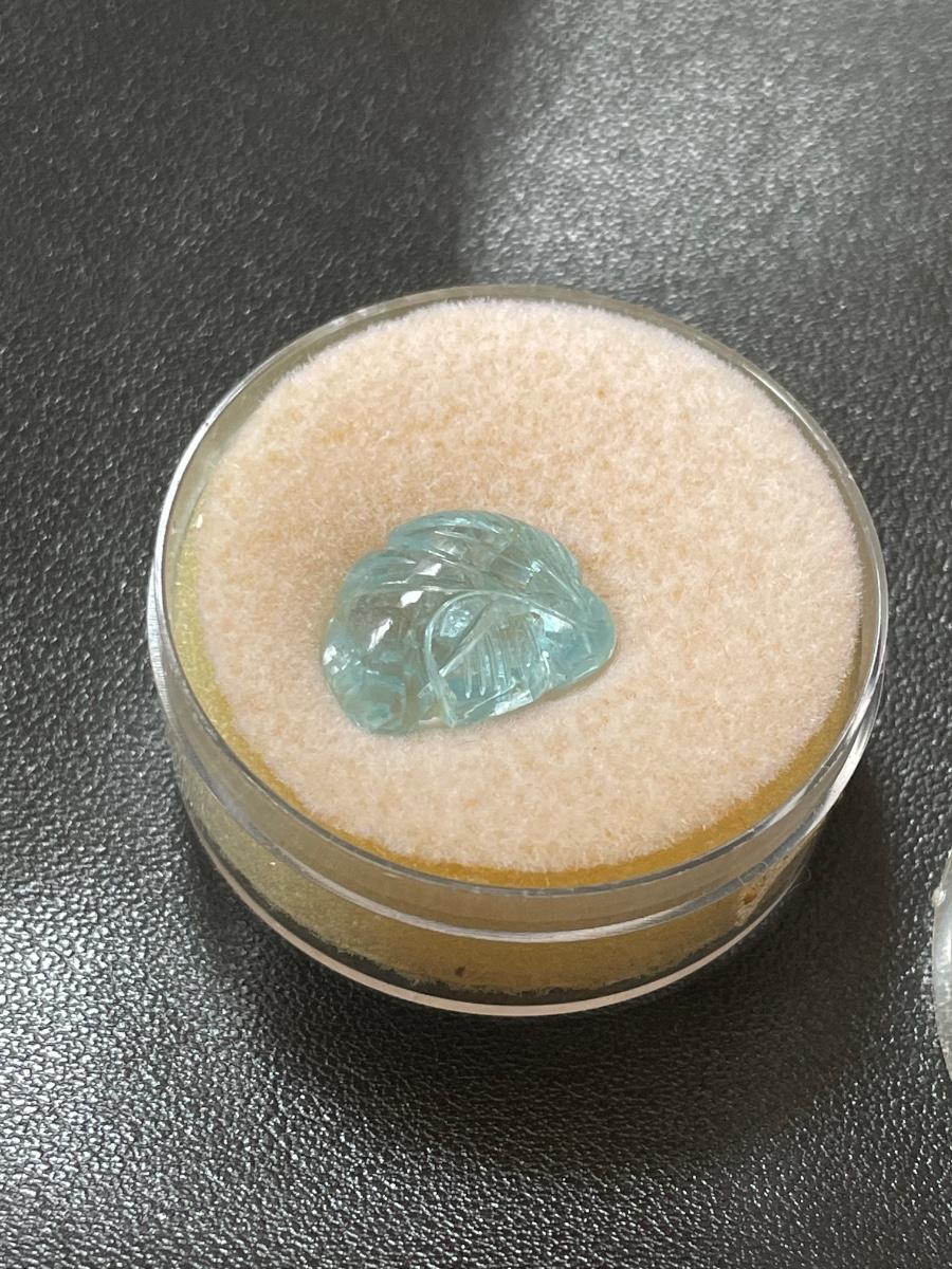 Sticker on container reads ‘Hand Carved Natural Aquamarine WT 15.4 CTS