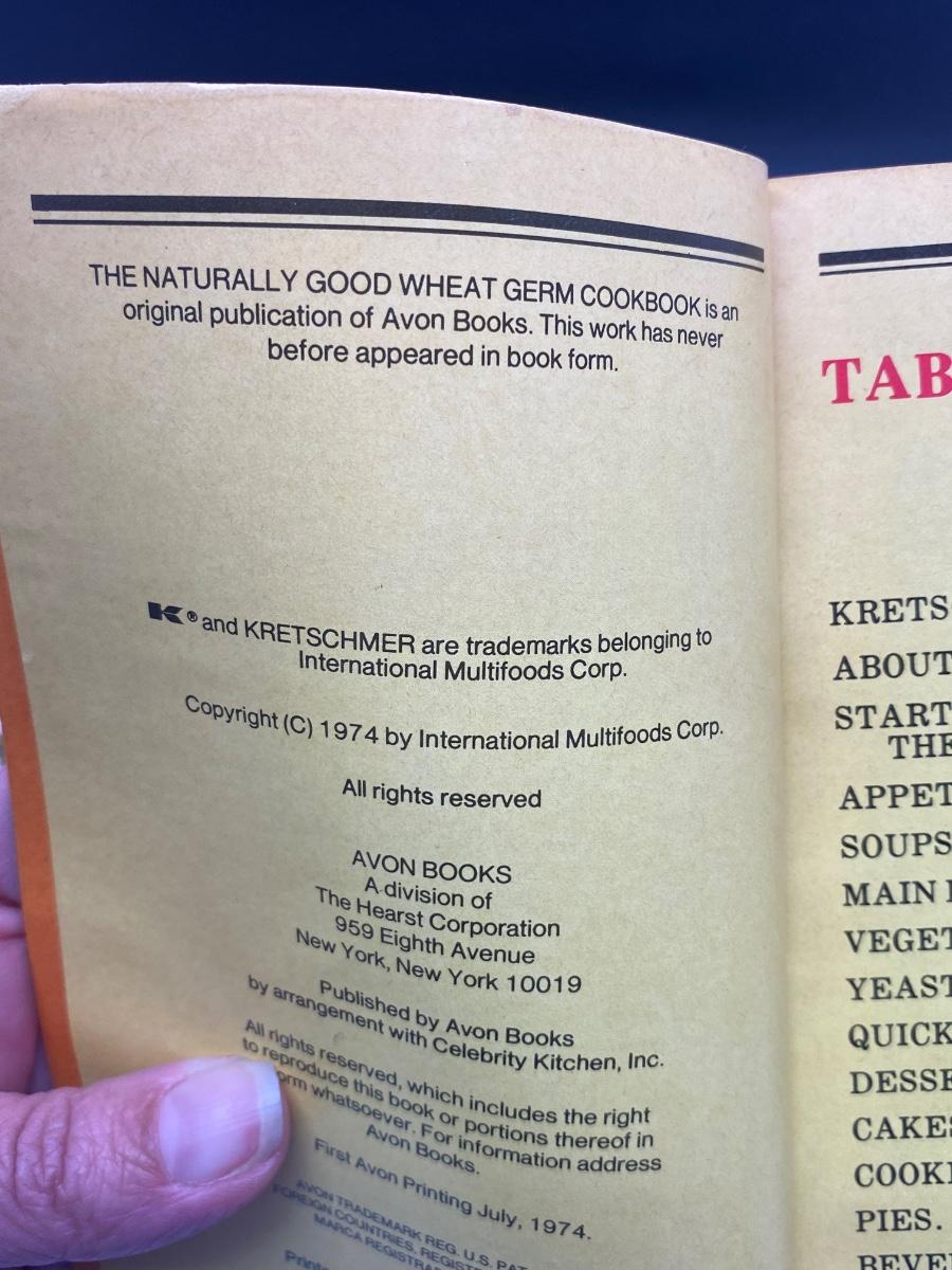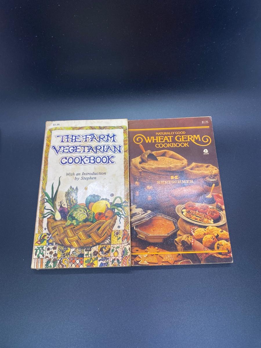 Paper of vintage paperback pocket sized cookbooks. Both are geared towards a healthier eating style. The Farm Vegetarian Cookbook and Naturally Good Wheat Germ Cookbook. Both from mid 1970s. Good condition.