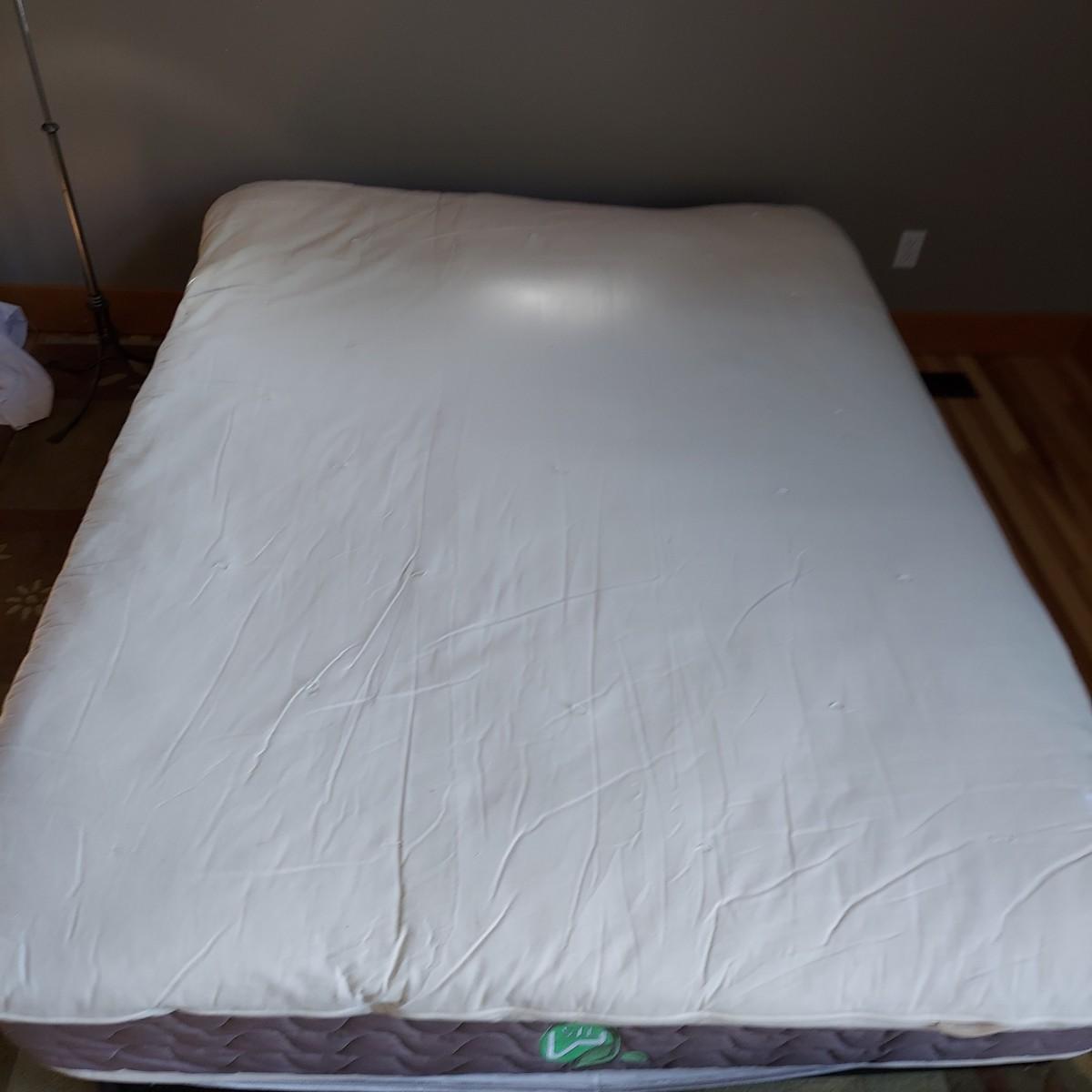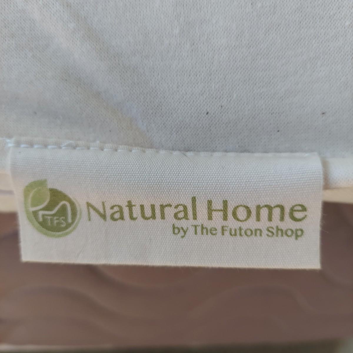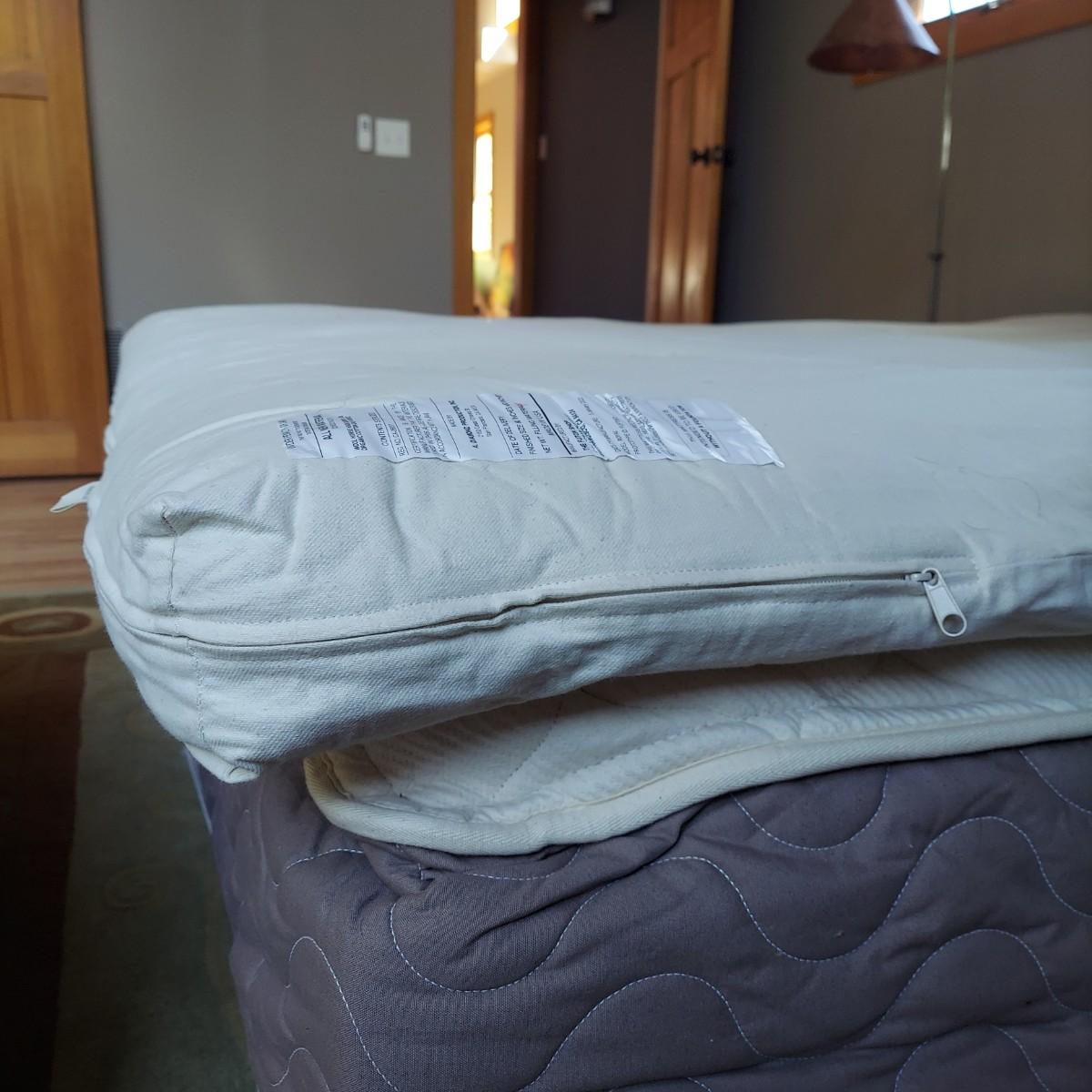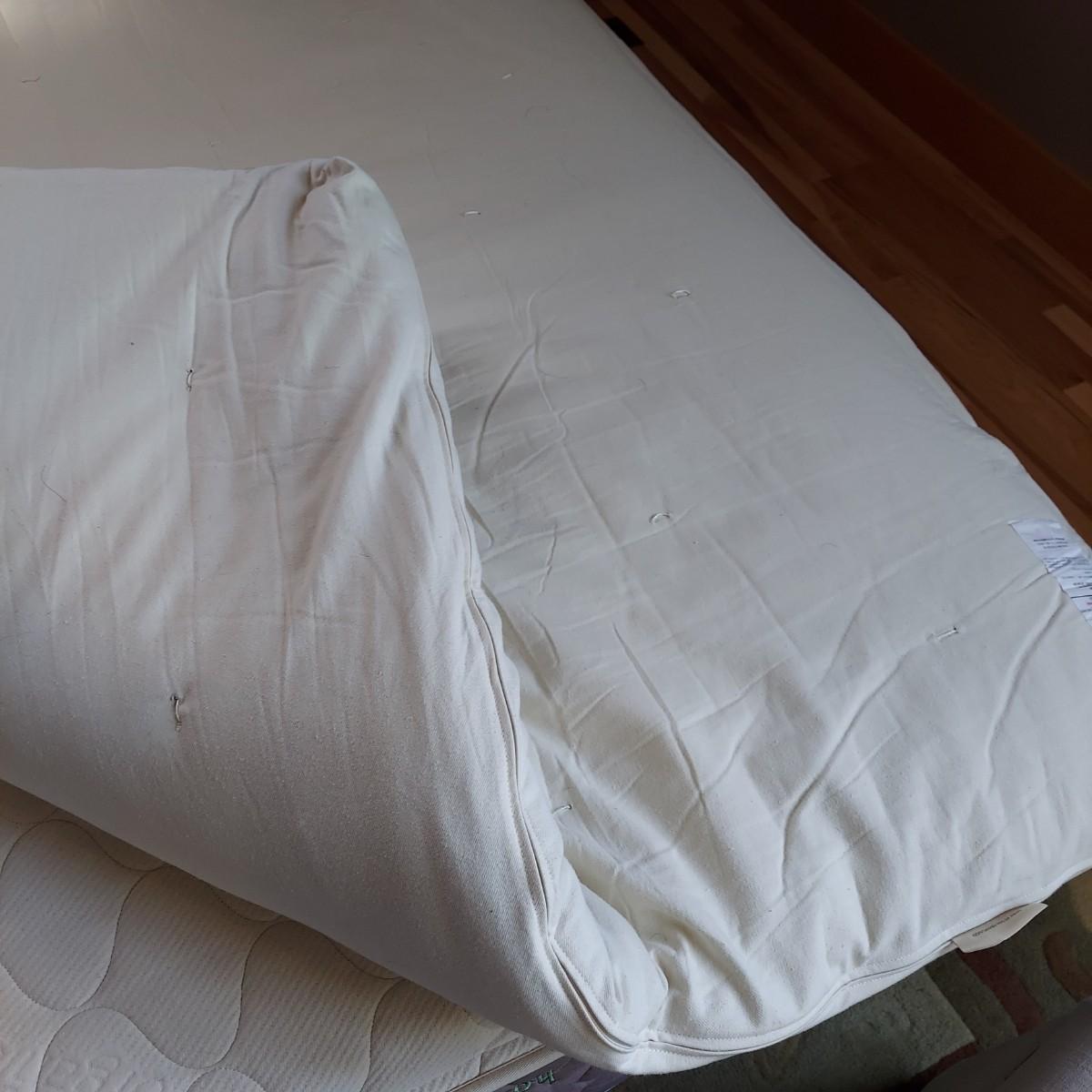 Natural mattress topper with slip on cover. Organic cotton outer with wool filling. Made by Natural Home by The Futon Shop. Measures approximately 62 x 84". About 4" thick. Please note item is from a pet owned home. Mattress is not included. Local Pickup Only.