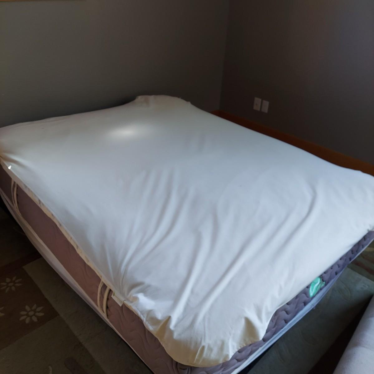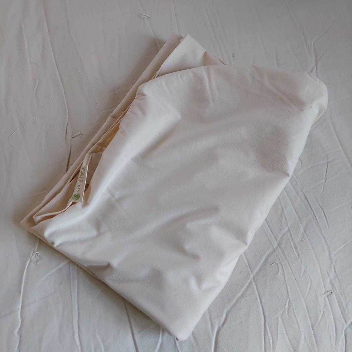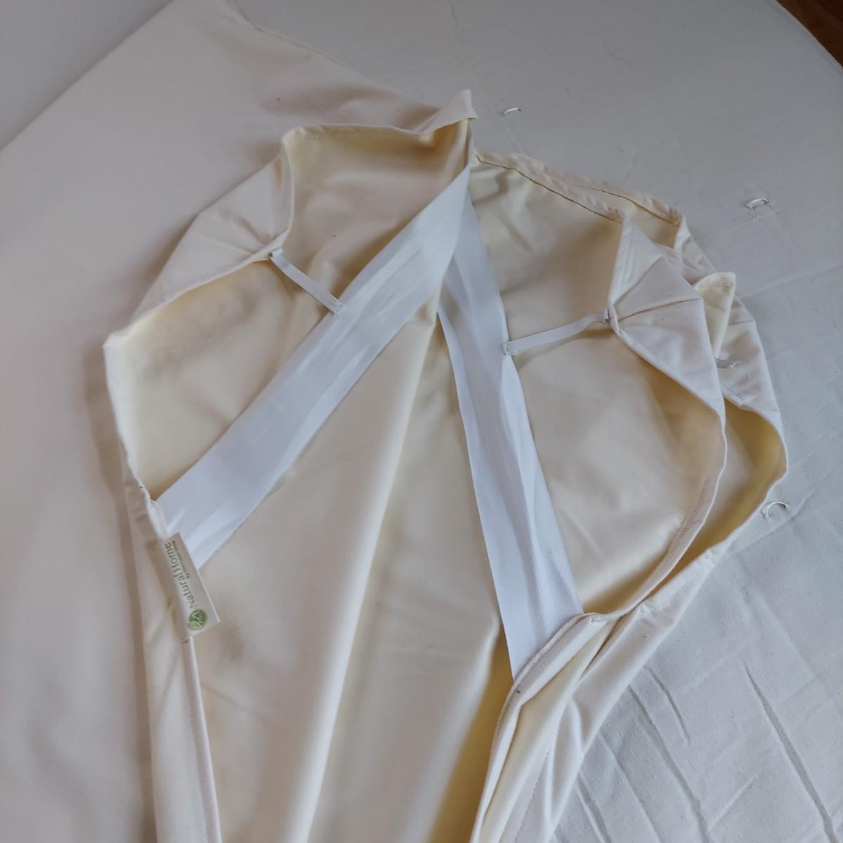 Natural mattress topper with slip on cover. Organic cotton outer with wool filling. Made by Natural Home by The Futon Shop. Measures approximately 62 x 84". About 4" thick. Please note item is from a pet owned home. Mattress is not included. Local Pickup Only.