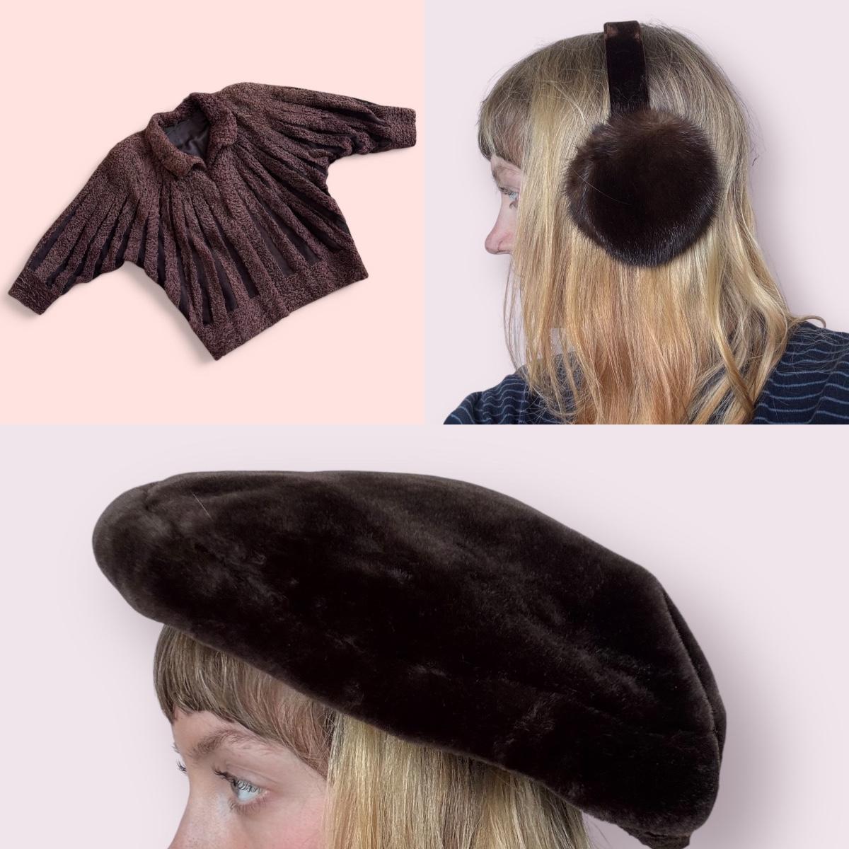 This lot includes one pair of Dena natural mahogany mink earmuffs, one faux fur beret, and one fabulous coat that appears to be lambs fur but we cannot confirm. The coat is a size XL. The earmuffs are brand new with tags. Shipping available.