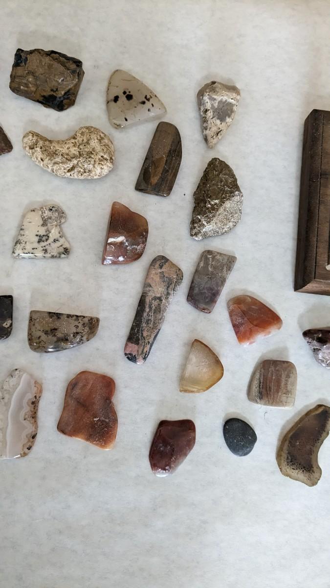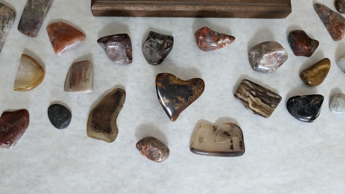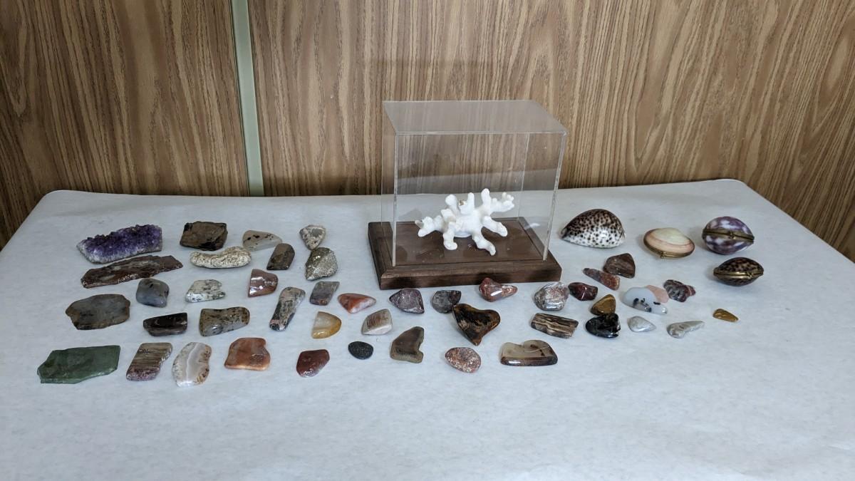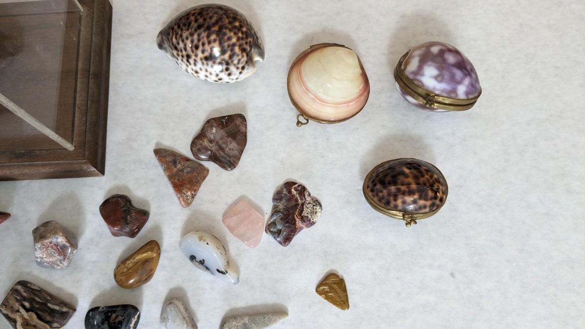 a beautiful collection of raw and polished rocks/gems. A beautiful cased coral, 3 shell boxes, and lovely Hawaiian conch. Specialty handling fees will apply, inquire for more information. bdrm1
