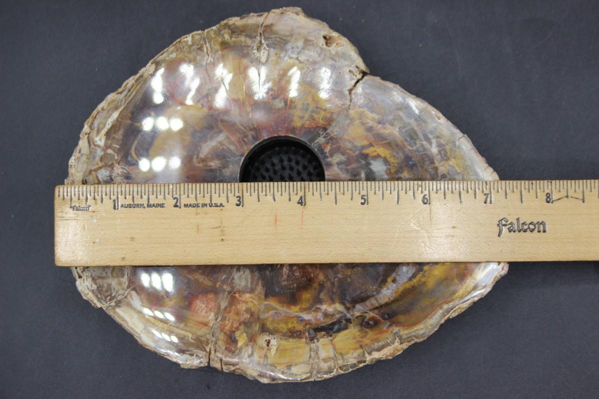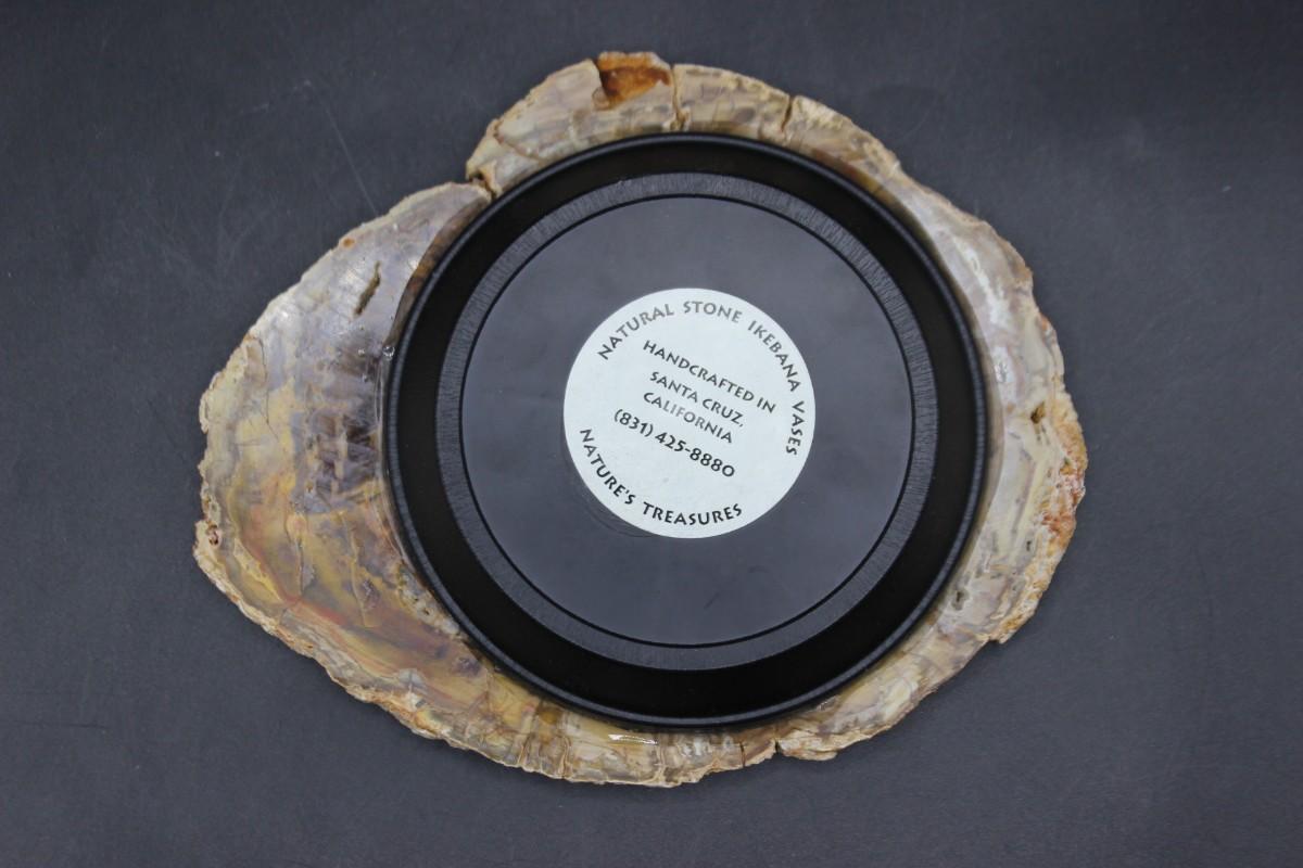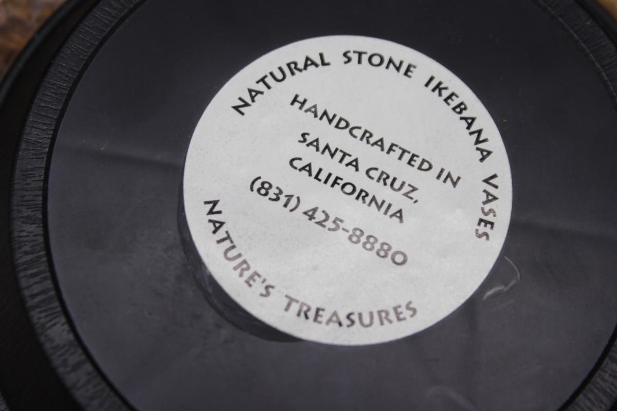Handcrafted stone slice floral frog. Made in Santa Cruz, CA. Has original sticker on the bottom. Stone slab is attached to floral frog. About 8" at widest spot.