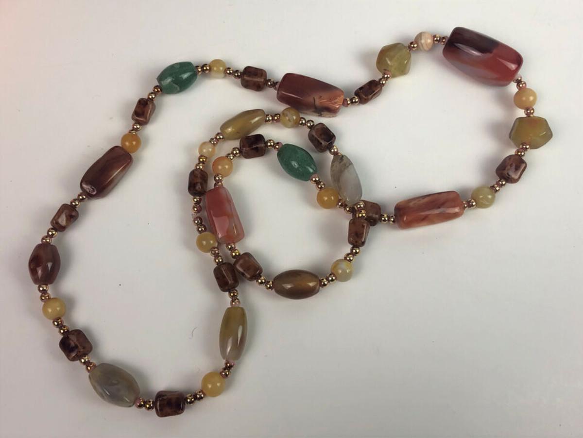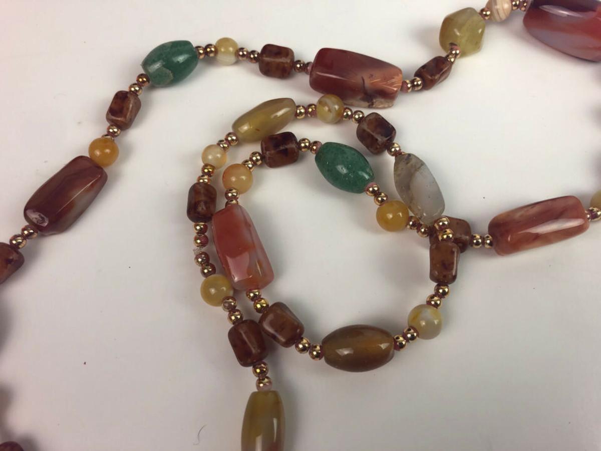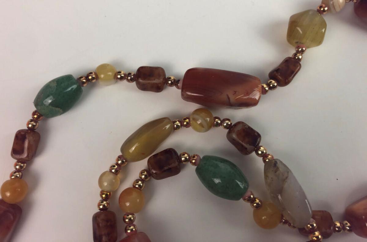 Excellent condition on this 15" necklace made of natural semiprecious stones...I believe they are various polished Agates...double brass bead spacers...as shown...It is said...Agate enhances mental function, improving concentration, perception and analytical abilities. It soothes and calms, healing inner anger or tension and creates a sense of security and safety.