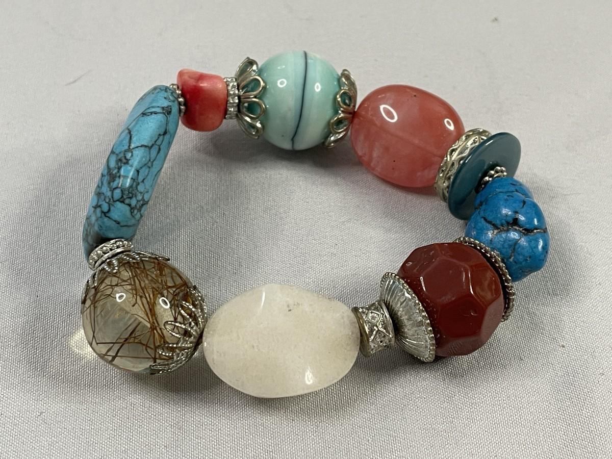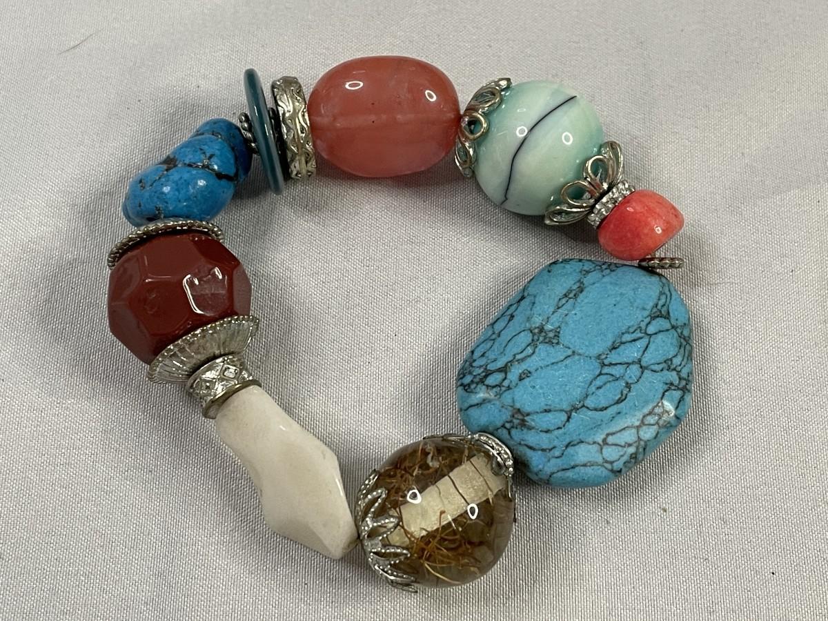 There is a combination of materials to make the beads. The large pink one is stone, and some are glass.