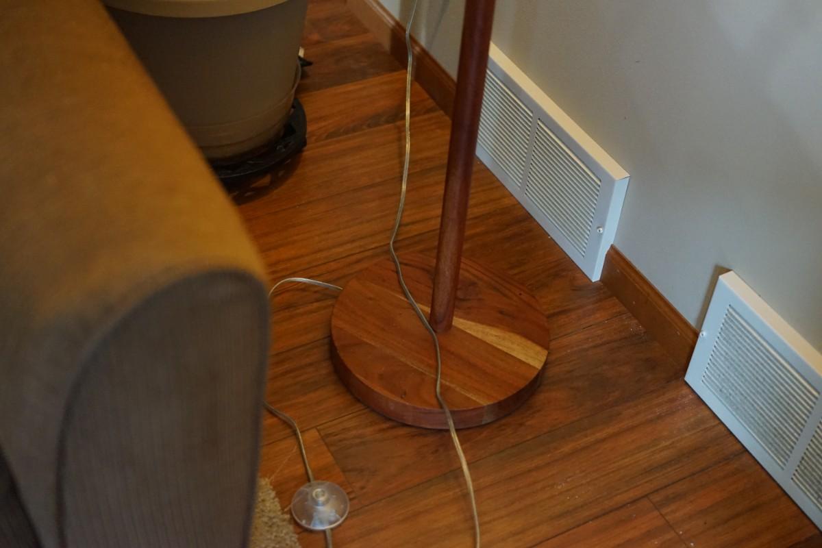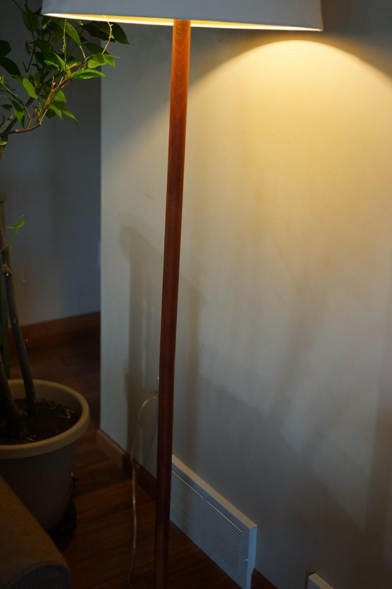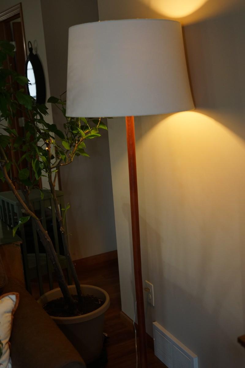 NATURAL TEAK FLOOR LAMP /GOOD FABRIC SHADE, ROUND SECURE BASE/FOOT PEDAL SWITCH