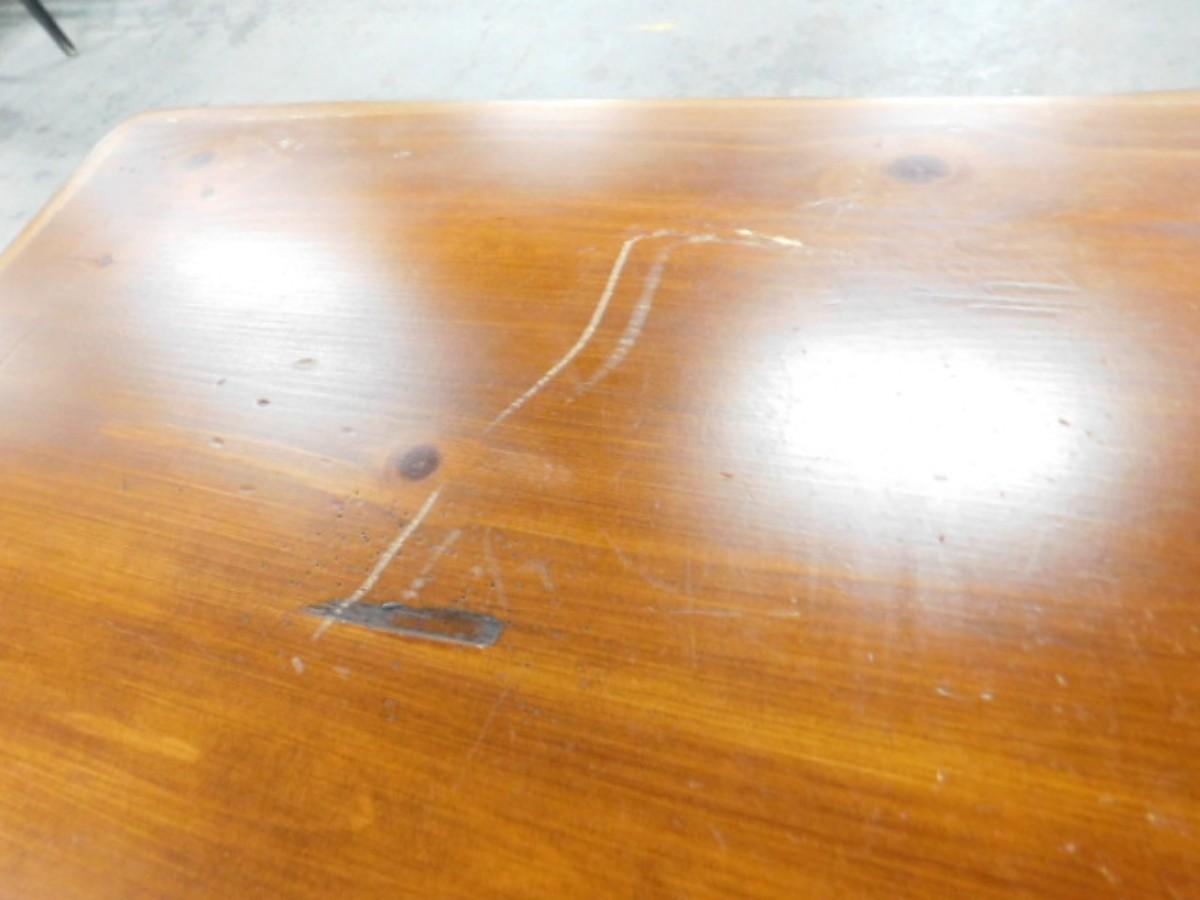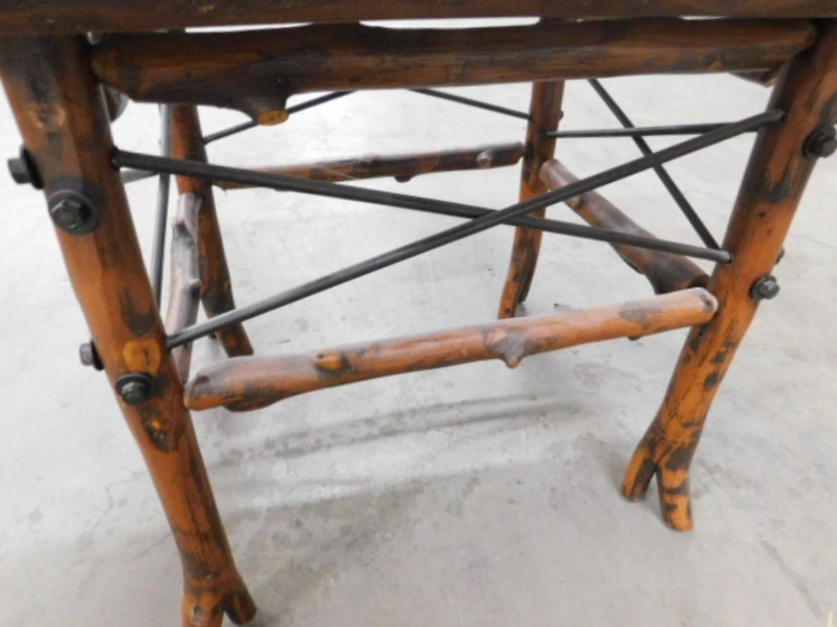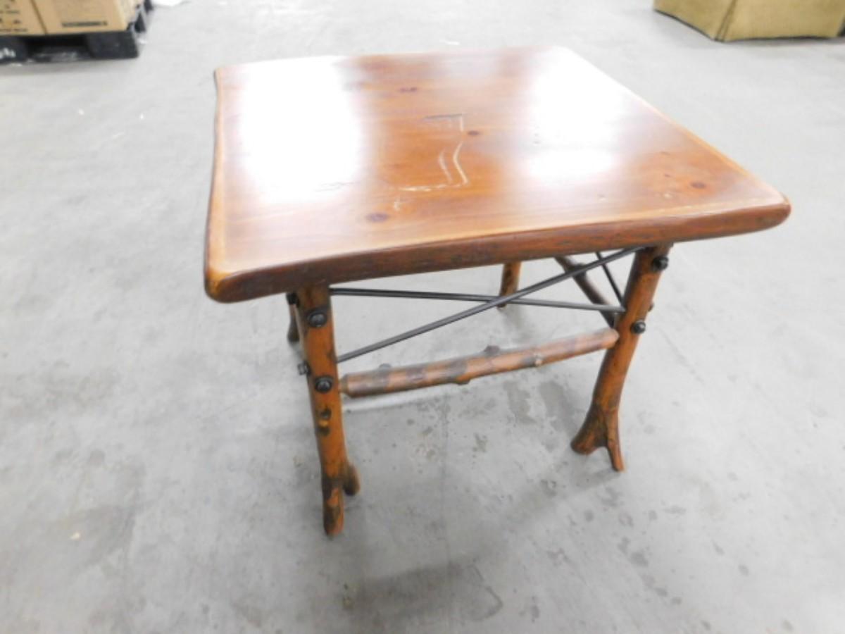 Natural Wood Rustic Log Slab Top Side Tables with Metal Cross Braces Choice A. Has noticeable scratch on surface as shown. Expect some wear or scratches to the finish. Shipping option available via freight or local mover at Buyer's expense. Buyer must have all shipping scheduled within the stated dates and times of pickup. Recommended local mover is Beaty Bros. Moving 828-201-2982