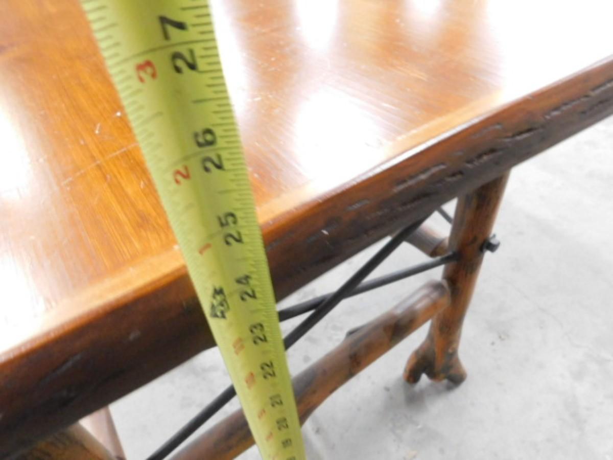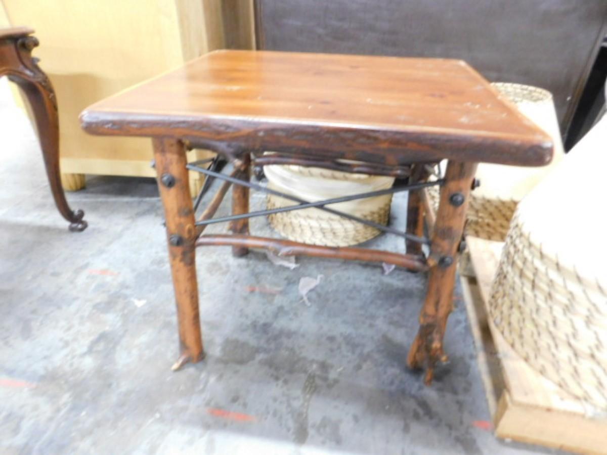 Natural Wood Rustic Log Slab Top Side Tables with Metal Cross Braces Choice B. Expect some wear or scratches to the finish. Shipping option available via freight or local mover at Buyer's expense. Buyer must have all shipping scheduled within the stated dates and times of pickup. Recommended local mover is Beaty Bros. Moving 828-201-2982