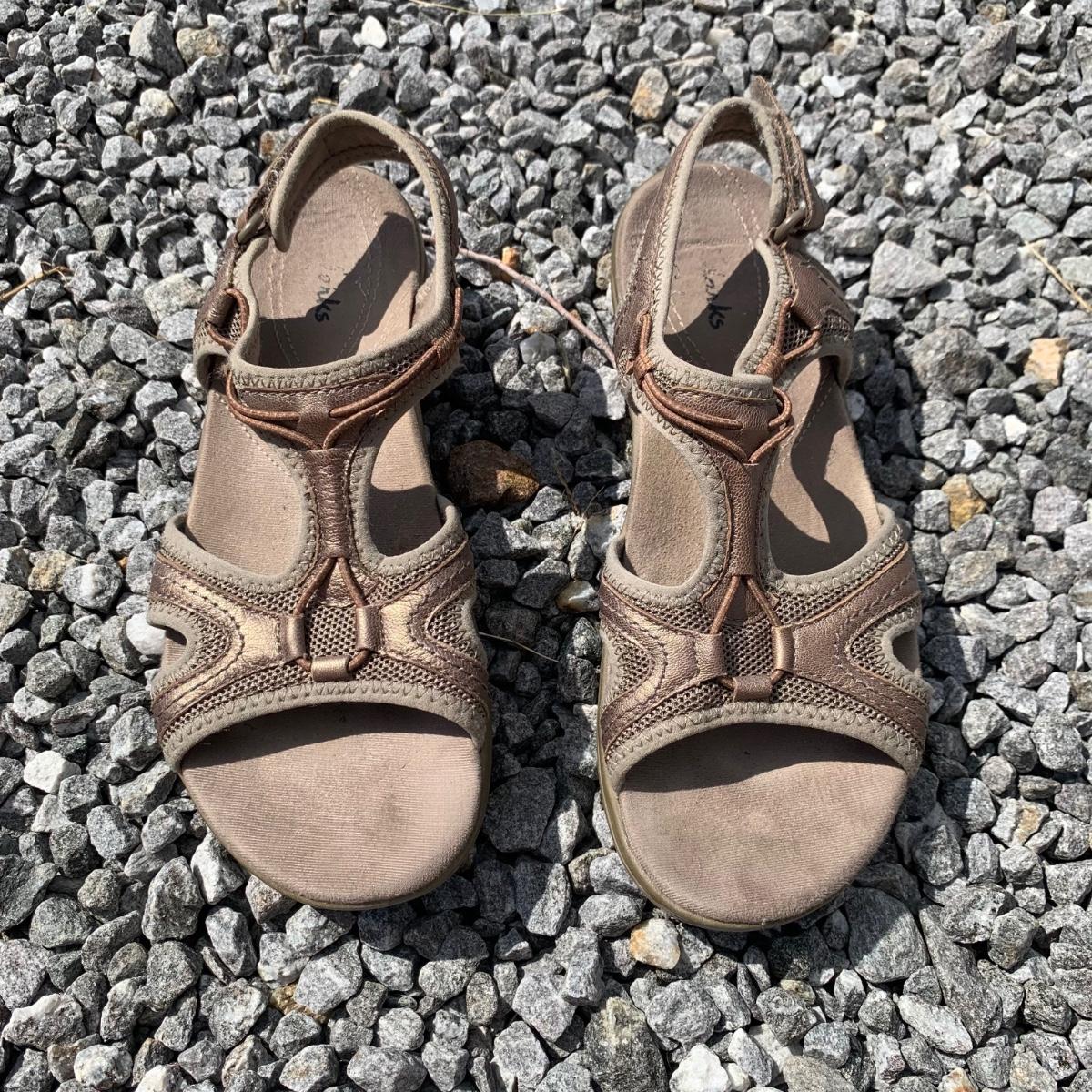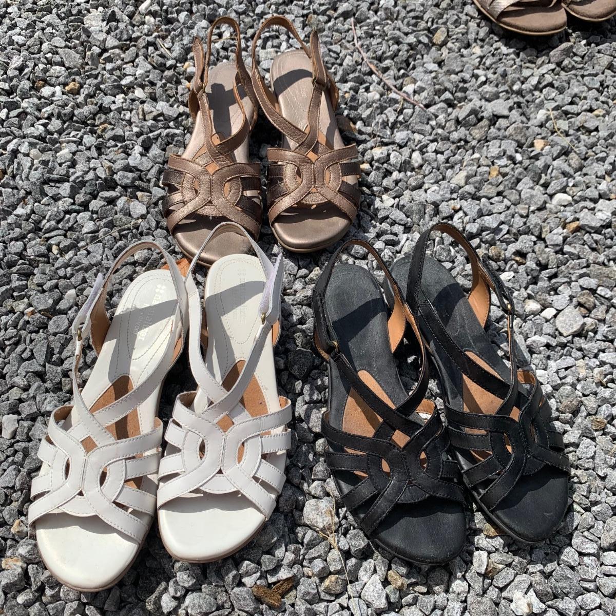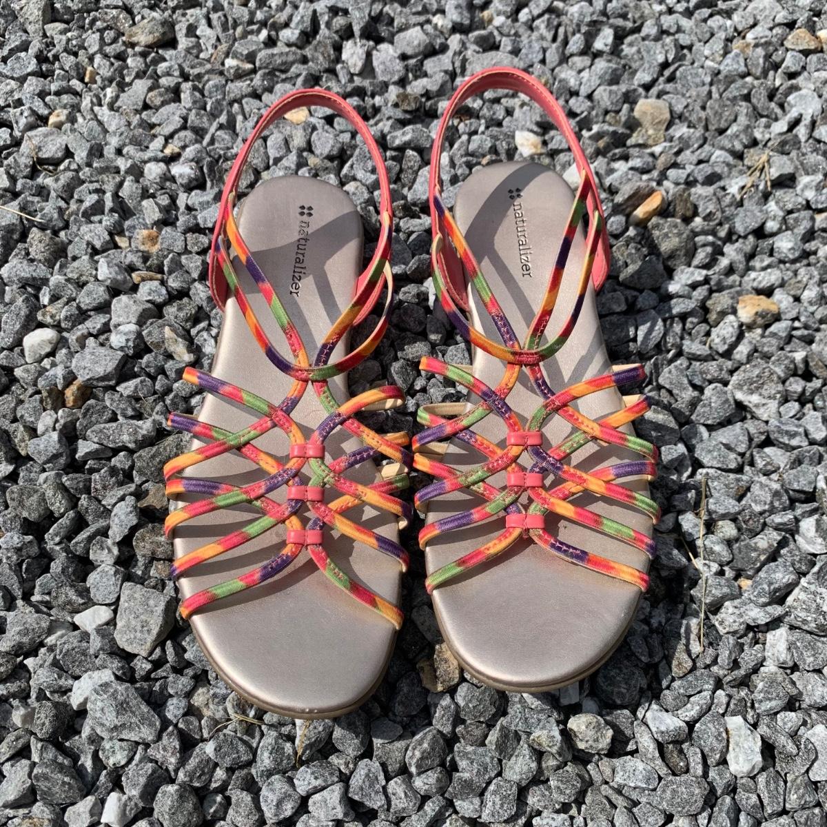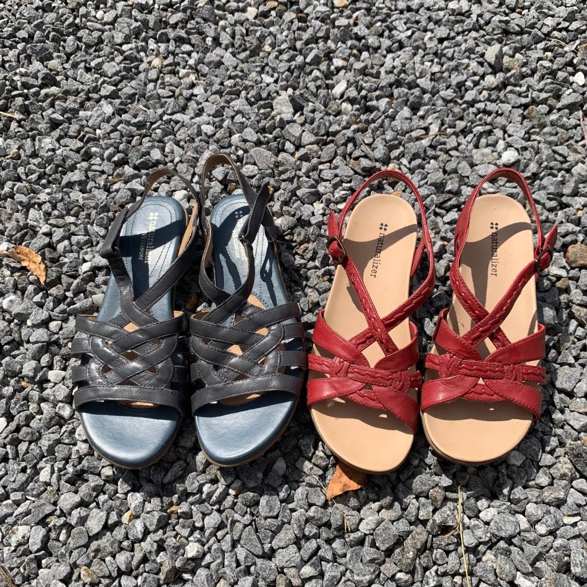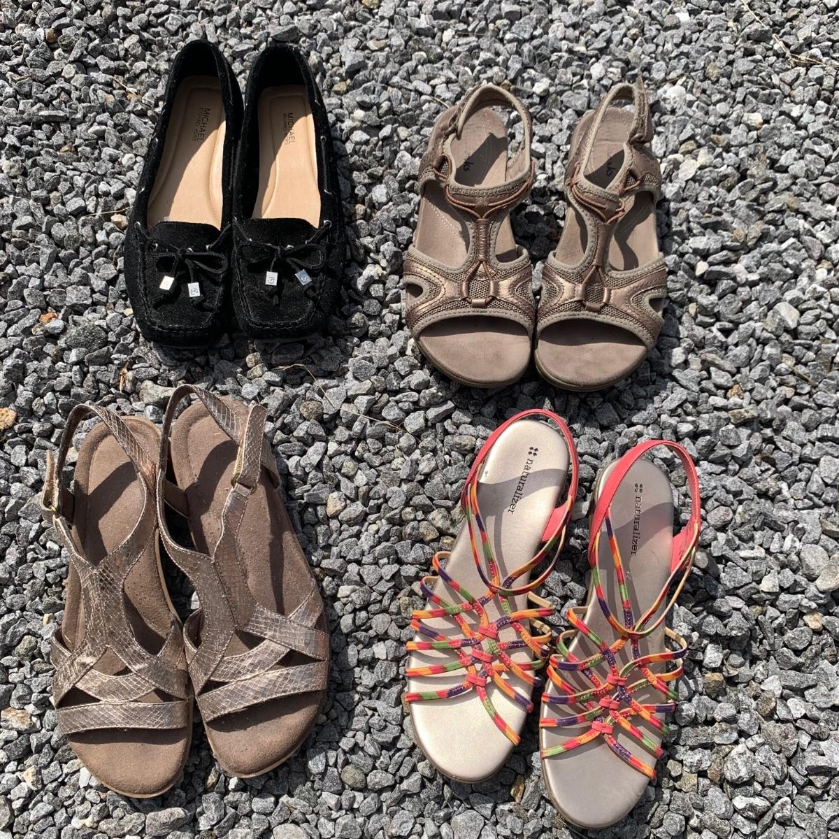 13 total pairs of shoes and sandals. Ten are Naturalizer brand, and there is one pair of Michael Kors, one pair of Clarks, and one pair of Abeo. Shoes are size 7 and 7.5. One pair of the Naturalizer flats has some scuffs on the toe; see photos.