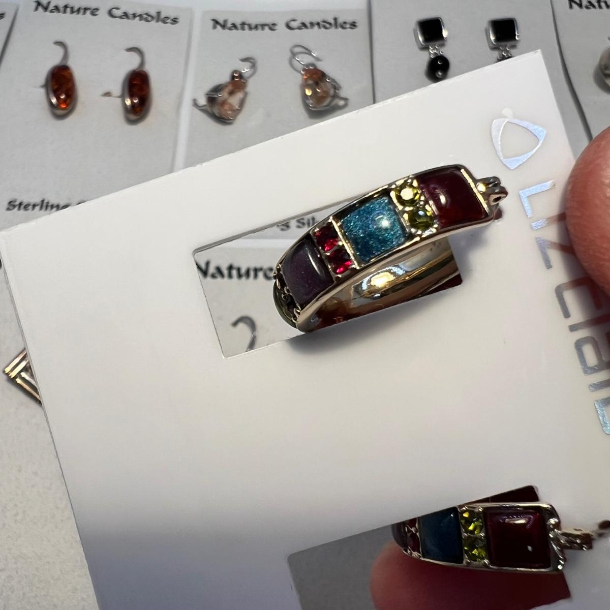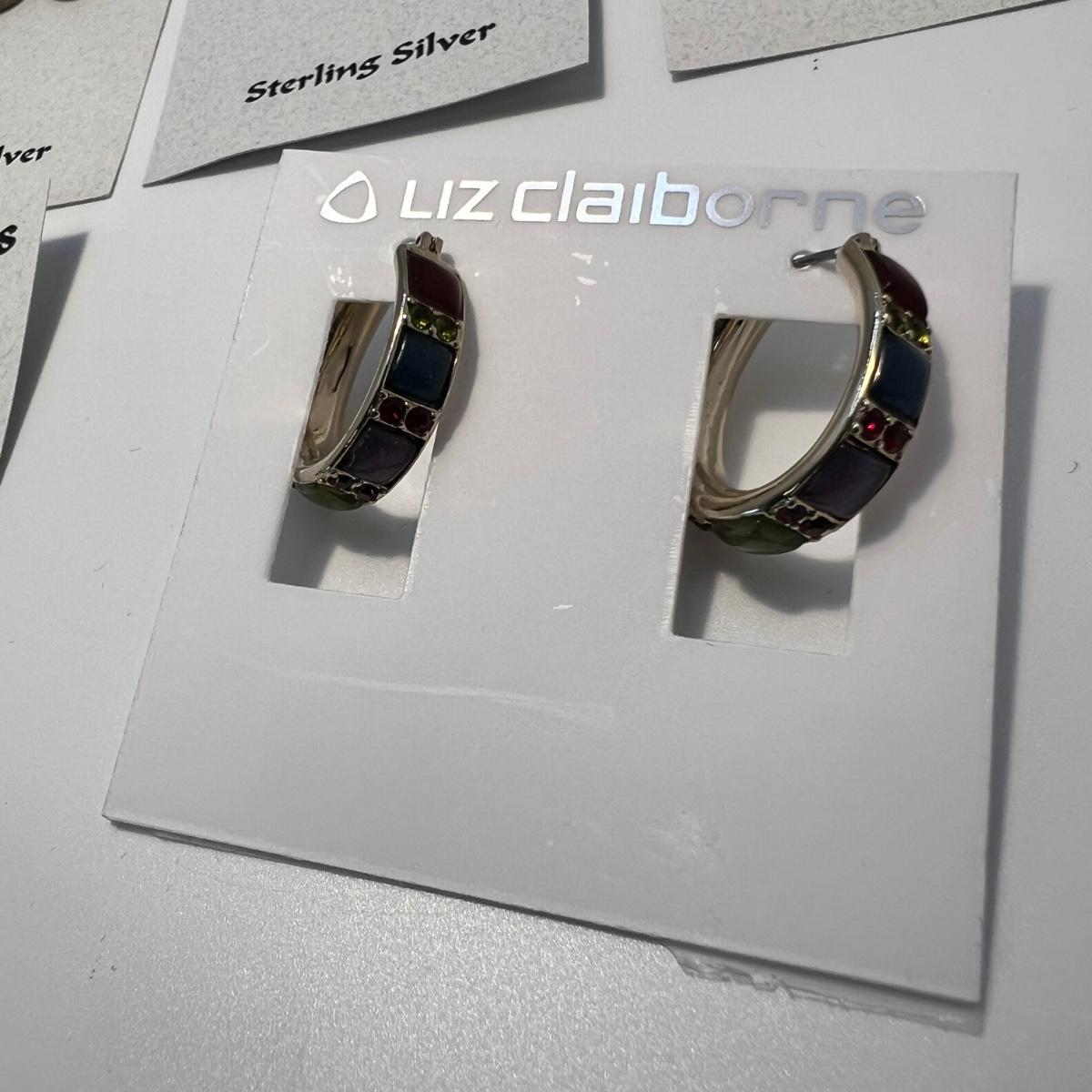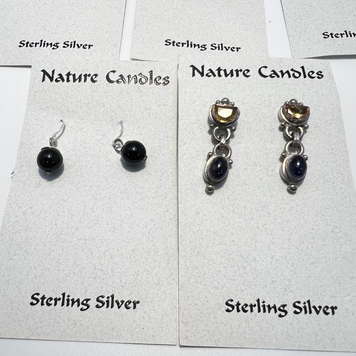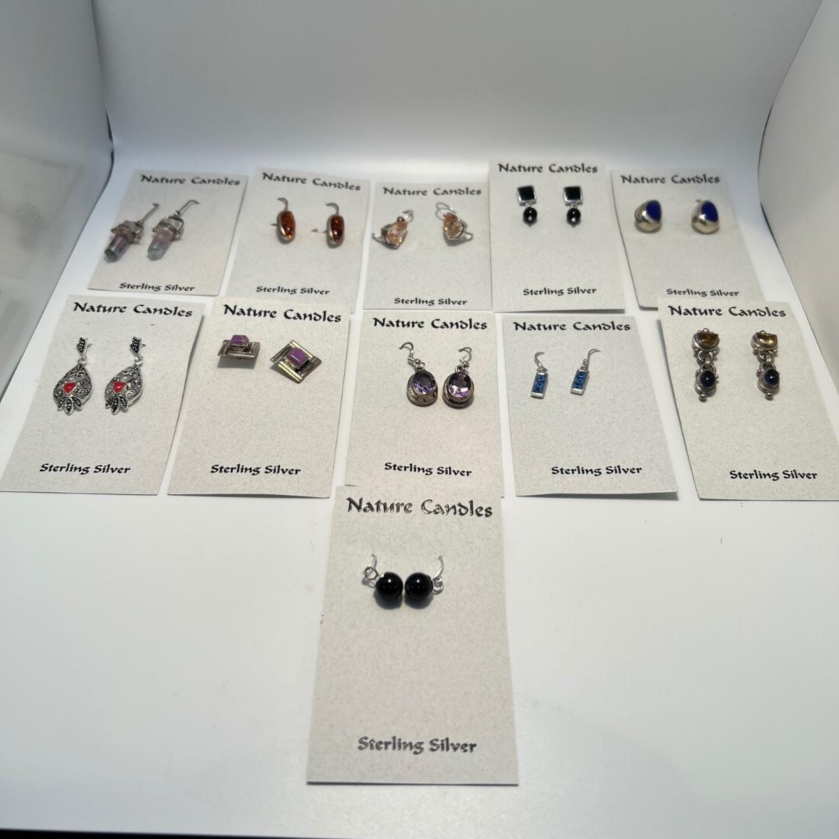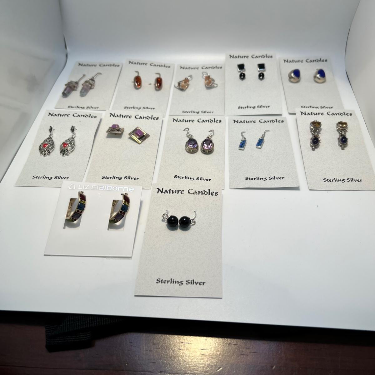 A dozen pairs of earrings for pierced ears. All but one pair are Nature Candles sterling silver earrings. The twelfth pair are Liz Claiborne and not marked. Some earrings have glass, others have stones.