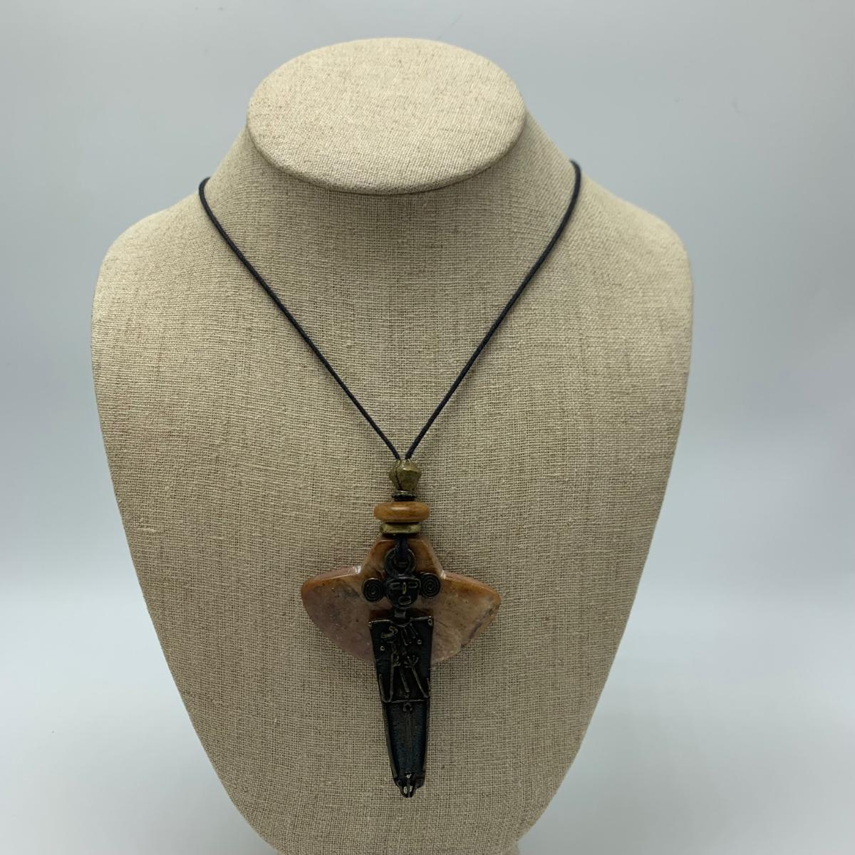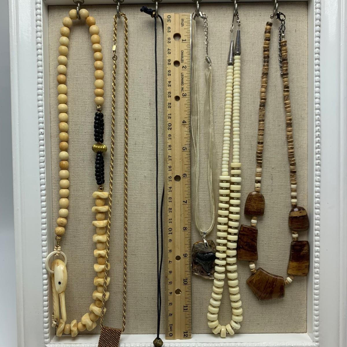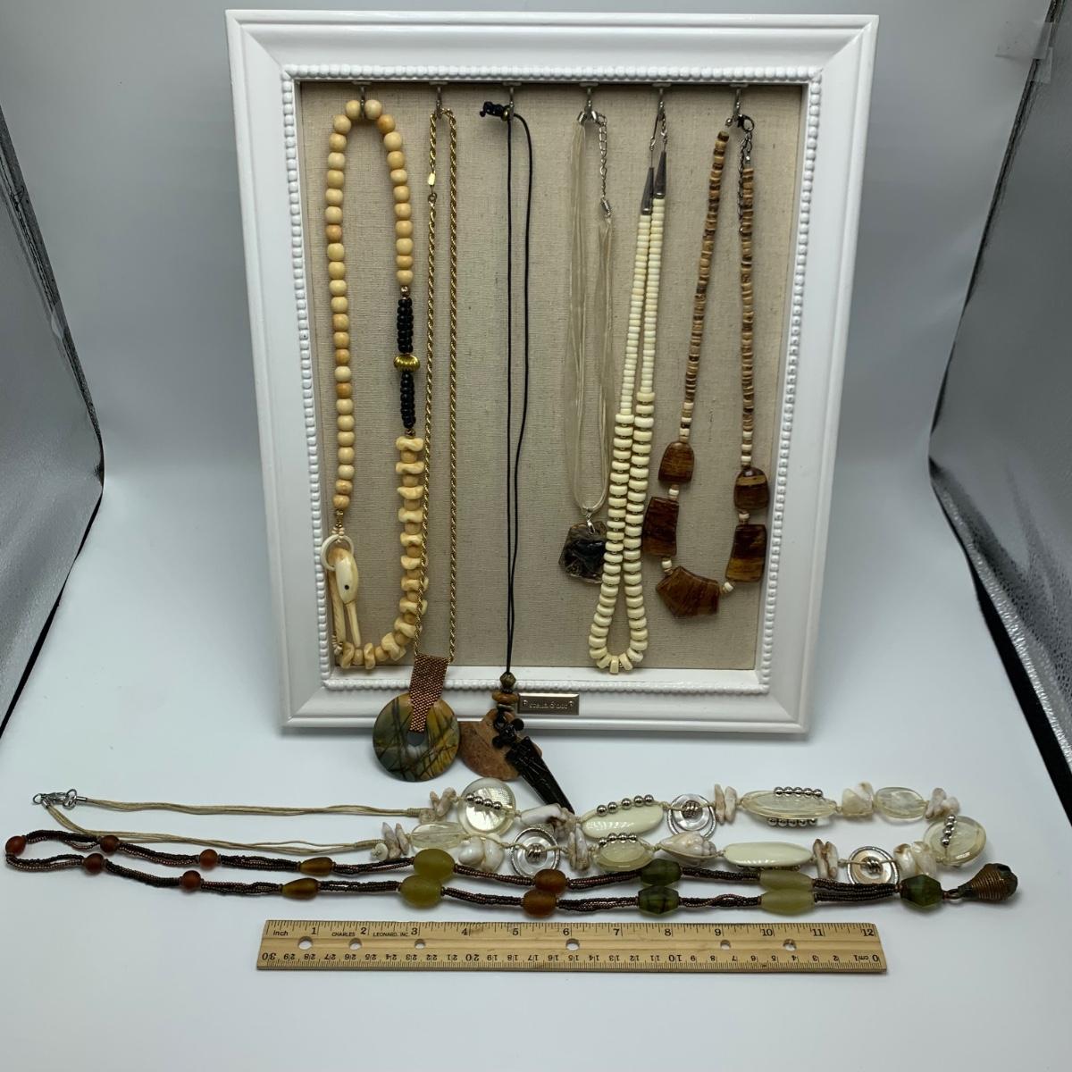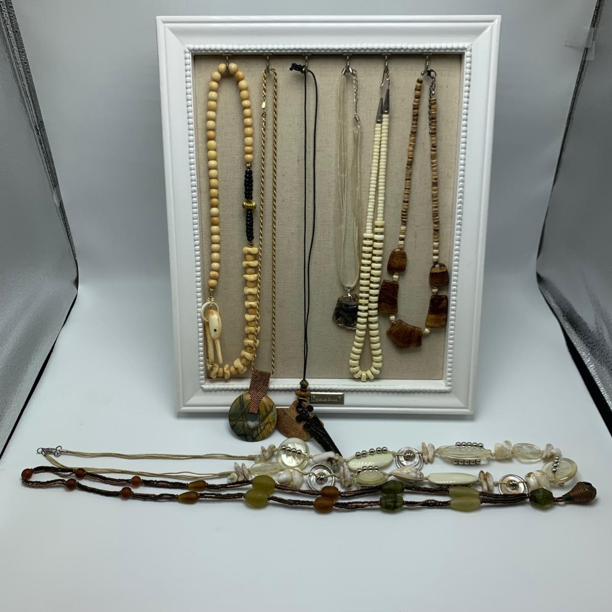 A collection of eight necklaces, one bracelet, two pairs of dangly earrings for pierced ears, and one loose shell pendant; most made with earthy nature-based materials like stones, wood, & shells. Most necklaces are on the longer side. The longest is the white necklace with seashell type beads which is approximately 40”. The shortest is the necklace made of ribbon at 15”. All sales are final. No returns or refunds. Please bid accordingly.