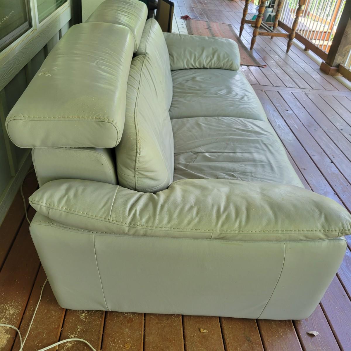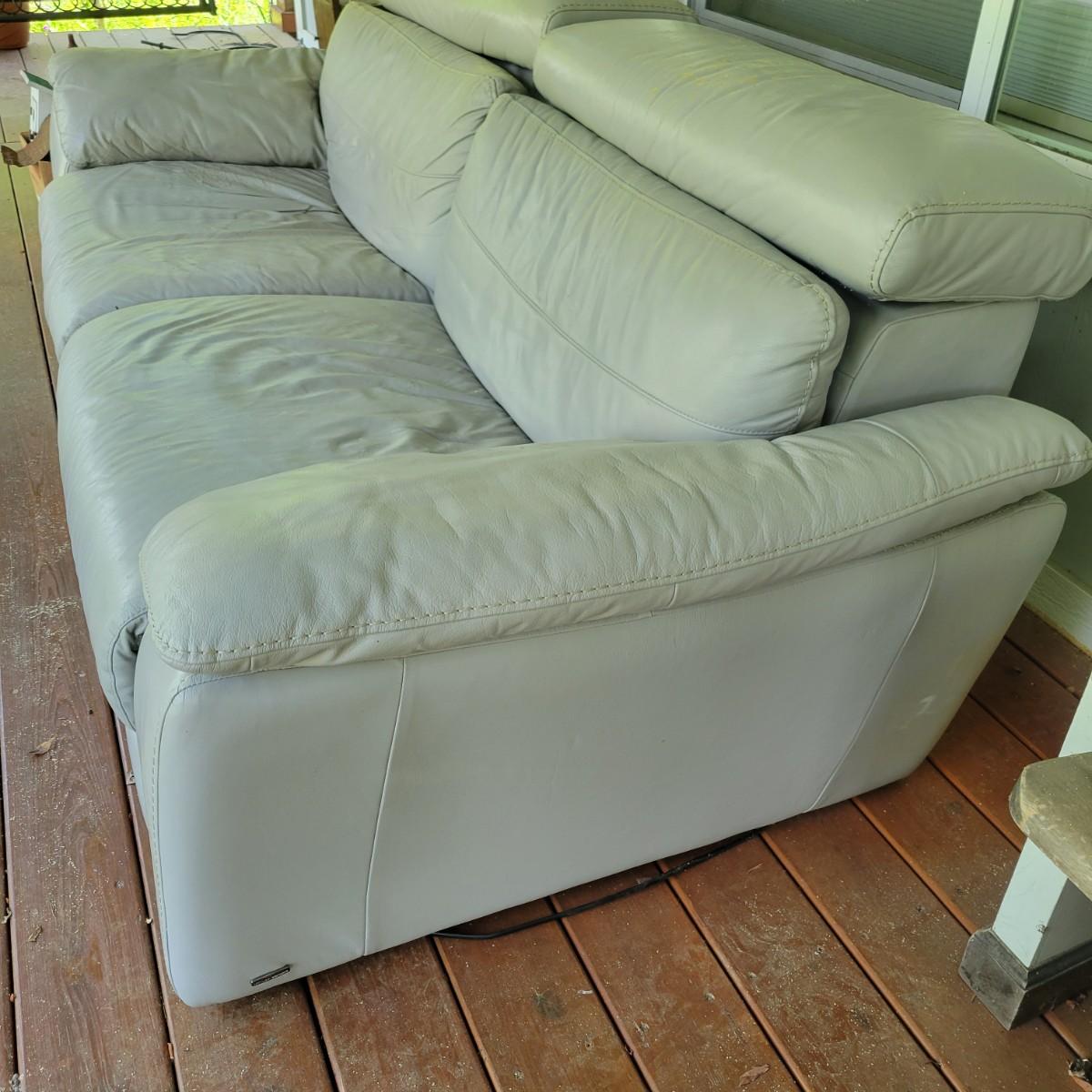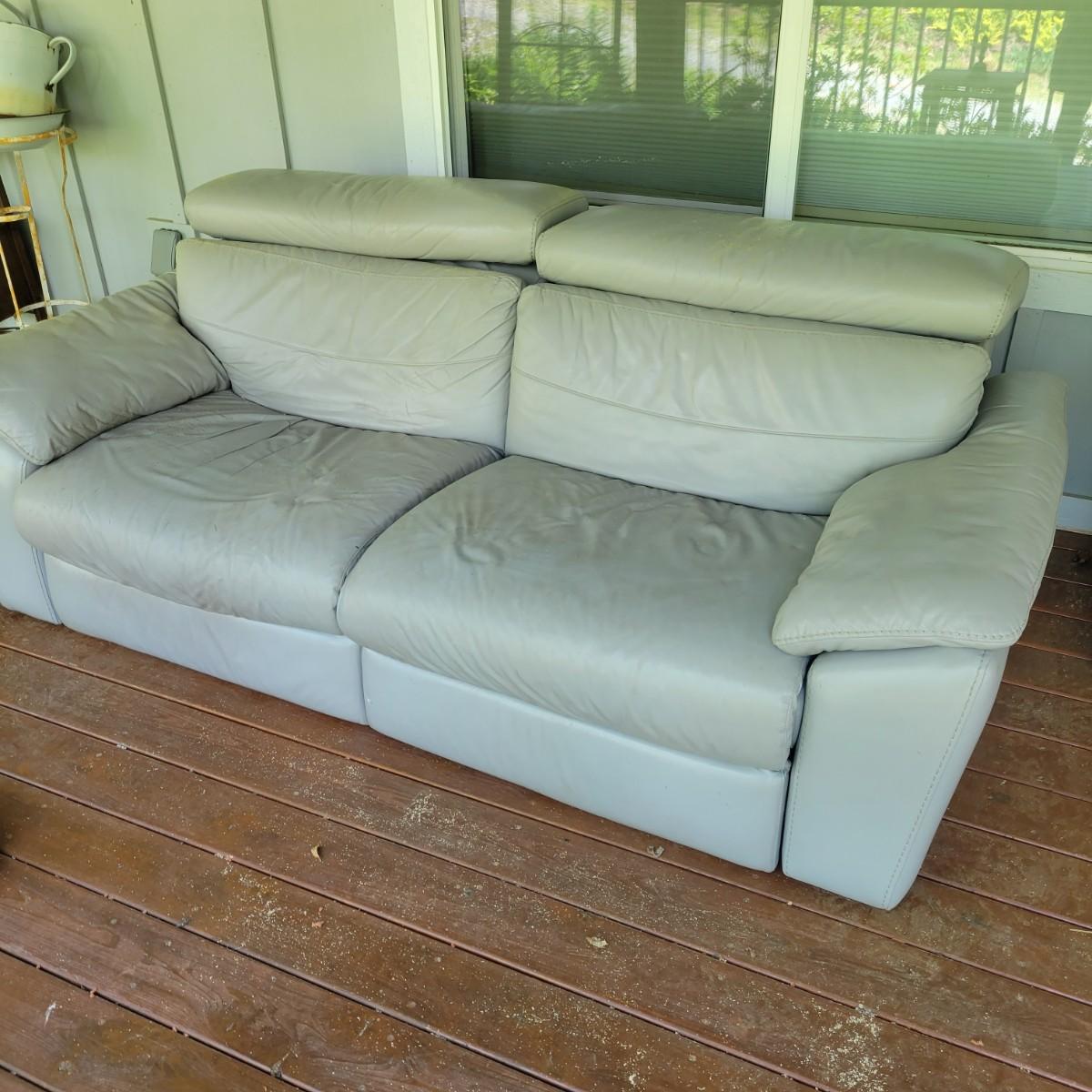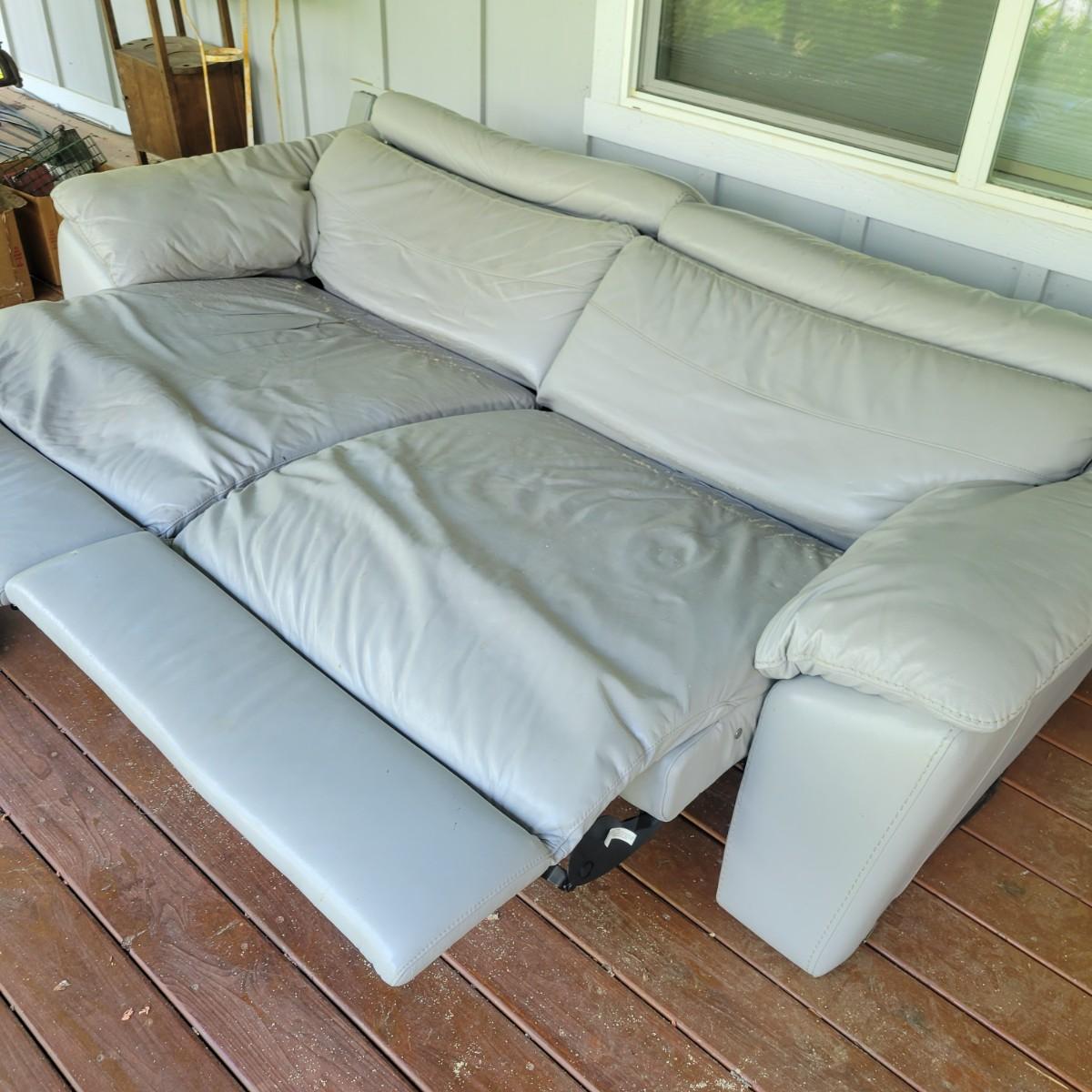 A Natuzzi Editions reclining couch that has a motor to control the reclining function. This couch is a grey faux leather that measures approximately 86" x 38" x 30"H with a seat height of 15 5". This couch has been on a covered deck and could use a good cleaning and the faux leather is peeling in some areas. The feet were removed, but are included. Cushions not removable. Local pickup only. Winning bidder must bring assistance to help move and load this item due to its weight and/or size.