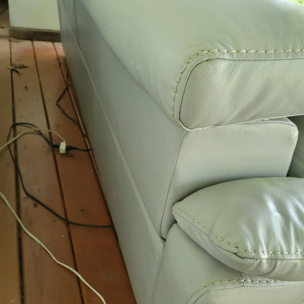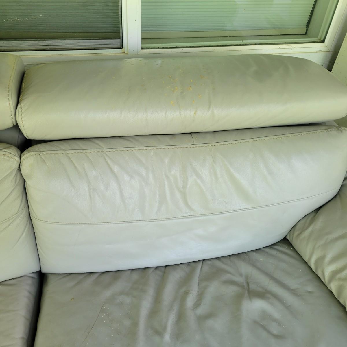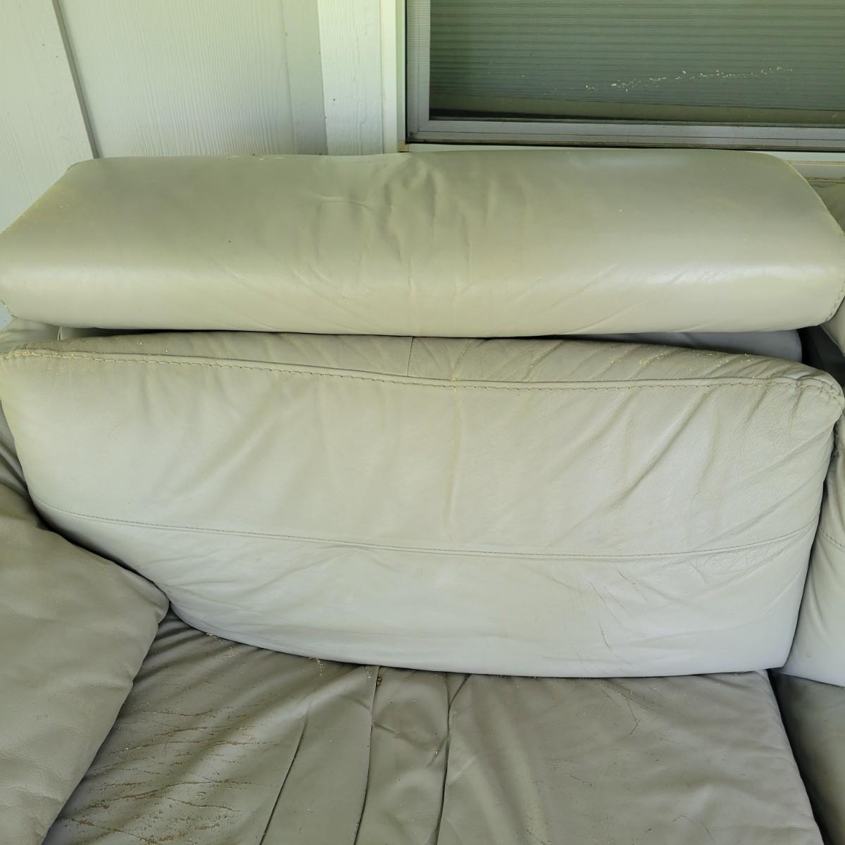 A Natuzzi Editions reclining couch that has a motor to control the reclining function. This couch is a grey faux leather that measures approximately 86" x 38" x 30"H with a seat height of 15 5". This couch has been on a covered deck and could use a good cleaning and the faux leather is peeling in some areas. The feet were removed, but are included. Cushions not removable. Local pickup only. Winning bidder must bring assistance to help move and load this item due to its weight and/or size.