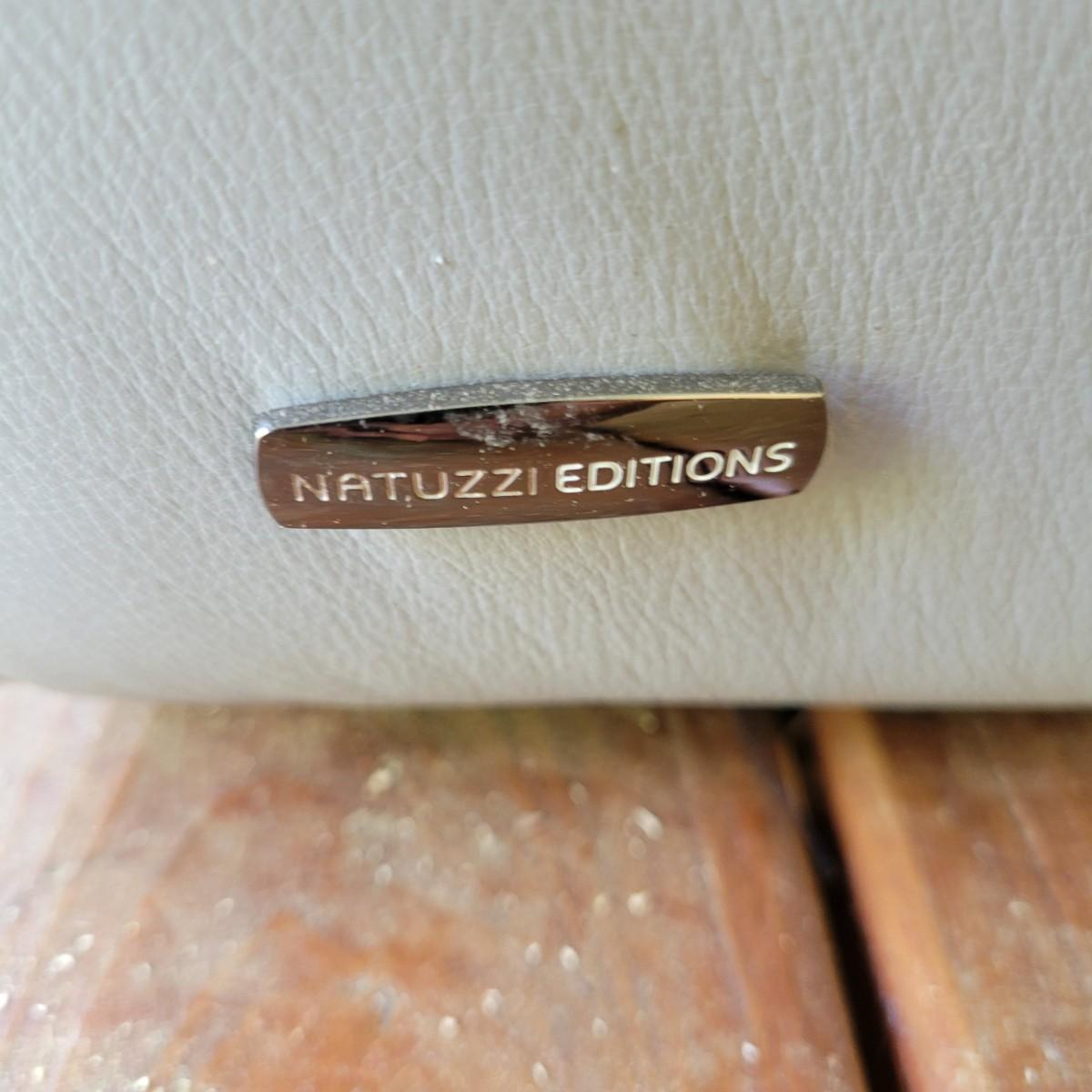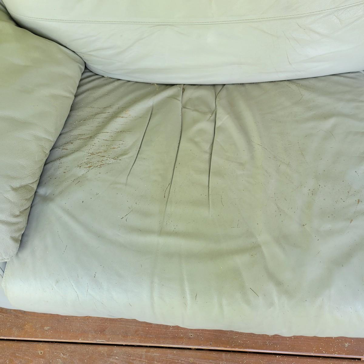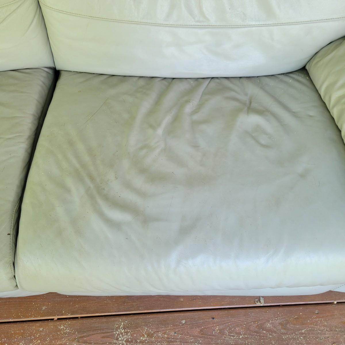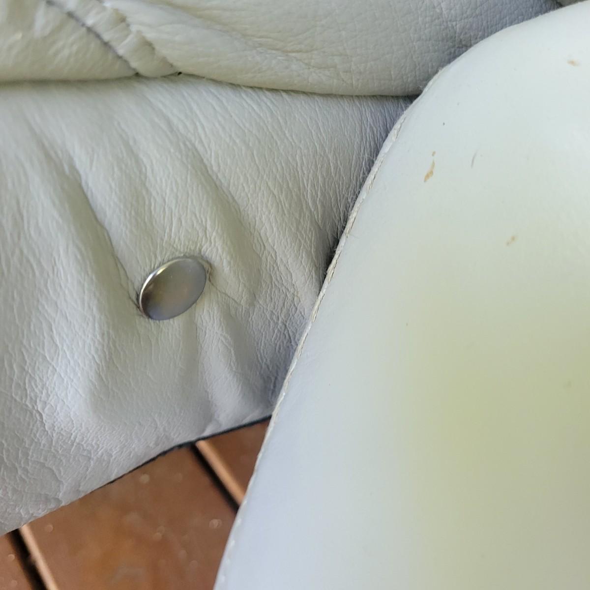 A Natuzzi Editions reclining couch that has a motor to control the reclining function. This couch is a grey faux leather that measures approximately 86" x 38" x 30"H with a seat height of 15 5". This couch has been on a covered deck and could use a good cleaning and the faux leather is peeling in some areas. The feet were removed, but are included. Cushions not removable. Local pickup only. Winning bidder must bring assistance to help move and load this item due to its weight and/or size.