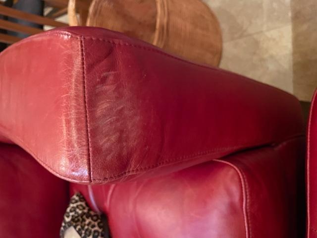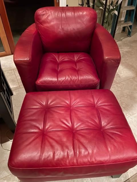 Natuzzi Red Leather Armchair w/Ottoman #2. Slight discoloration at the end of the arms and a little