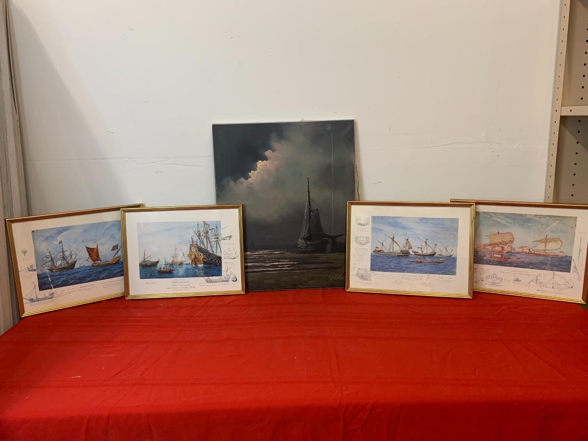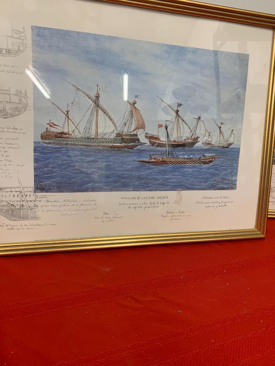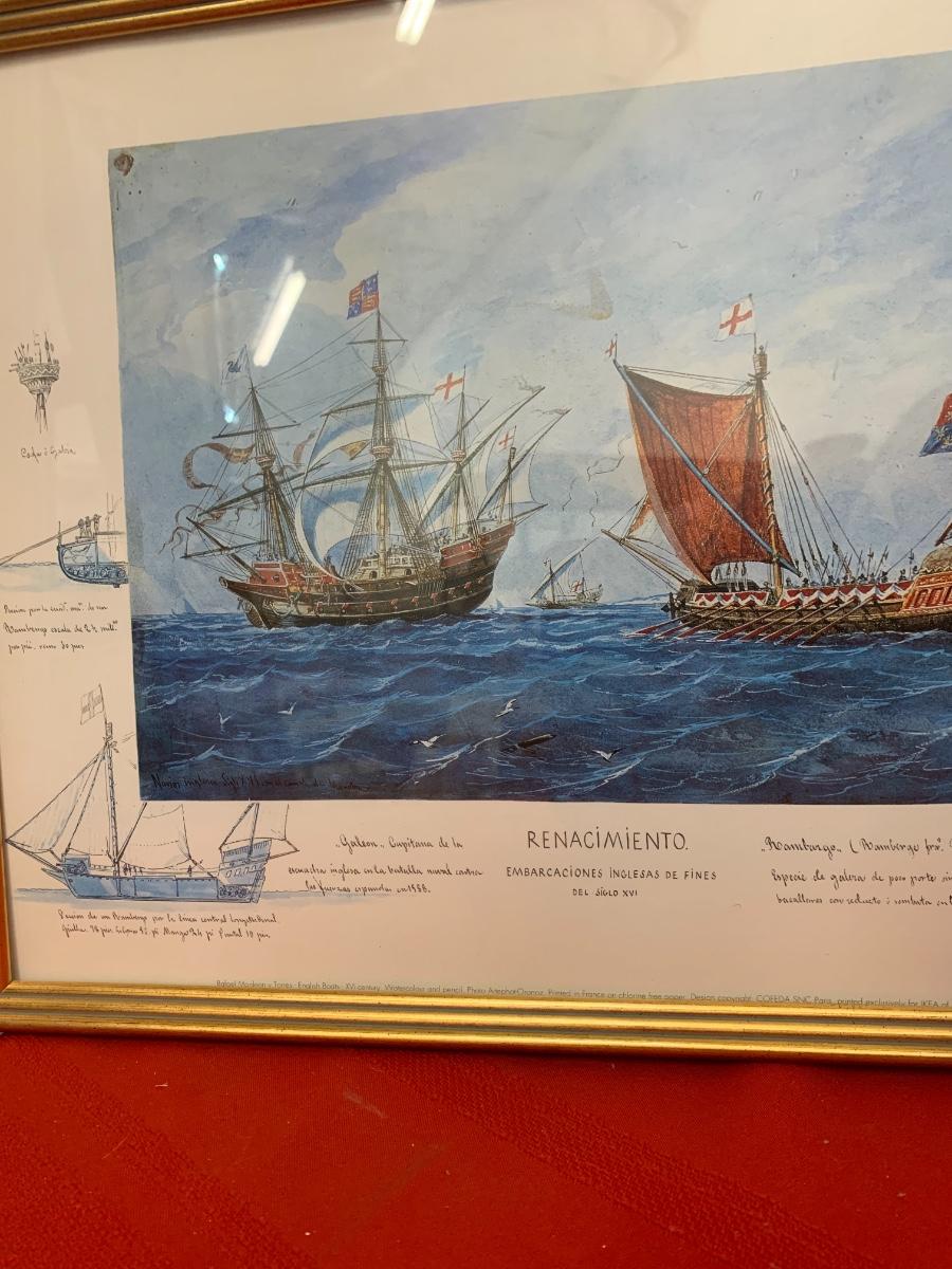 Nautical art pieces - Marina De La Edad Media, Embarcaciones Egiecias, Renacimiento, Fin Del Siglo XVI. Largest piece of art has minor damage on the upper left side (23.5” x 19.5”) - The 4 others measure in at 17” x 13”.