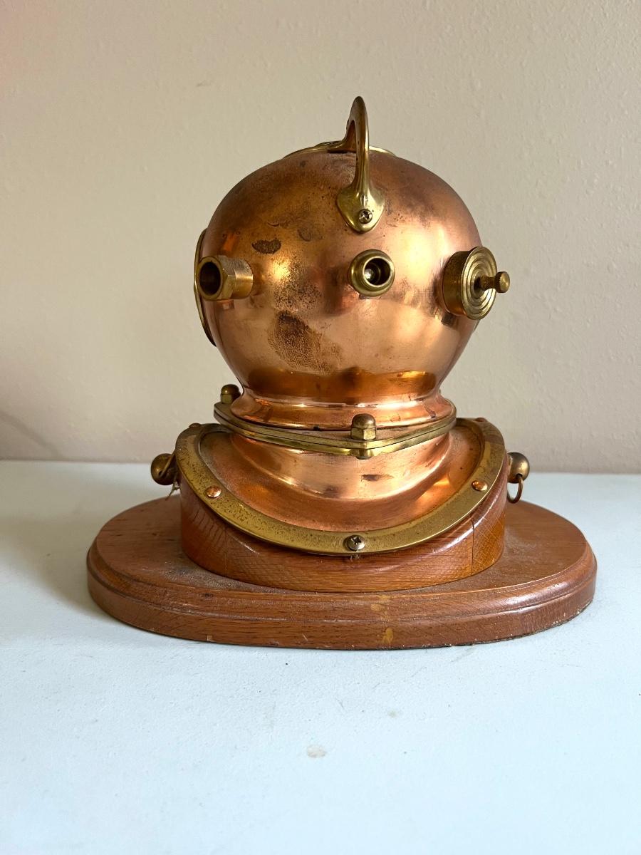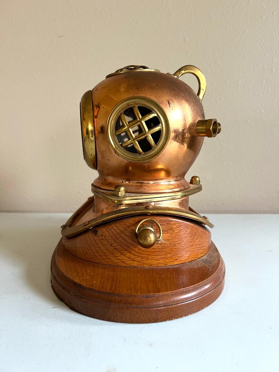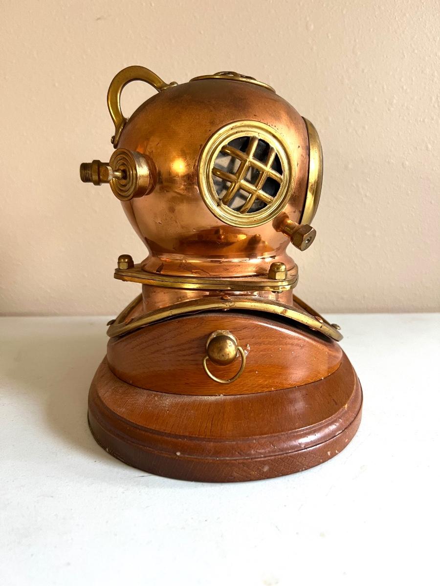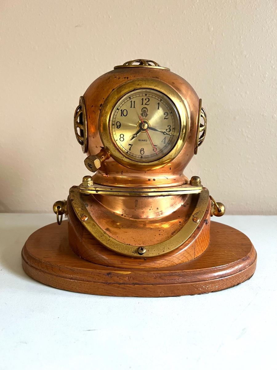 Nautical Diving Helmet Clock with wooden base. Measures 9 inches tall, 10 inches wide, 7 inches deep.