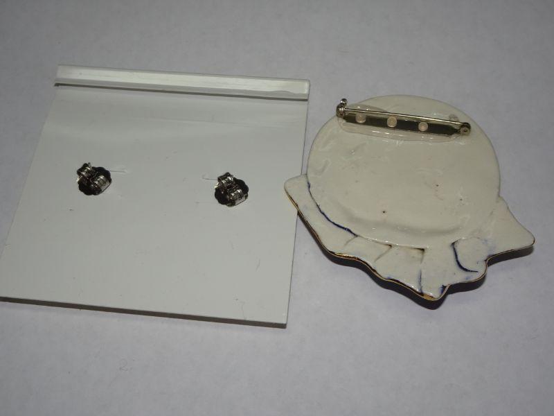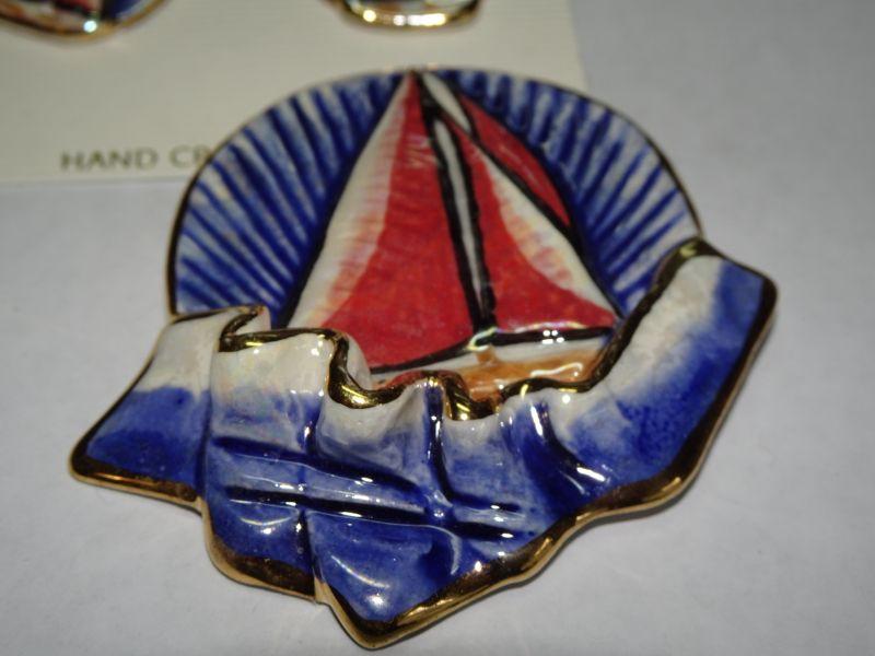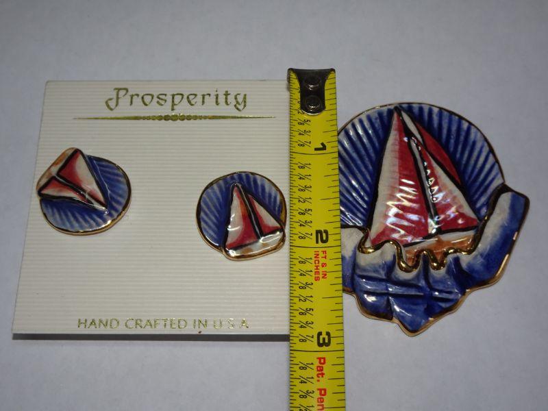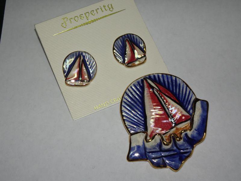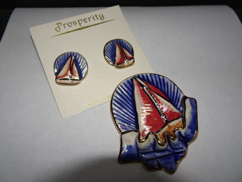 Nautical Sailboat Ceramic Brooch & Post Earrings, Prosperity