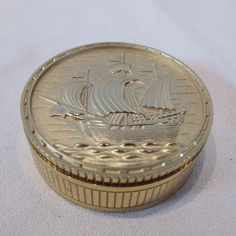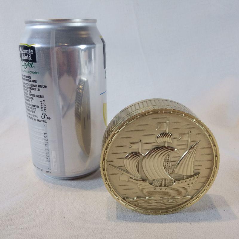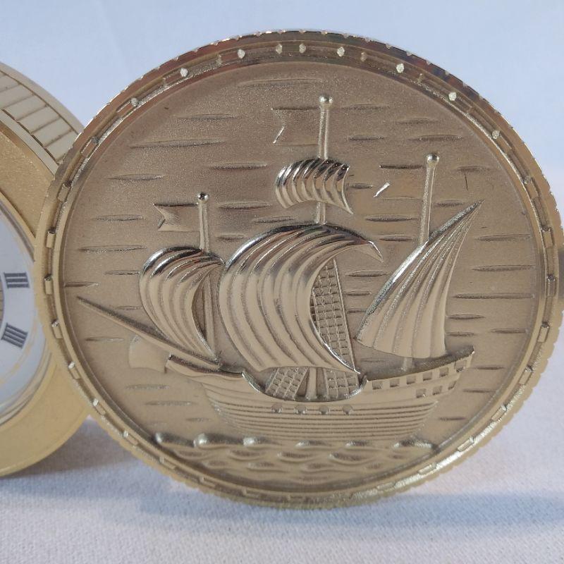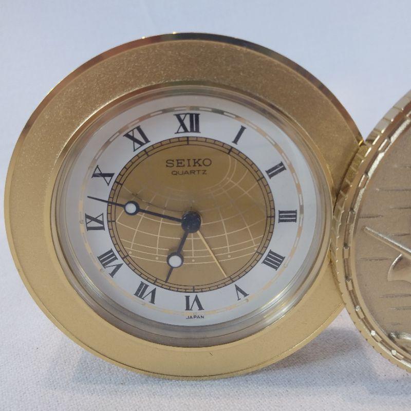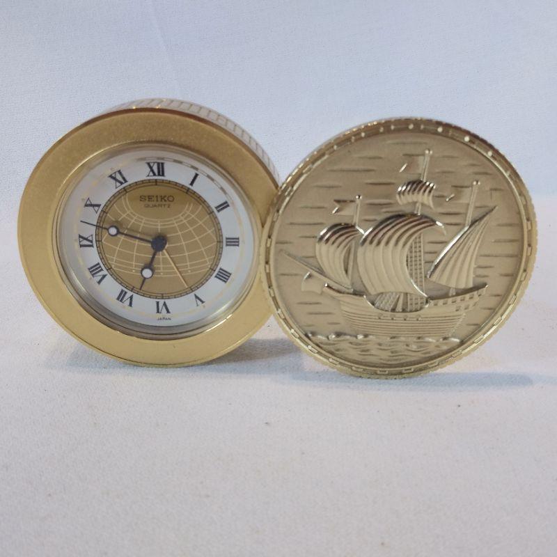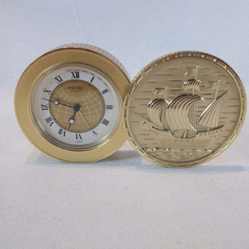 This is a very neat Seiko, nautical-themed Travel Alarm Clock. Folds up into a round box - 3-inches in diameter. Opened up it is 5 1/2-inches long. Quartz. Needs a battery. In very good condition.