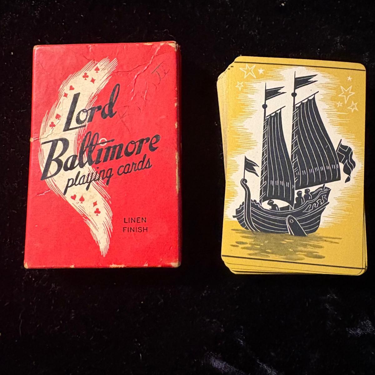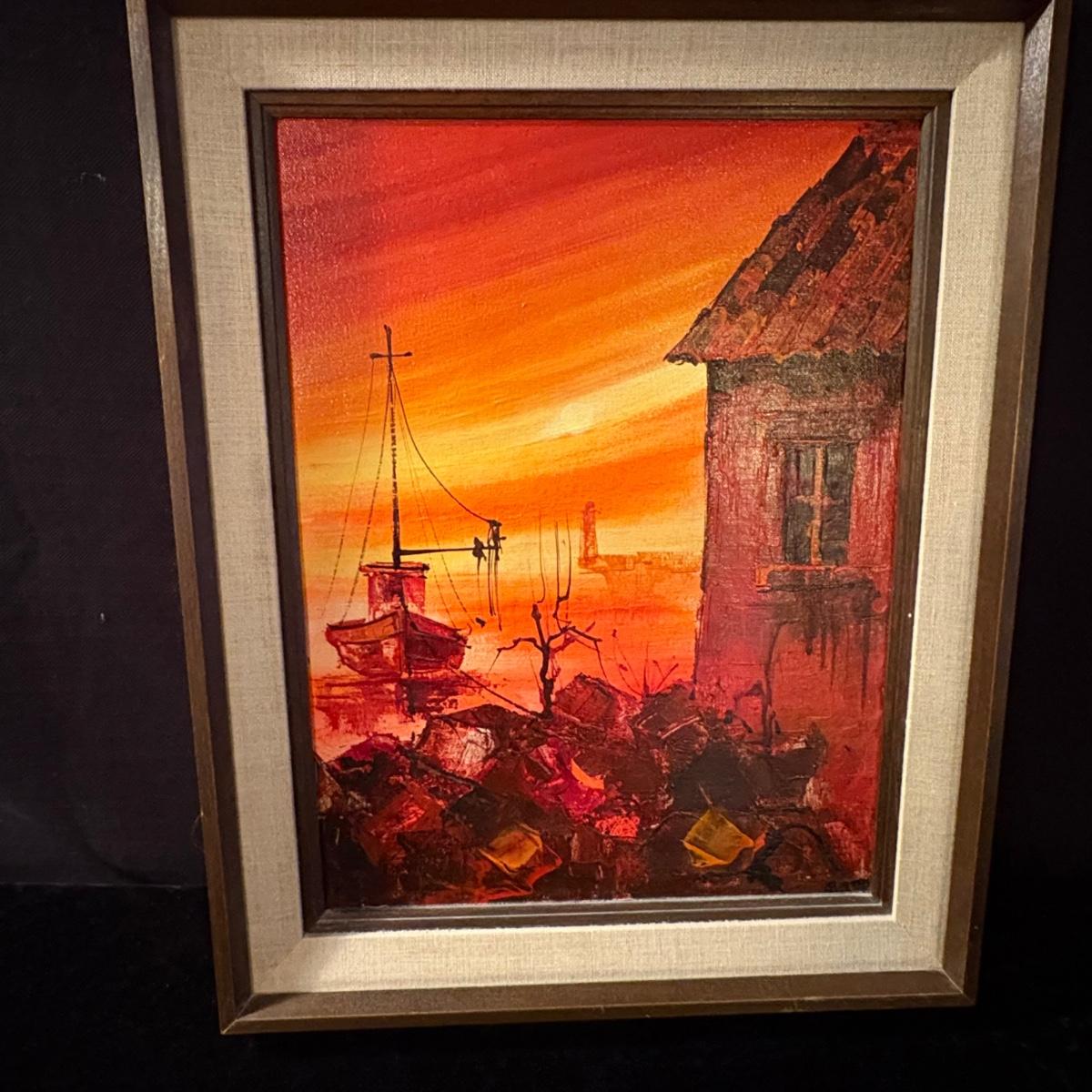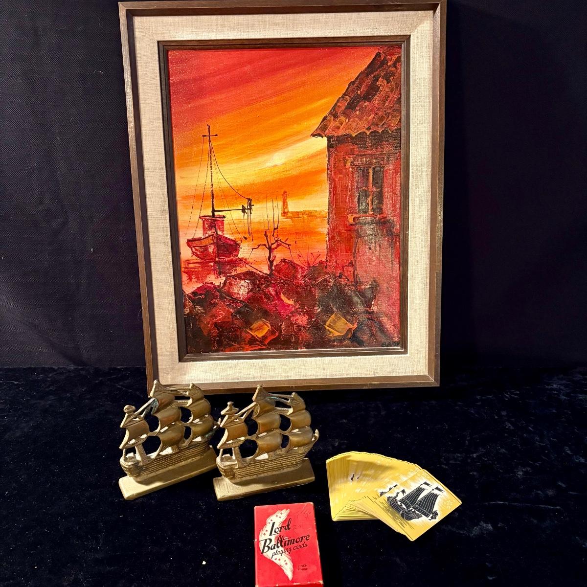 Painting is 15.5” x 19.5” and appears to be oil or acrylic. The frame is without glass and art has a linen and wood style matting and frame. Brass bookends and vintage 'Lord Baltimore' deck of playing cards.