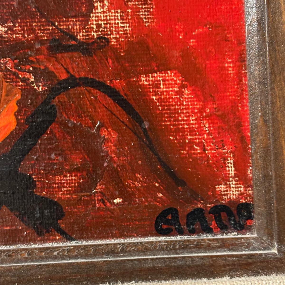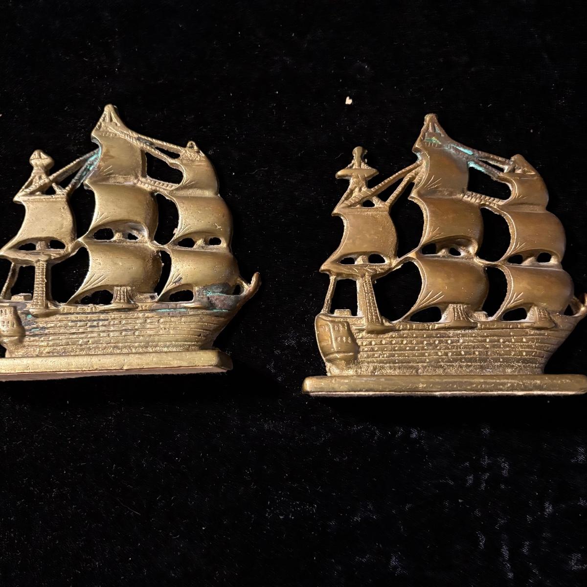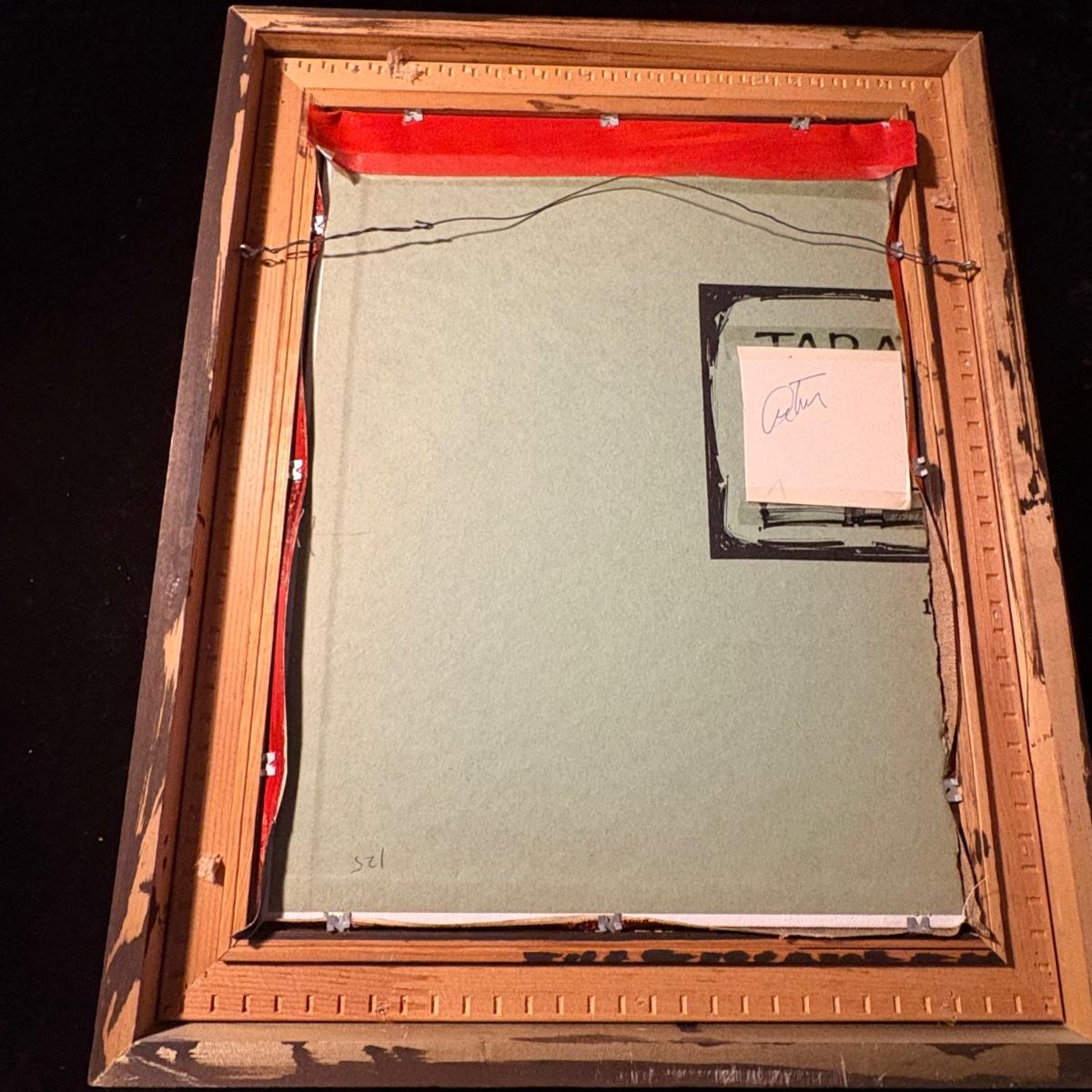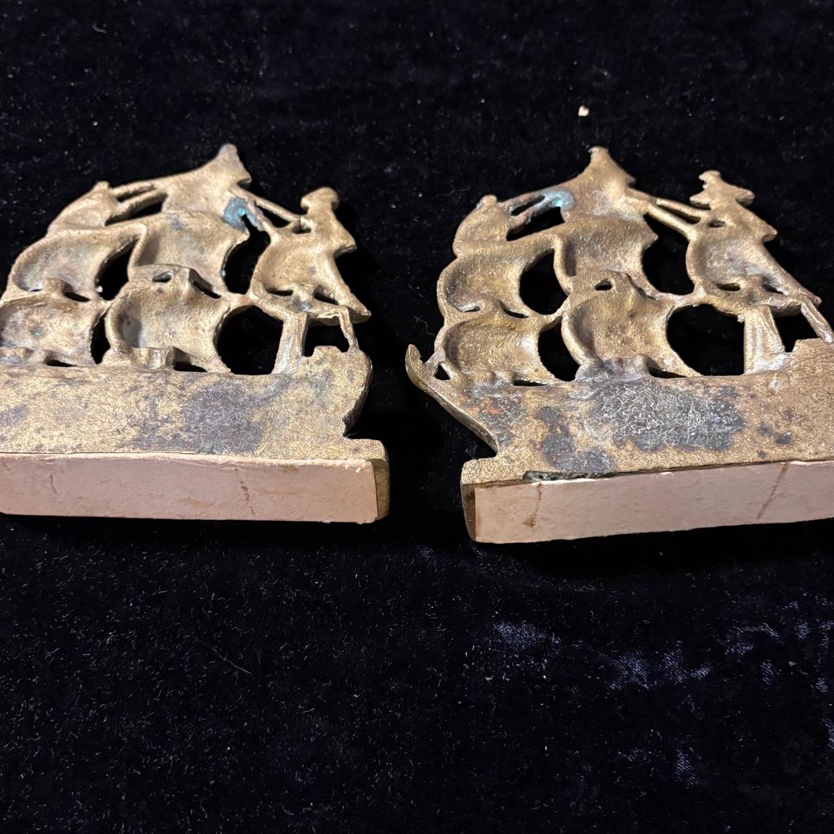 Painting is 15.5” x 19.5” and appears to be oil or acrylic. The frame is without glass and art has a linen and wood style matting and frame. Brass bookends and vintage 'Lord Baltimore' deck of playing cards.