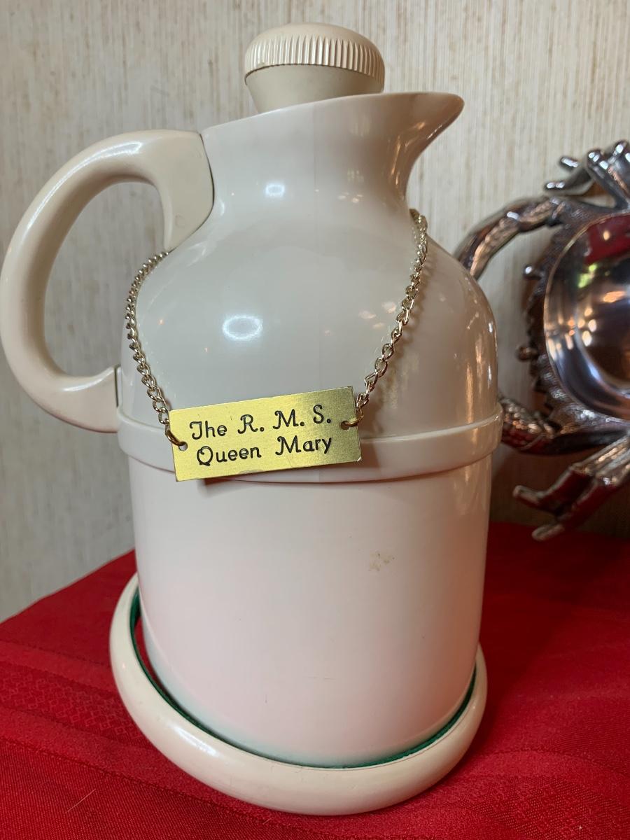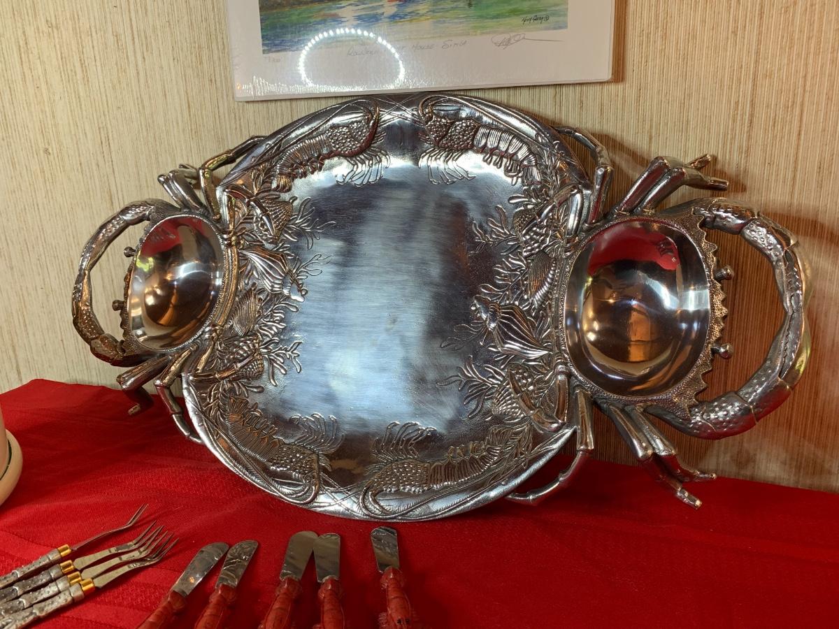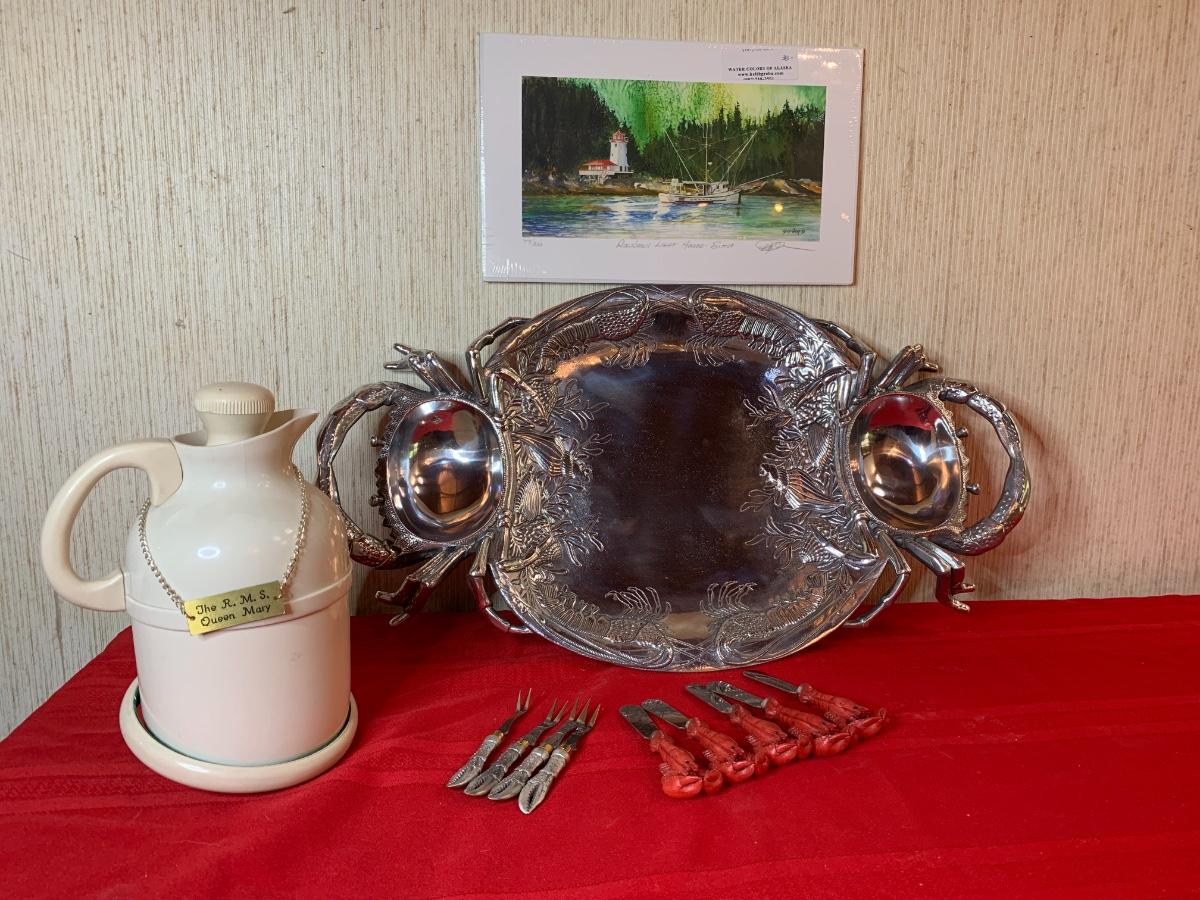 Silver crab tray and utensils, water print, Queen Mary Thermos jar.