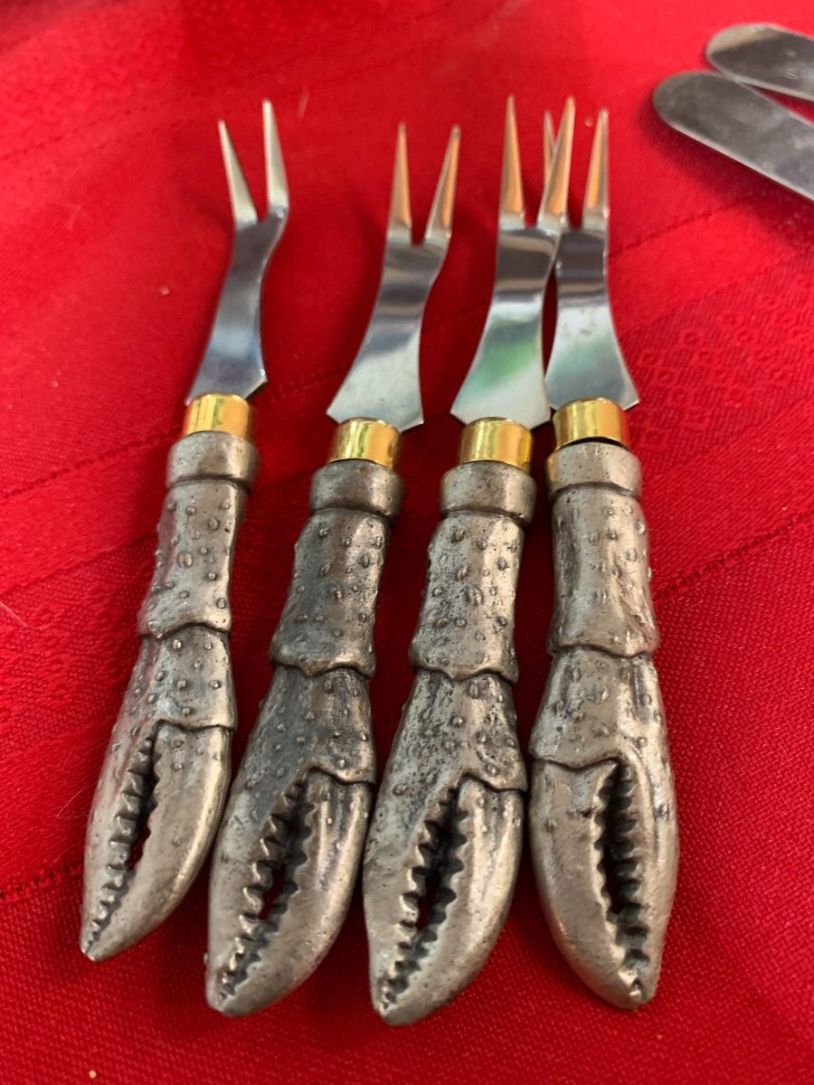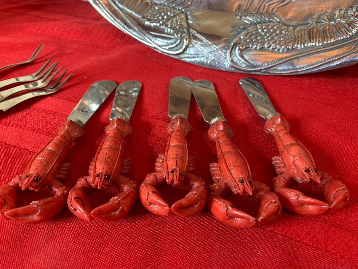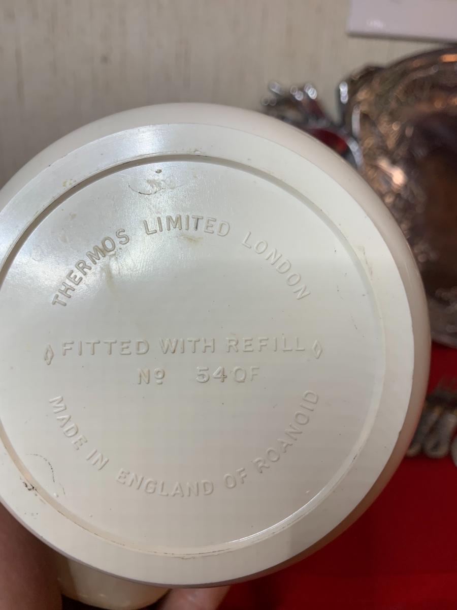 Silver crab tray and utensils, water print, Queen Mary Thermos jar.