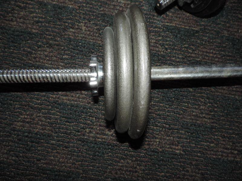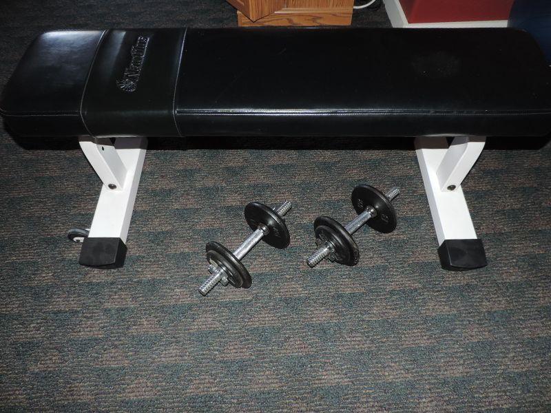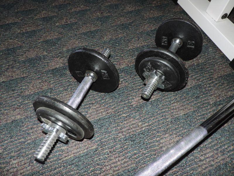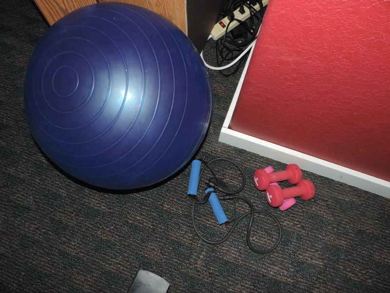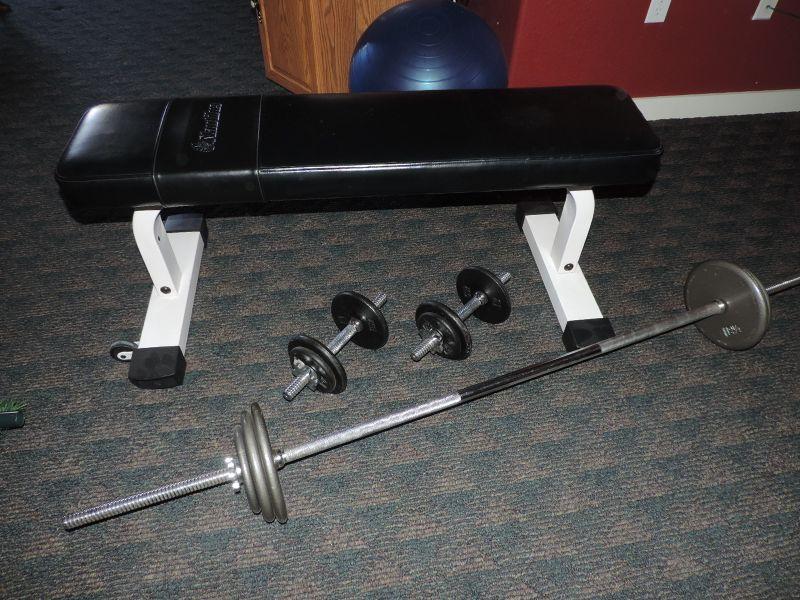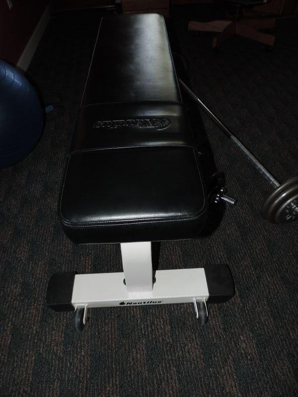 NAUTILUS BENCH IN GOOD CONDITION, BARBELLS WITH WEIGHTS UP TO 12 1/2', YOGA BALL, 3 POUND HANDWEIGHTS AND ARM STRETCH