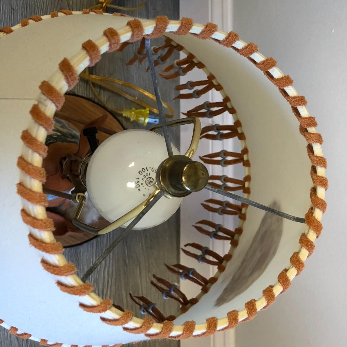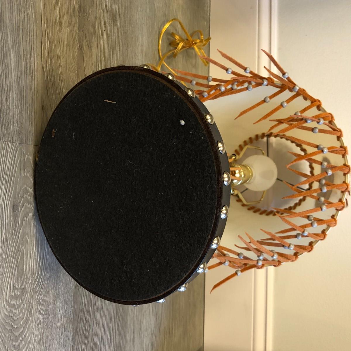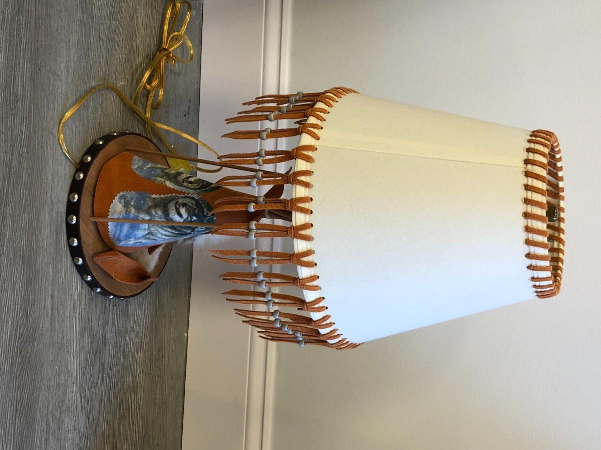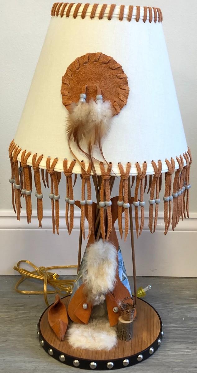 Description: Navajo Campfire lamp with shade Measurement approximate: Lamp: 20 H / Shade: 9 H (Inches)Material: Metal/ Wood
