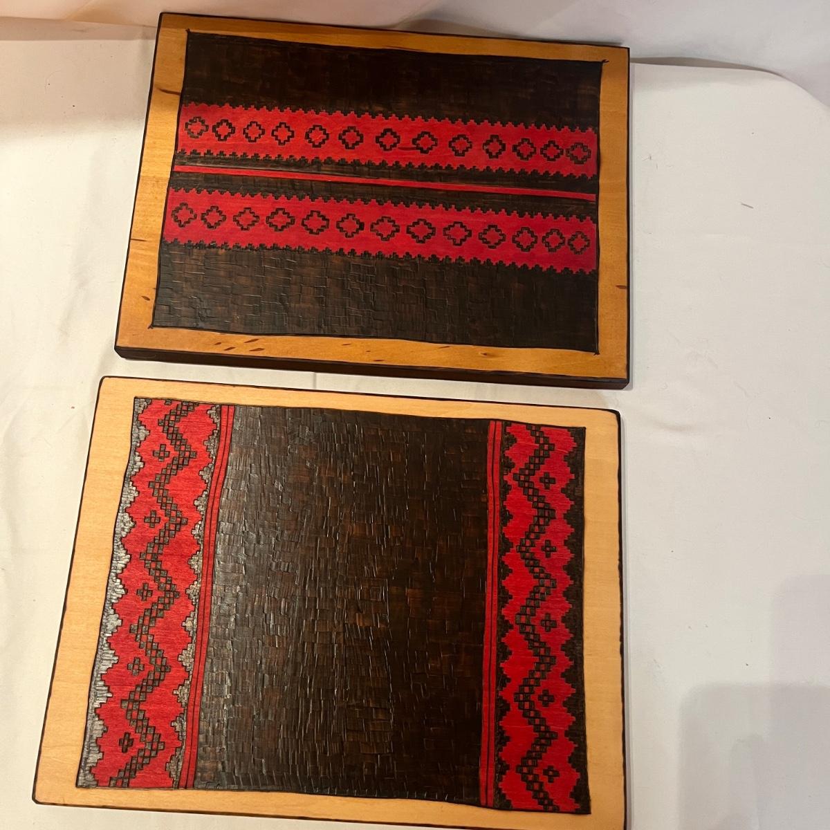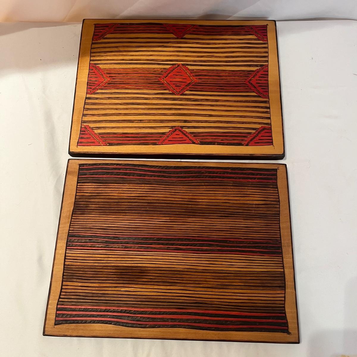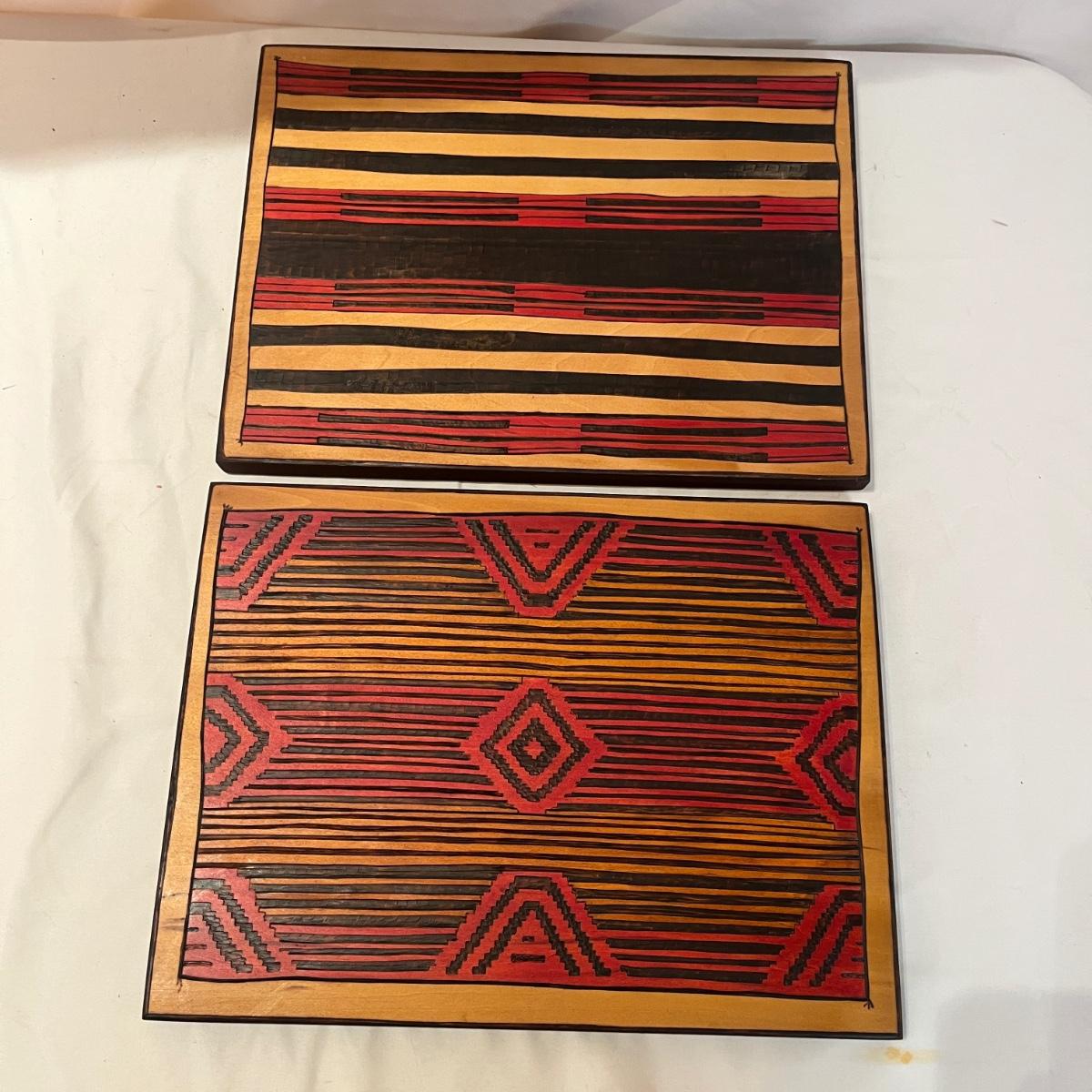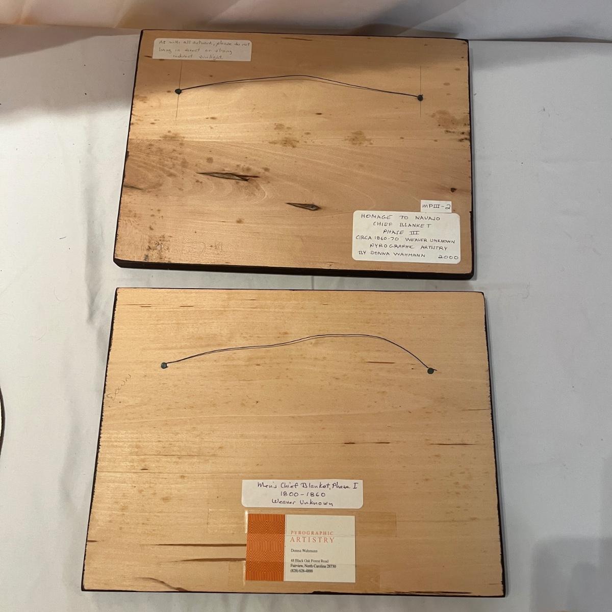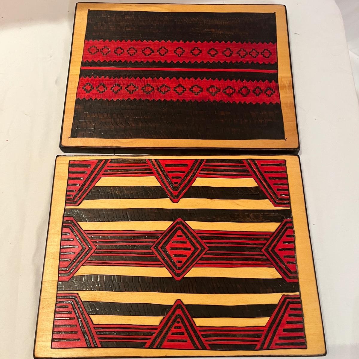 This Navajo & Hopi Ceremonial blanket inspired designs of pyrographic art includes ten pieces that measure 13.5” x 10”H and one large piece that measures 27” x 18”H. All pyrographic art made by Donna Wahmann.