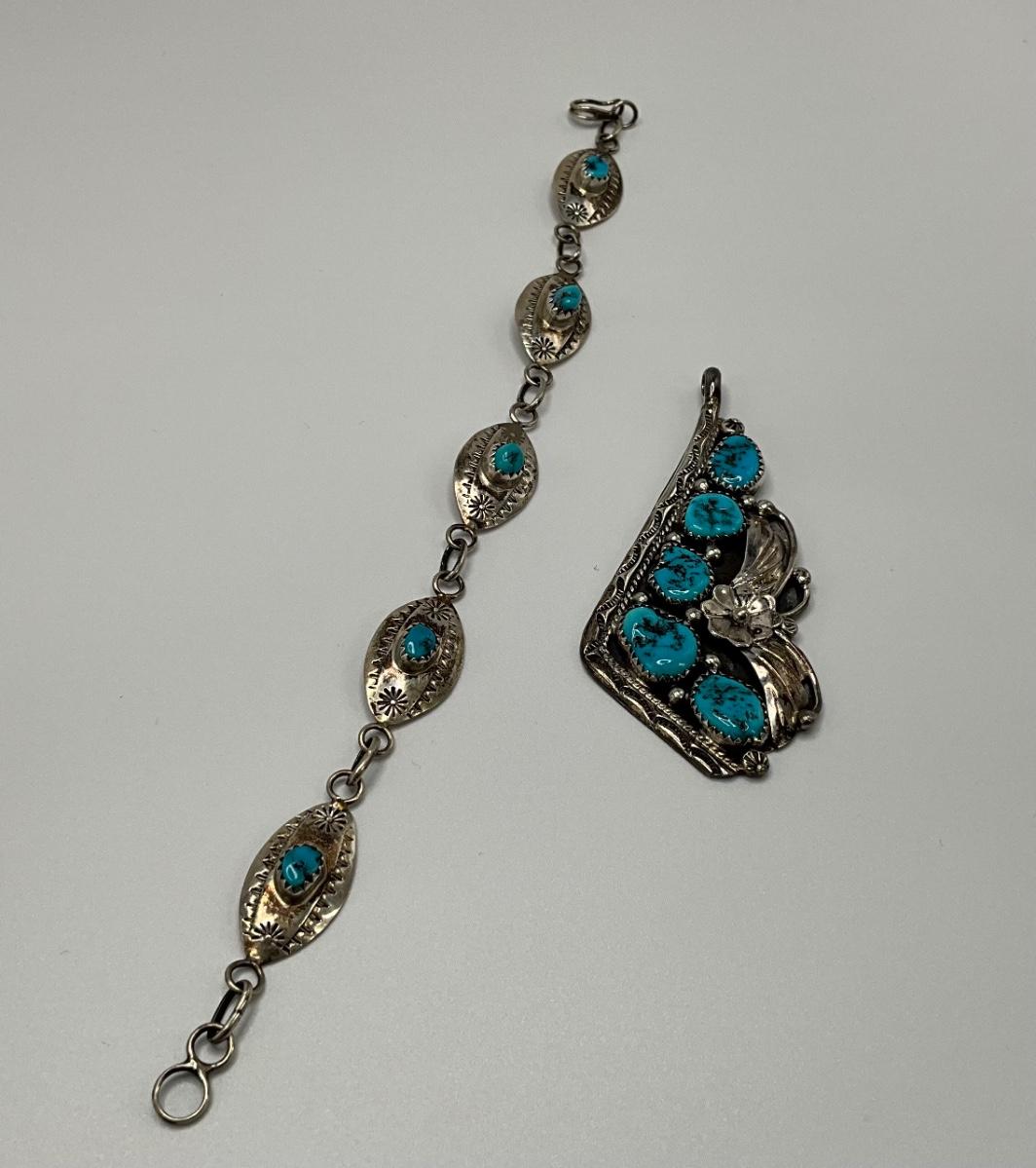 Navajo Pendent with bracelet, sterling with turquoise stones