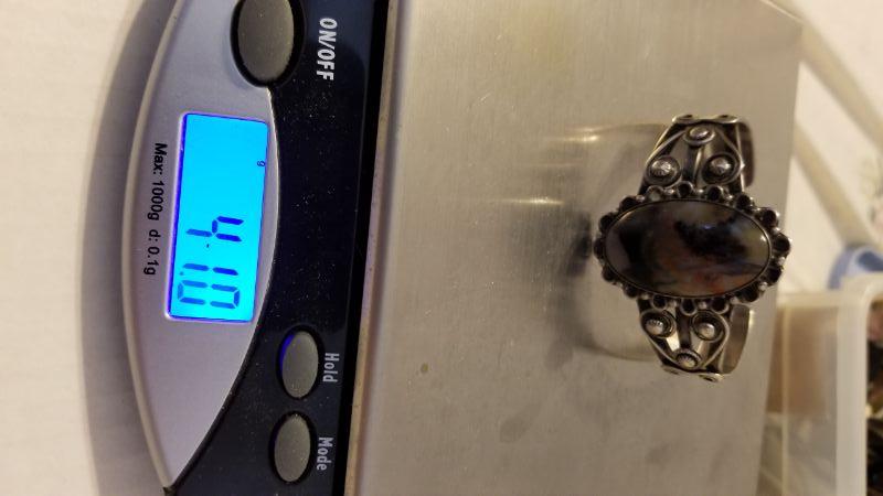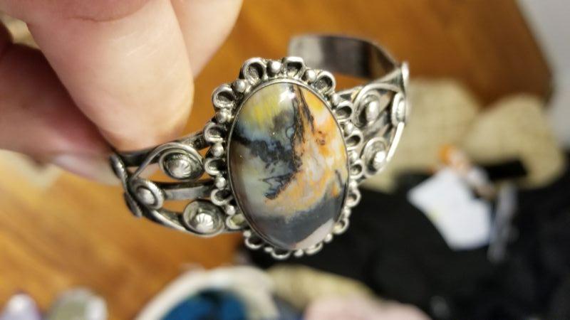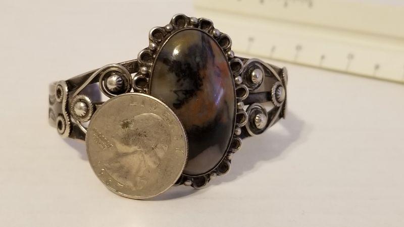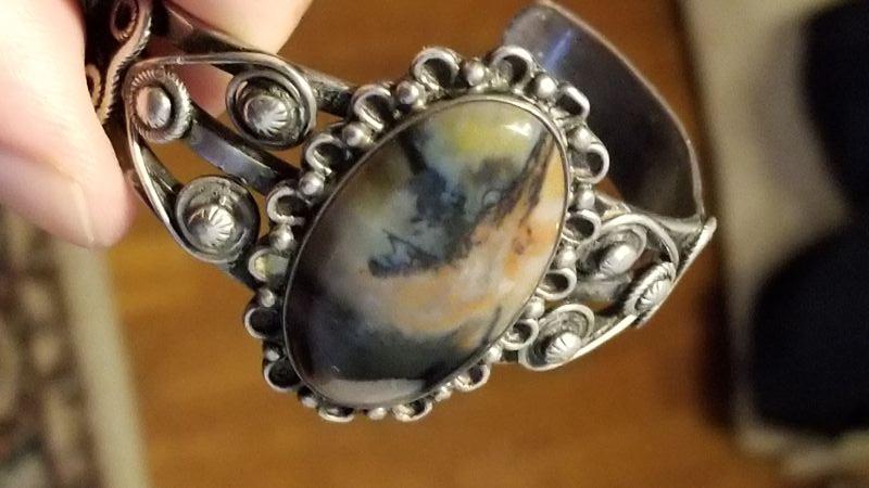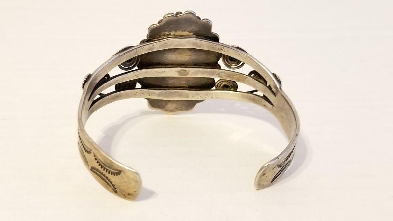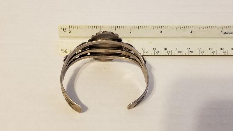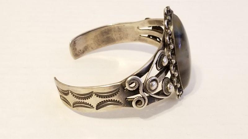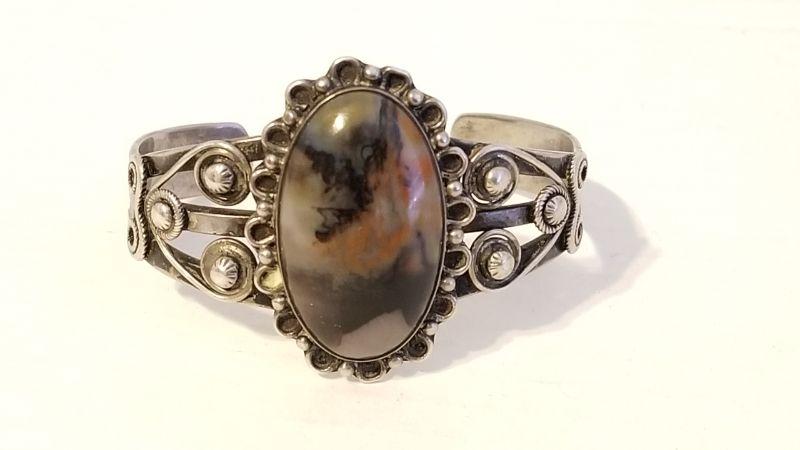 Breathtaking Navajo, tested Sterling (not marked), cuff bracelet. Stone is assumed to be petrified wood, but not 100% sure. Cold to the touch. Photographed in two different lighted areas - no flash or editing was done. In bright light or sunny areas it looks like the cover photo, in avg room lighting it looks a bit darker, but the veins / variations are just exquisite either way. Buy it now options comes with free insured shipping. Otherwise shipping fee will be applied.