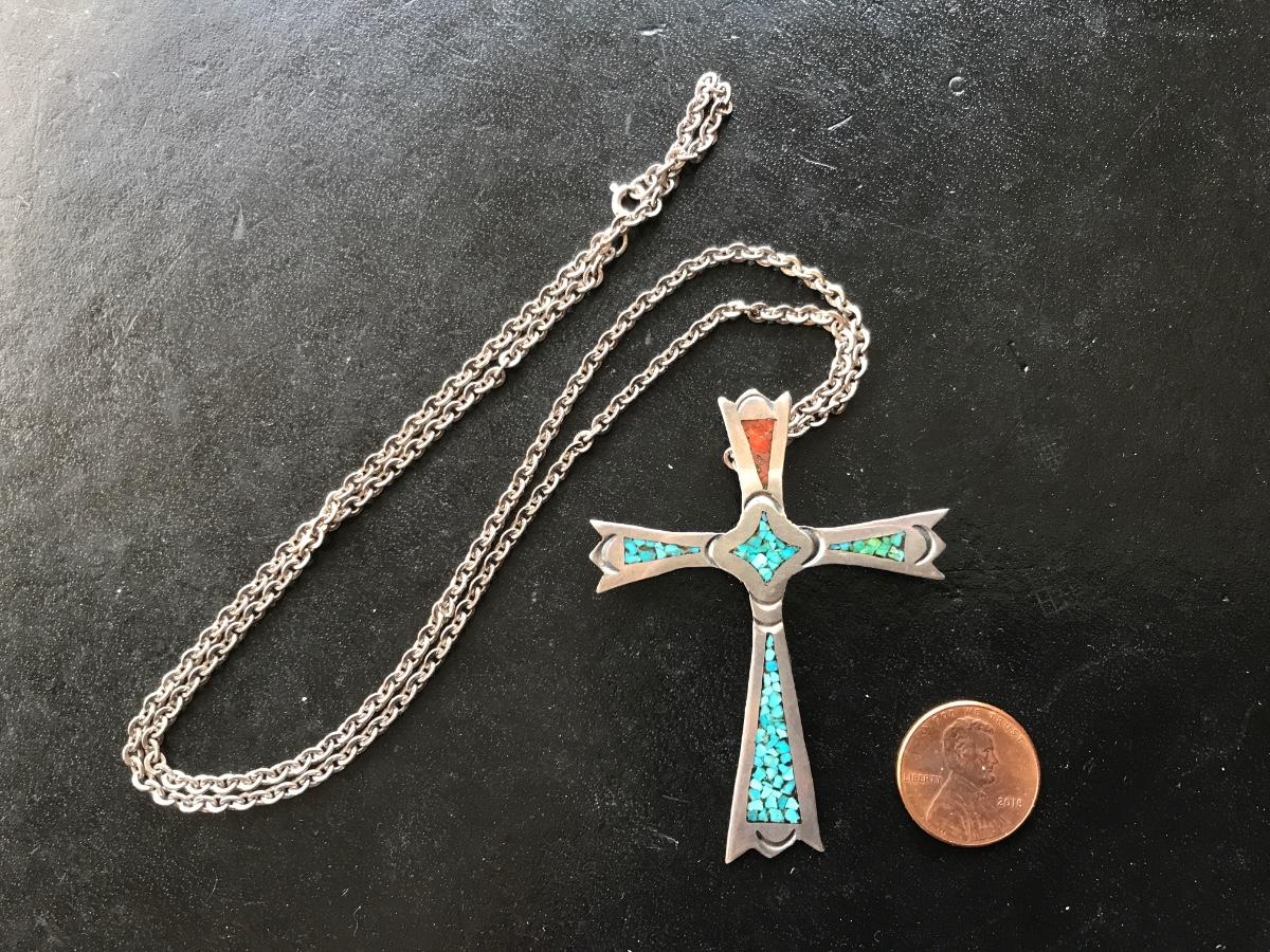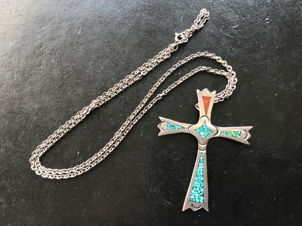 Sterling chain and cross with turquoise and spiny oyster