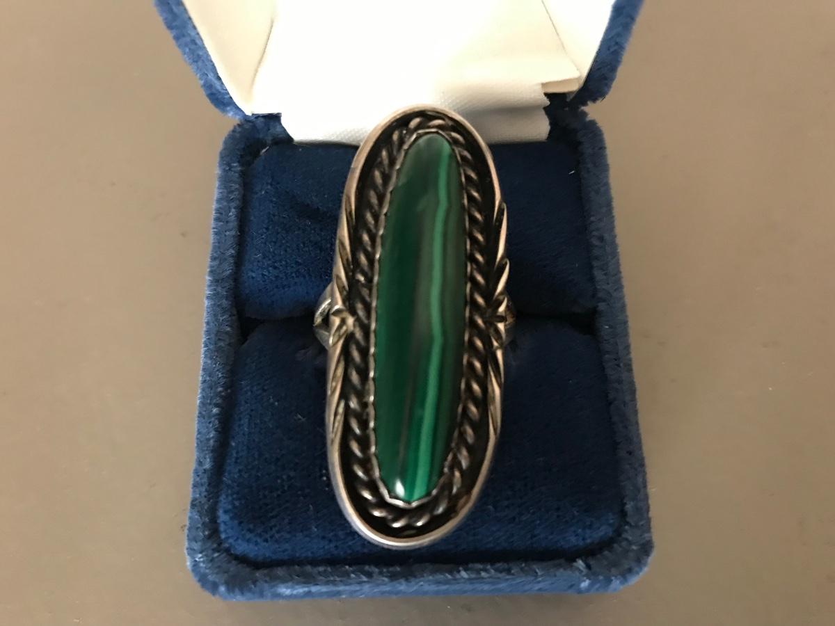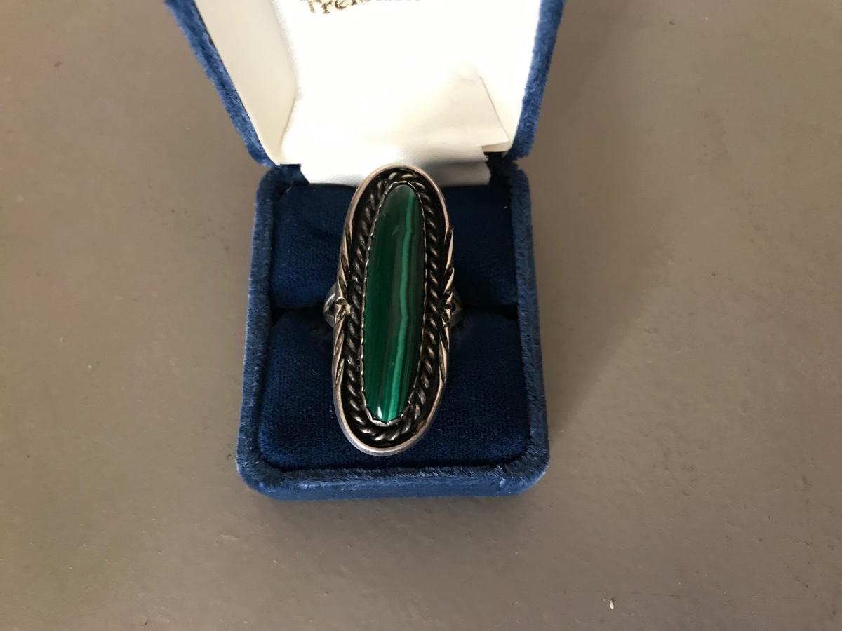 Big ring with beautiful piece of malachite set into it and signed , top quality ring