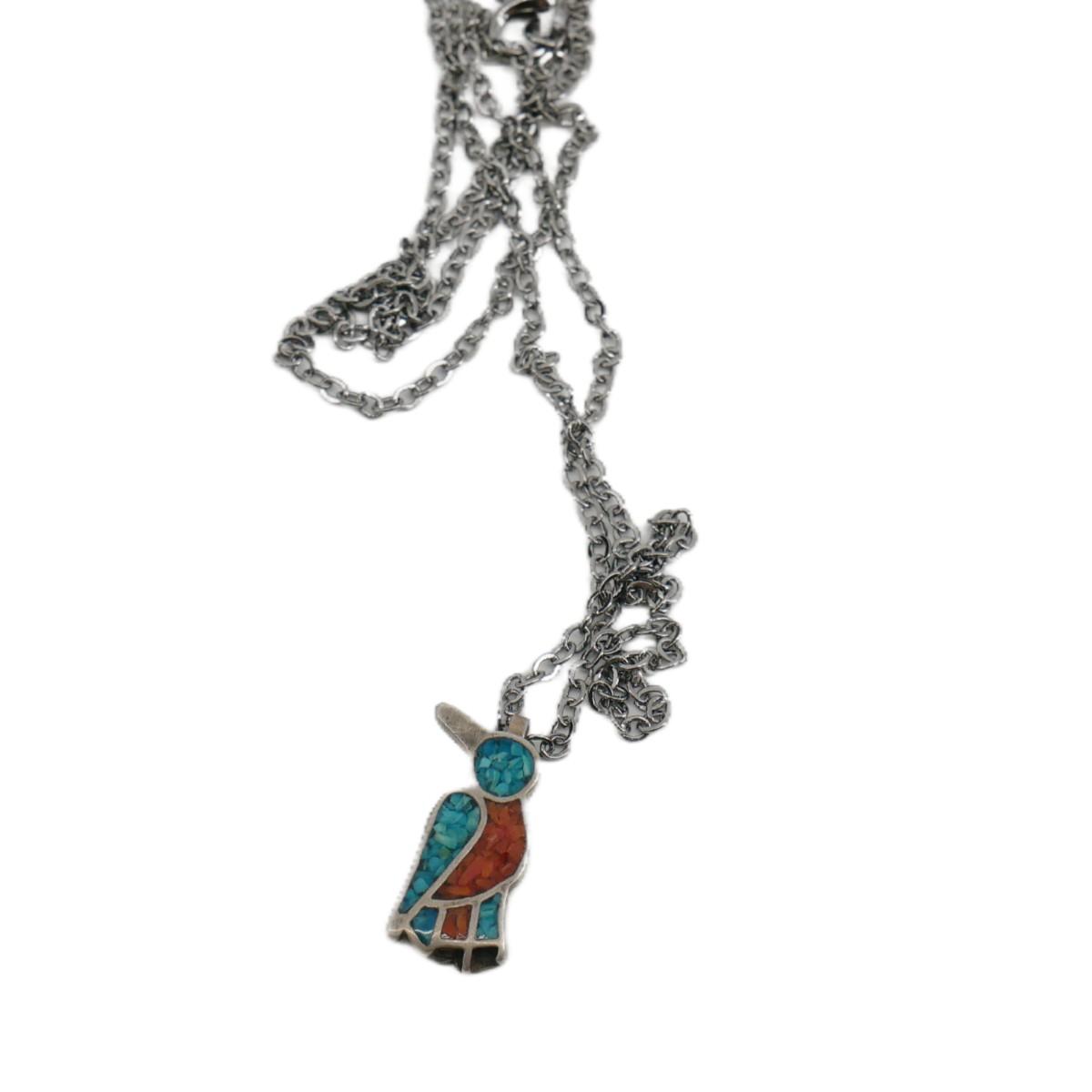 Native American Navajo Turquoise and Coral inlay bird pendant with modern necklace. Pendant is approximately 0.5" x 0.75" and chain necklace is 24". Total weight is 5g.