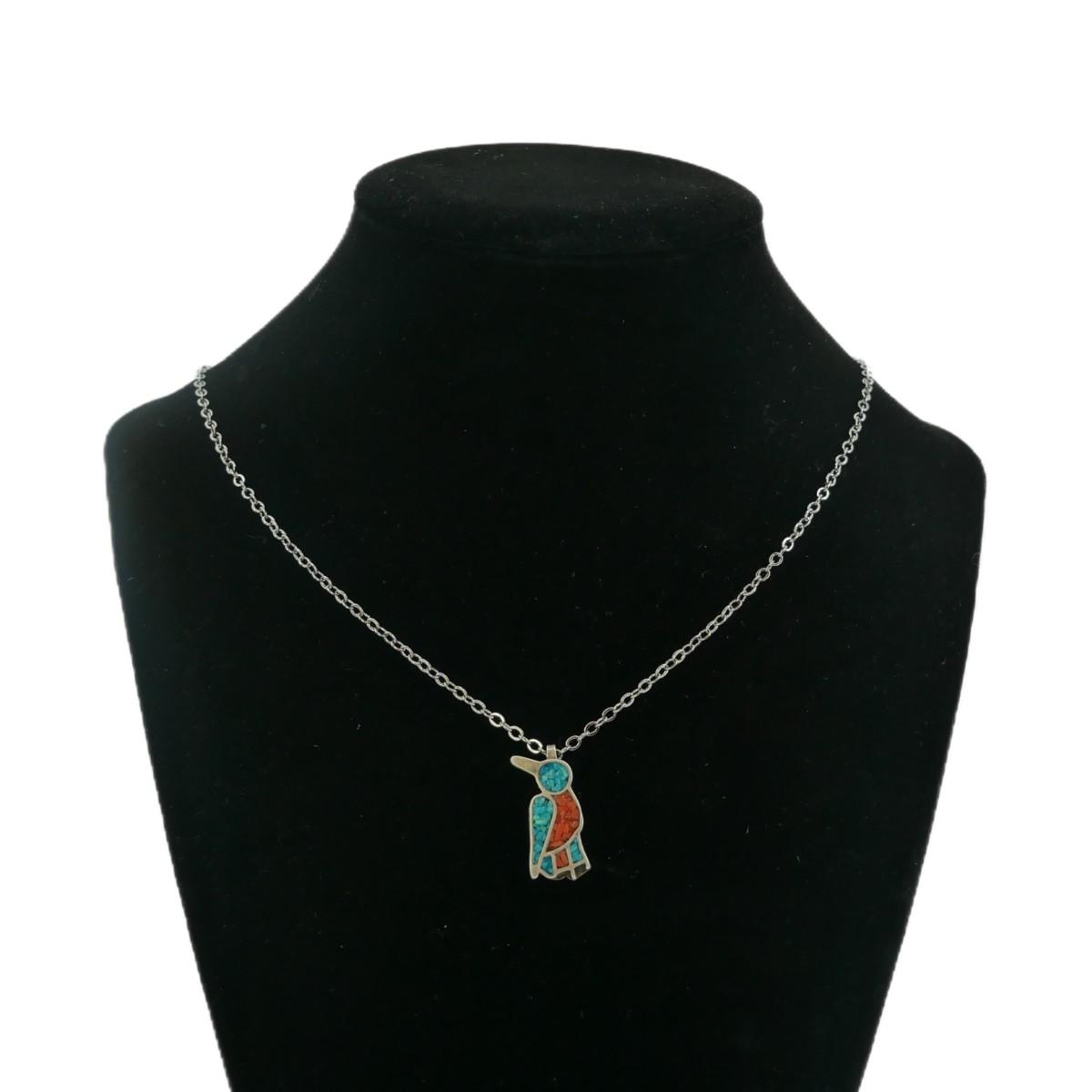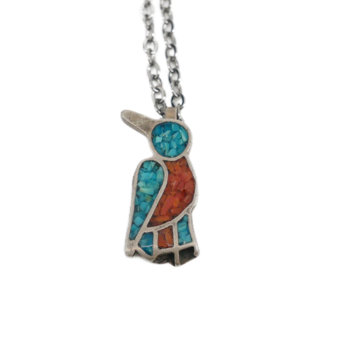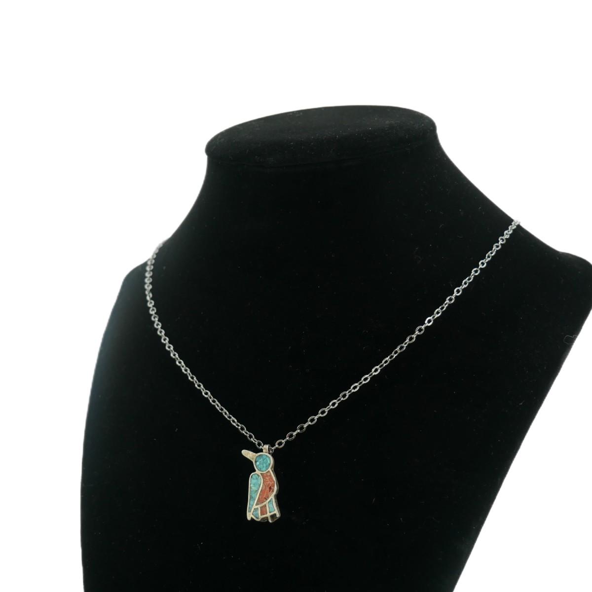 Native American Navajo Turquoise and Coral inlay bird pendant with modern necklace. Pendant is approximately 0.5" x 0.75" and chain necklace is 24". Total weight is 5g.