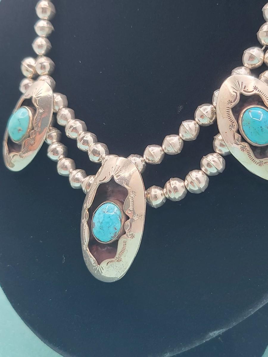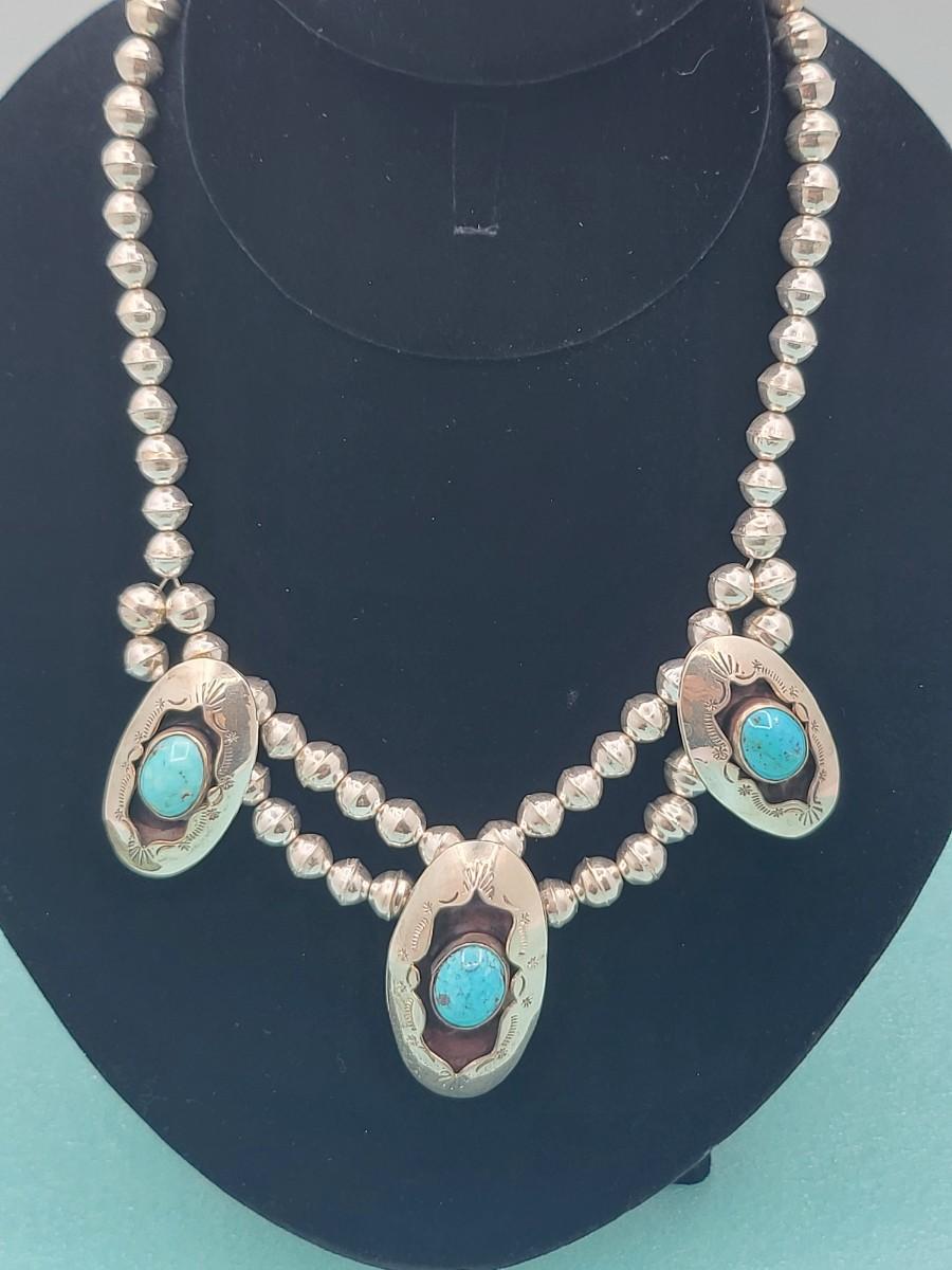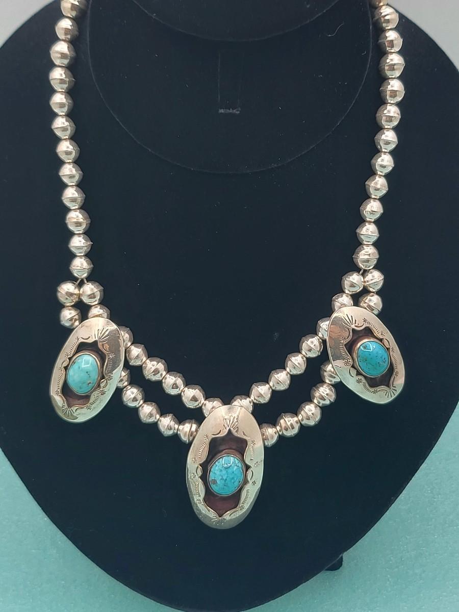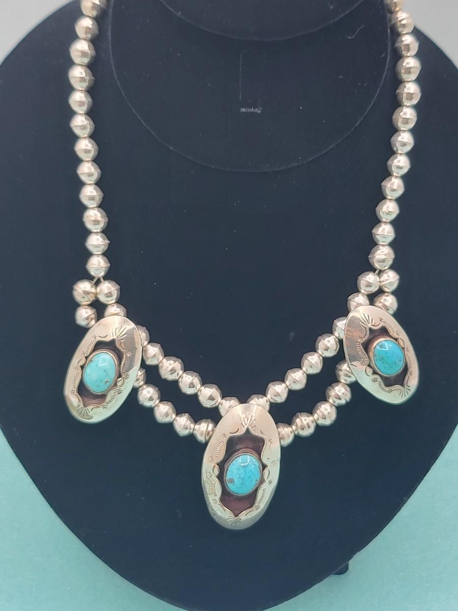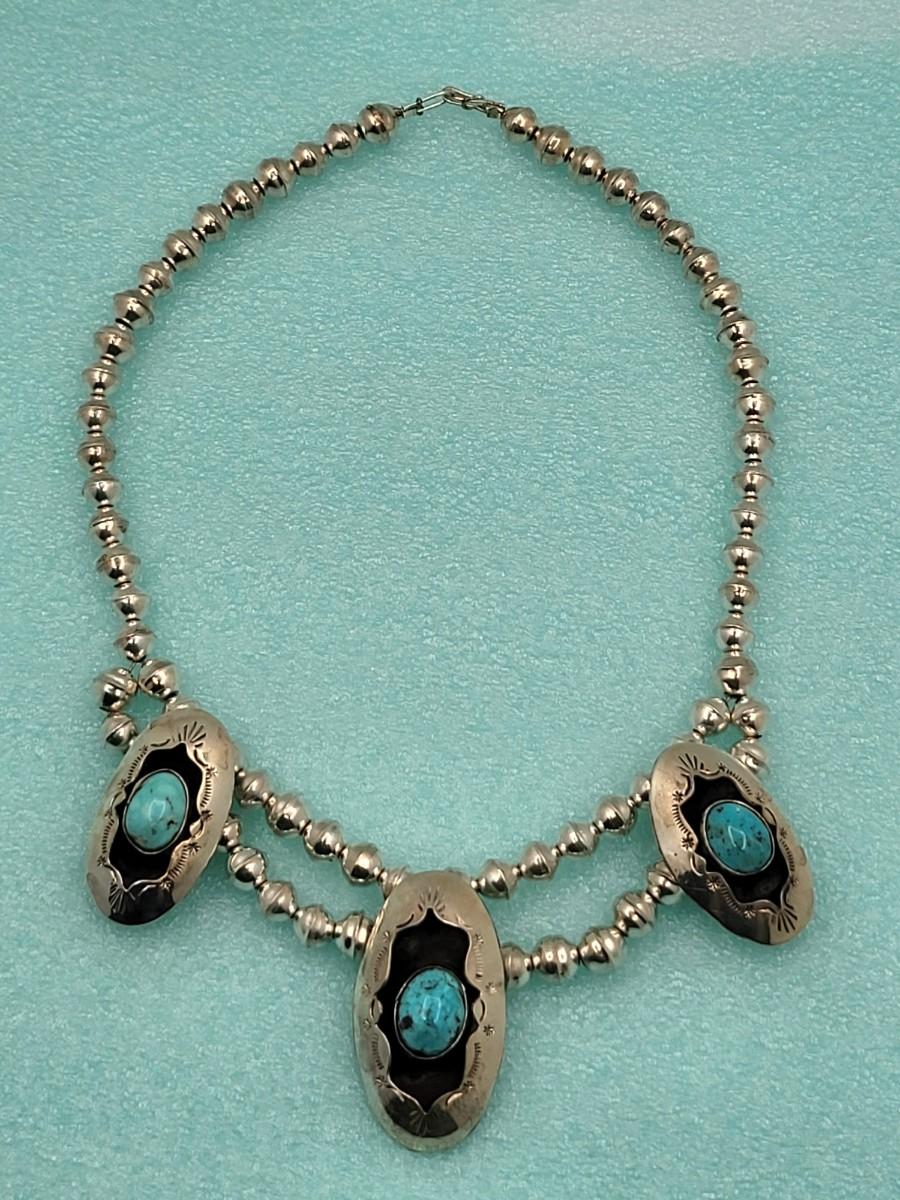 Lovely vintage Navajo find! Silver beads (4mm) and three oval etched 'shadowbox' medallions with turquoise stones is a beautifully hand made statement piece. Artist etched initial G signature on back. Unmarked but verified as sterling silver and genuine turquoise. Shepherds hook clasp. Necklace is 15" long. The center medallion is 2" long x 1" wide and the two medallions on either side are 1.5" long x .75" wide. Oval turquoise inserts have been hand polished and are solid in their setting. Total weight 55 grams.